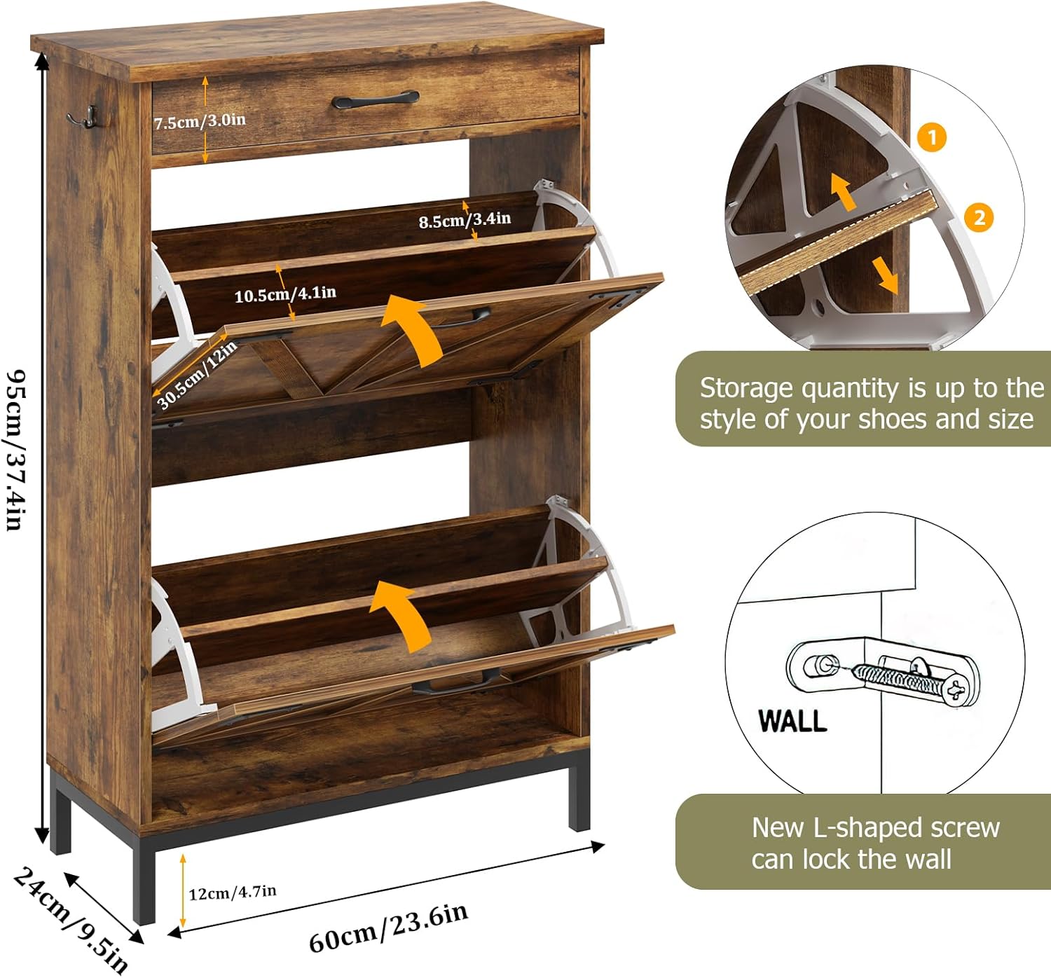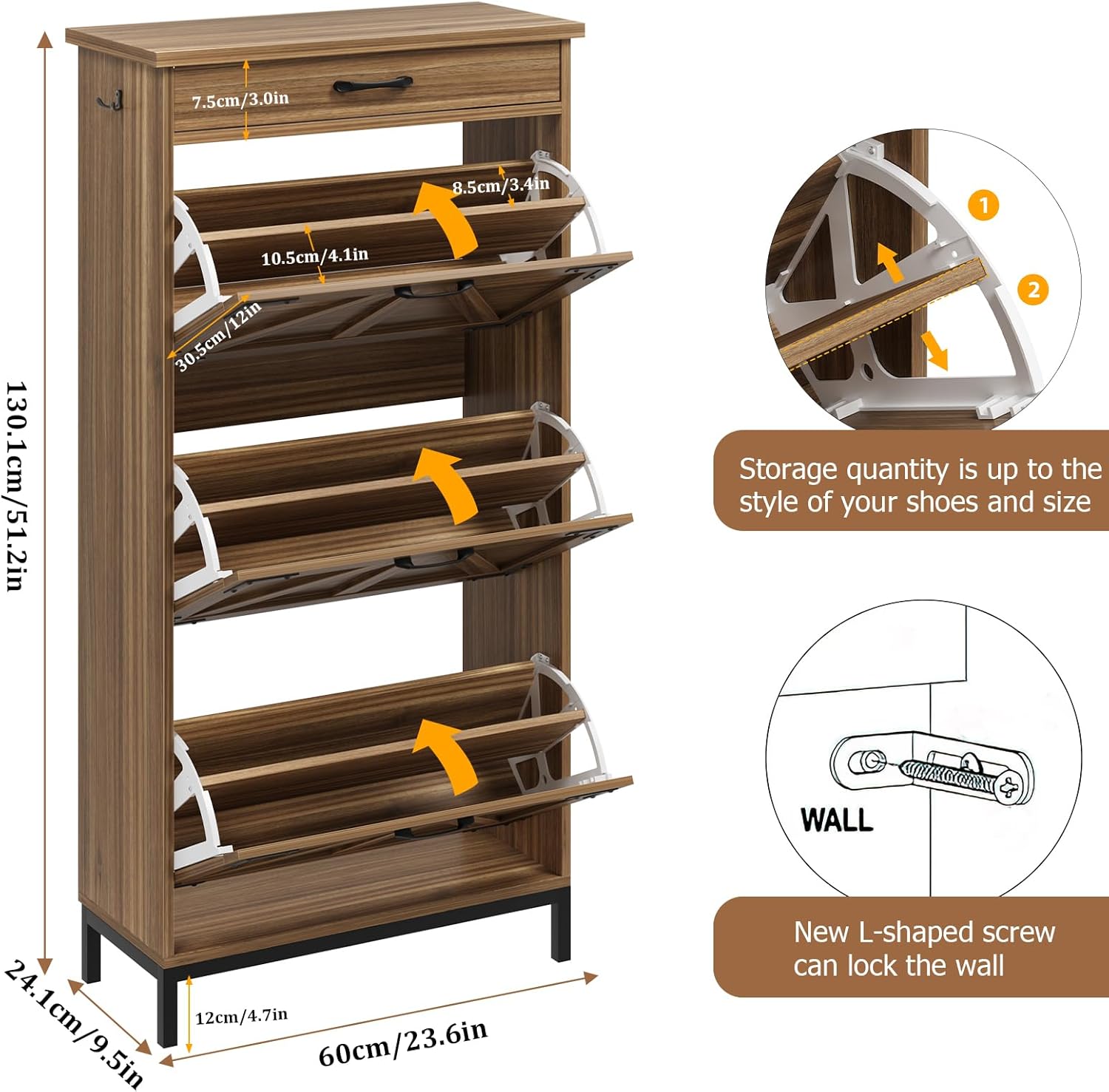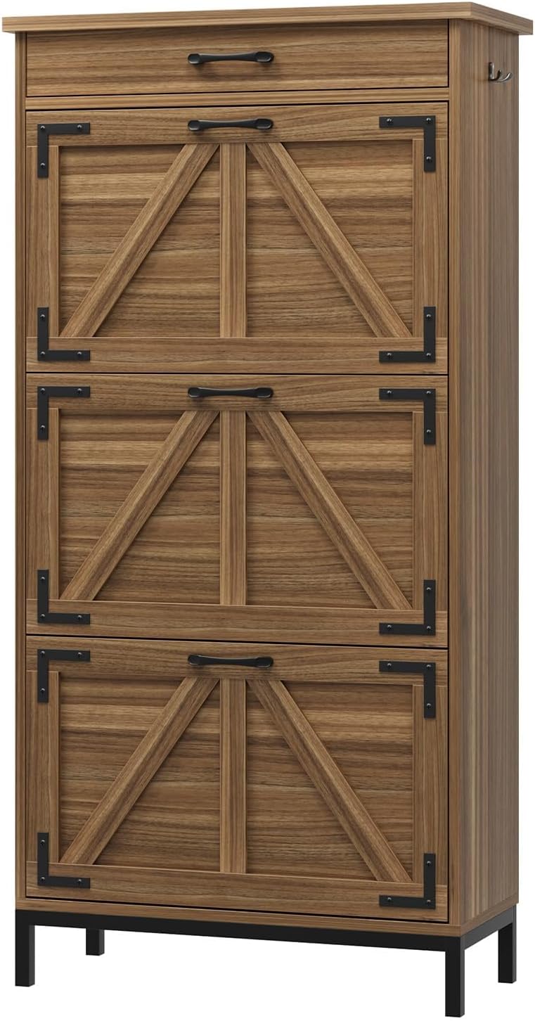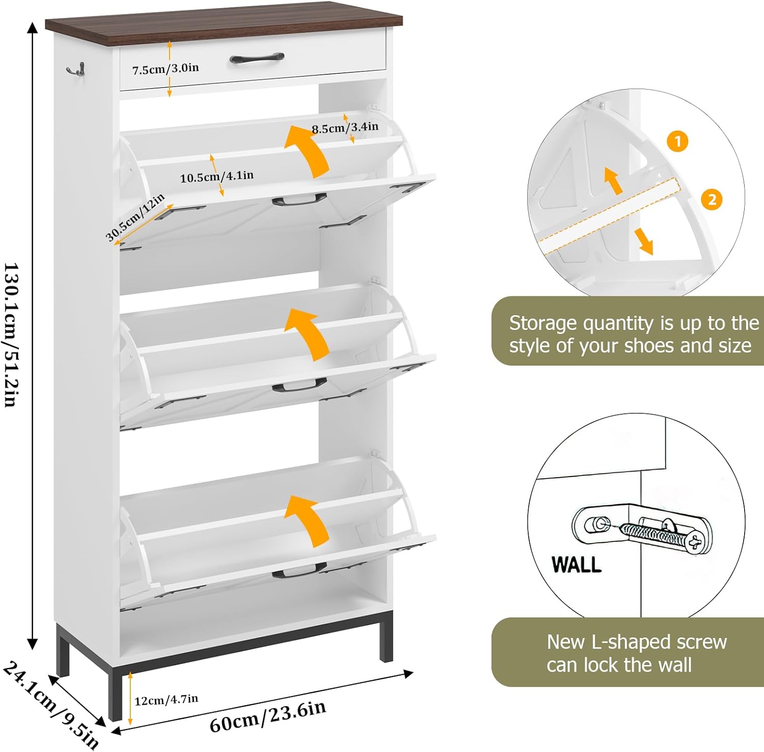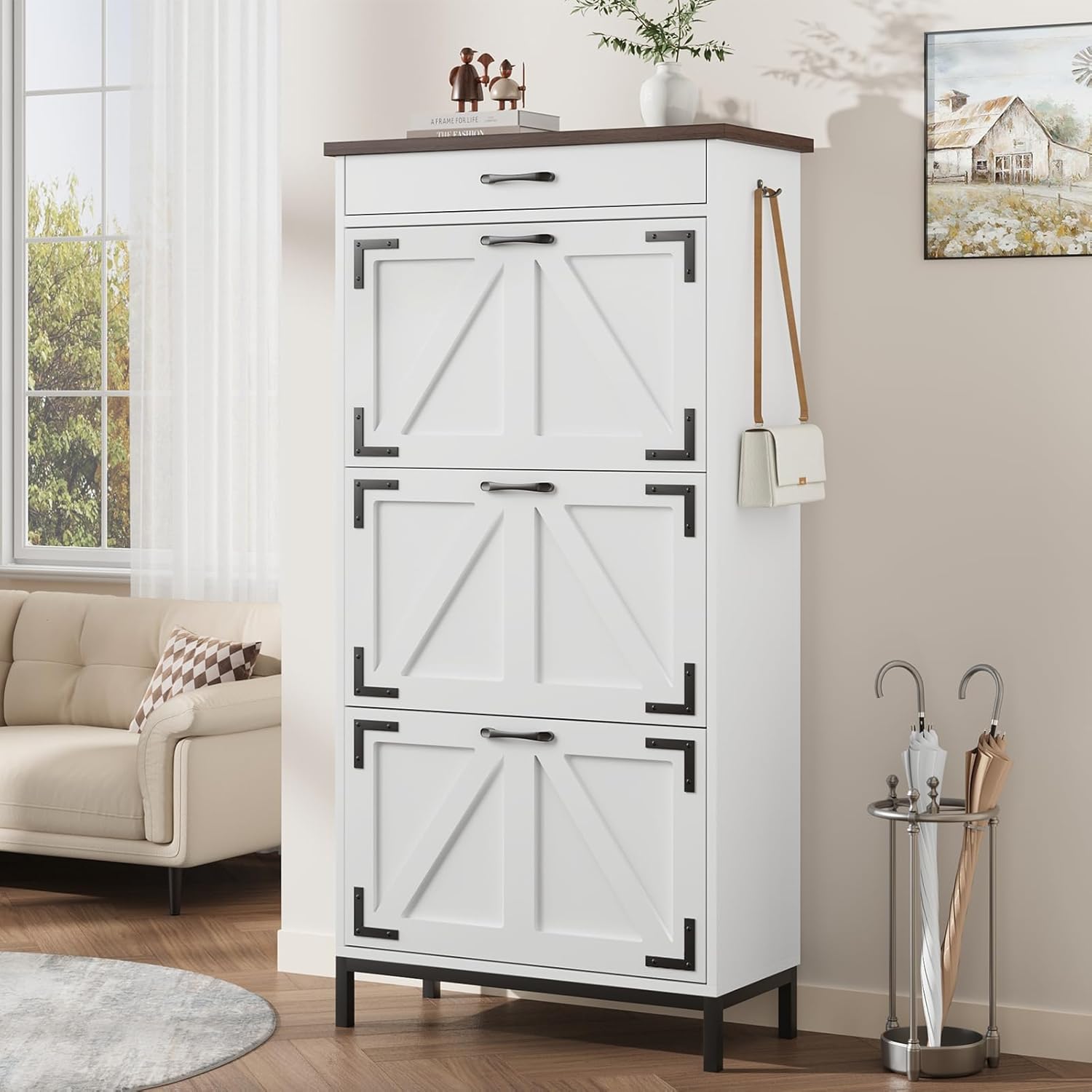 Shoe Storage Cabinet with 3 Flip Drawer, Farmhouse Narrow Shoe Cabinet with Metal Legs and Pull Out Drawer, 57.1'' H Freestanding Hidden Shoes Storage Organizer for Entryway, Hallway