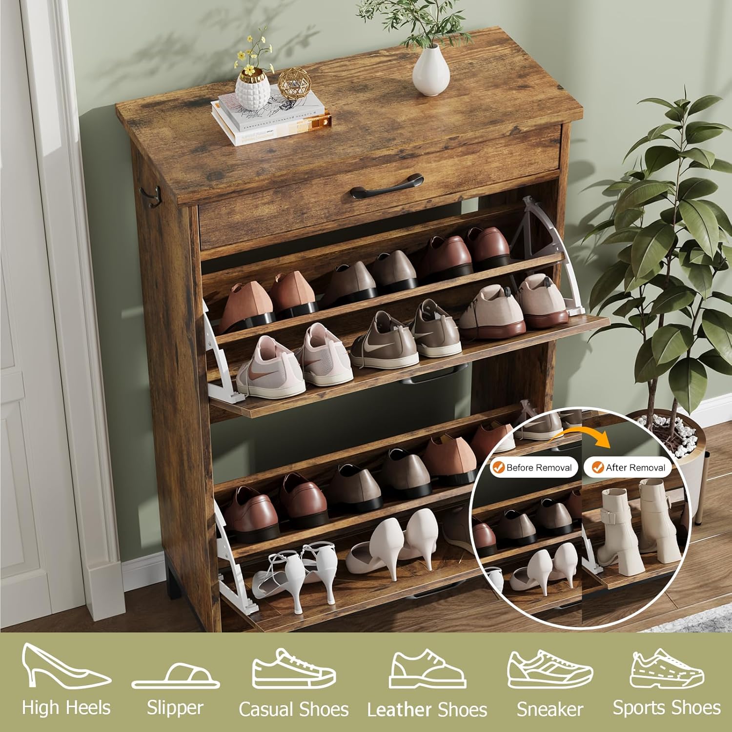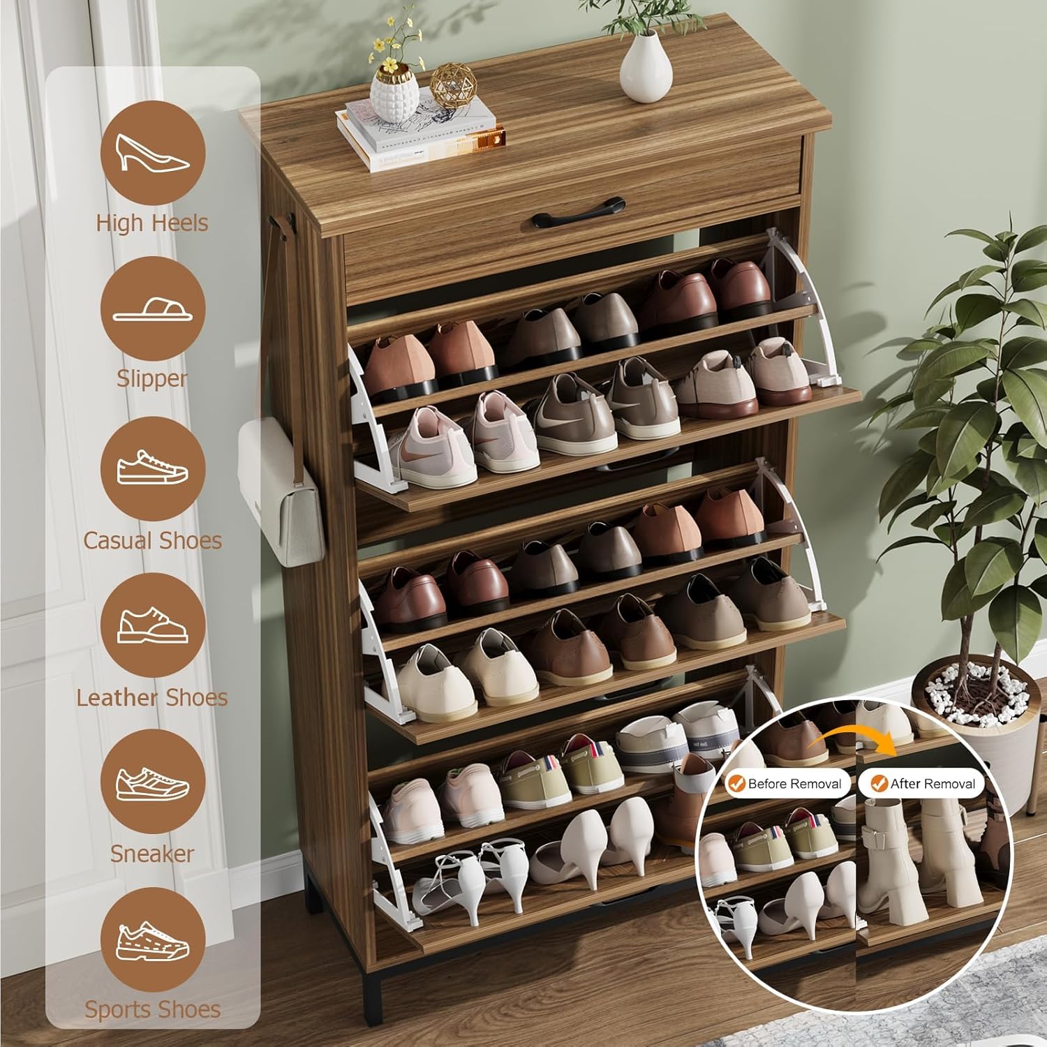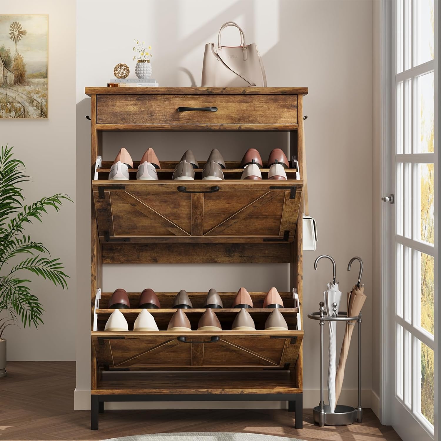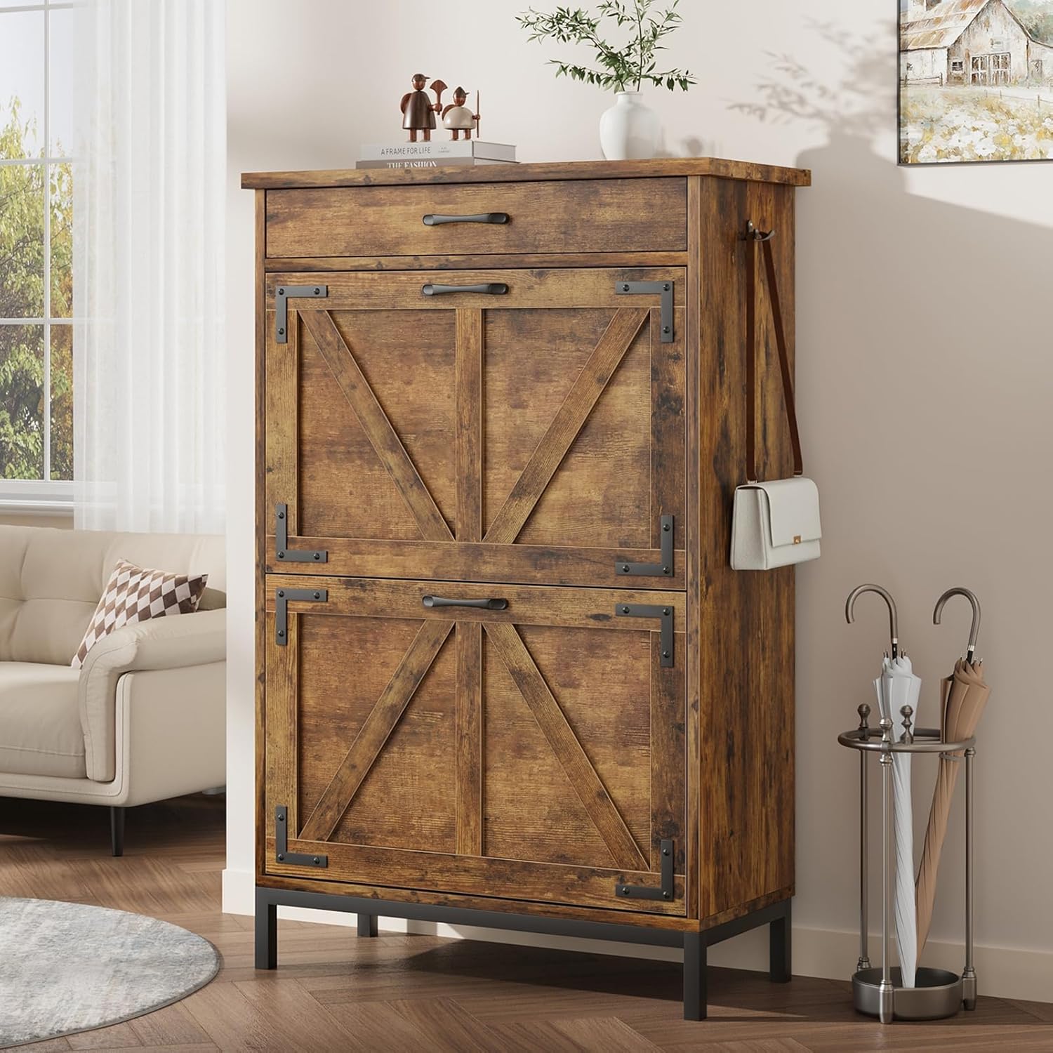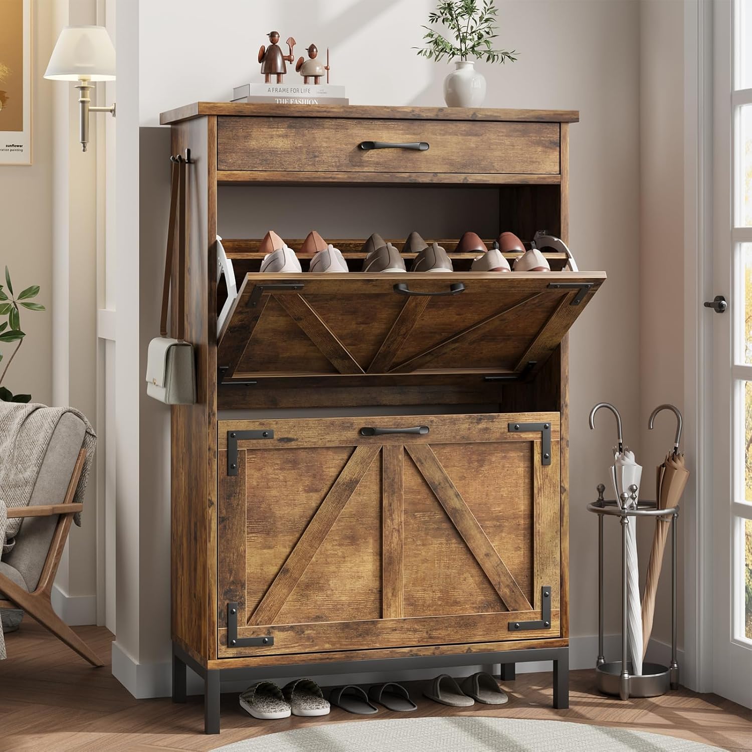 Shoe Storage Cabinet with 3 Flip Drawer, Farmhouse Narrow Shoe Cabinet with Metal Legs and Pull Out Drawer, 57.1'' H Freestanding Hidden Shoes Storage Organizer for Entryway, Hallway