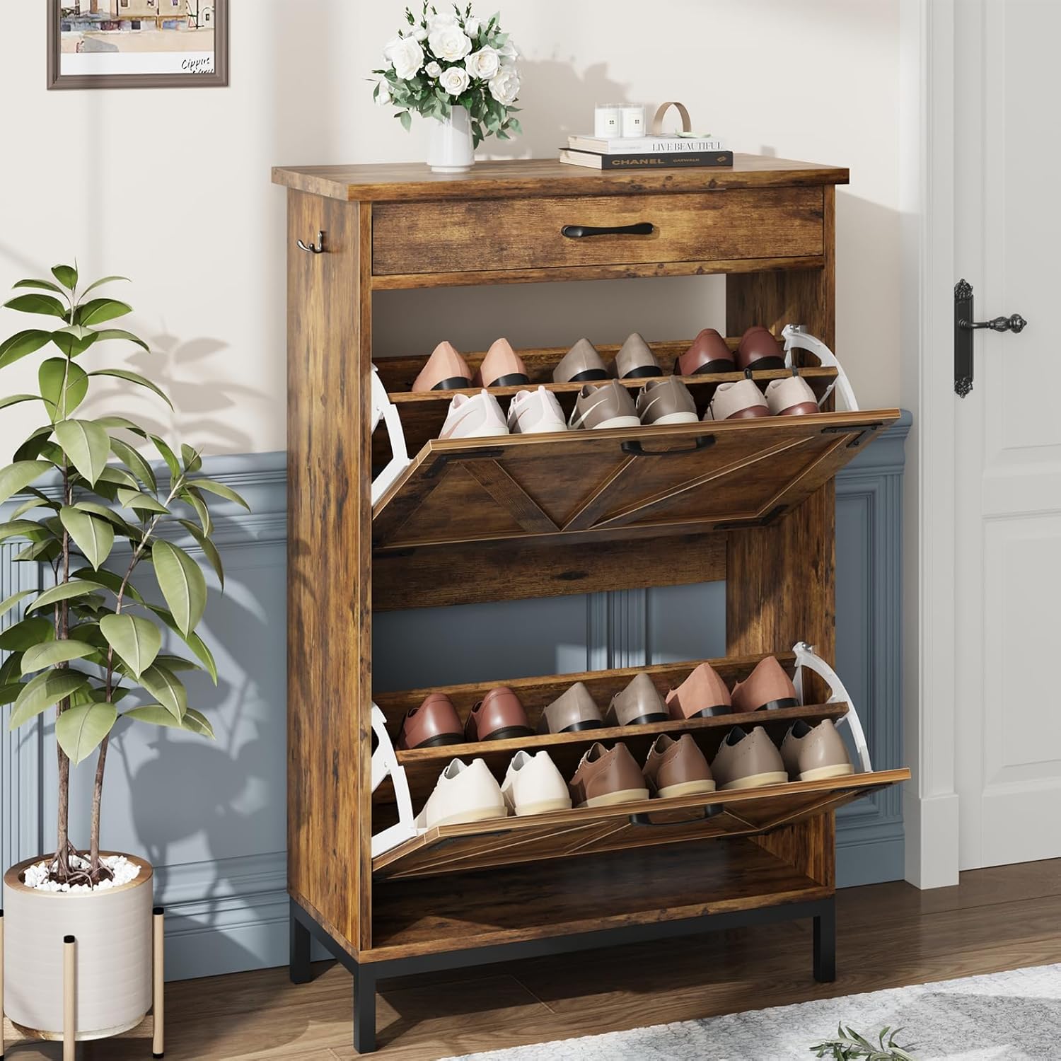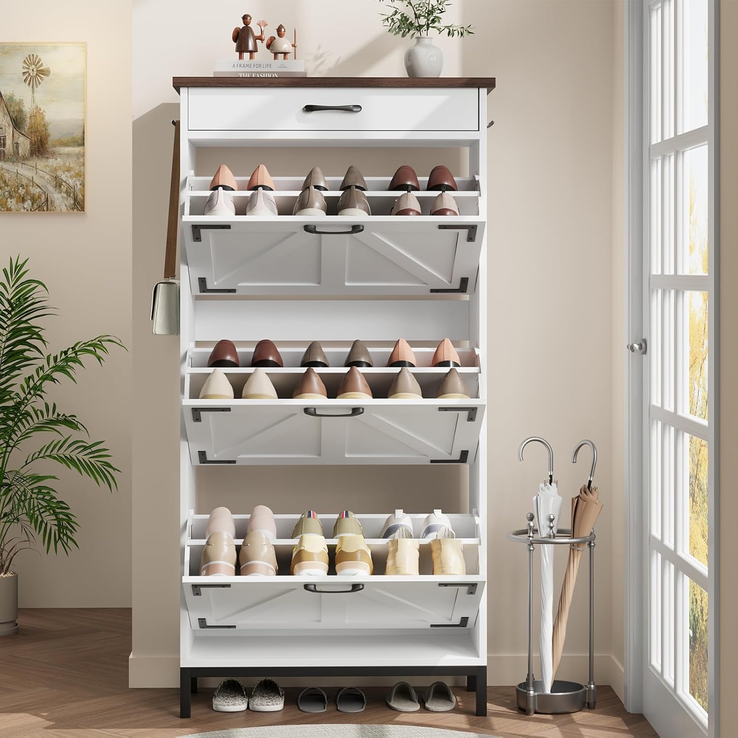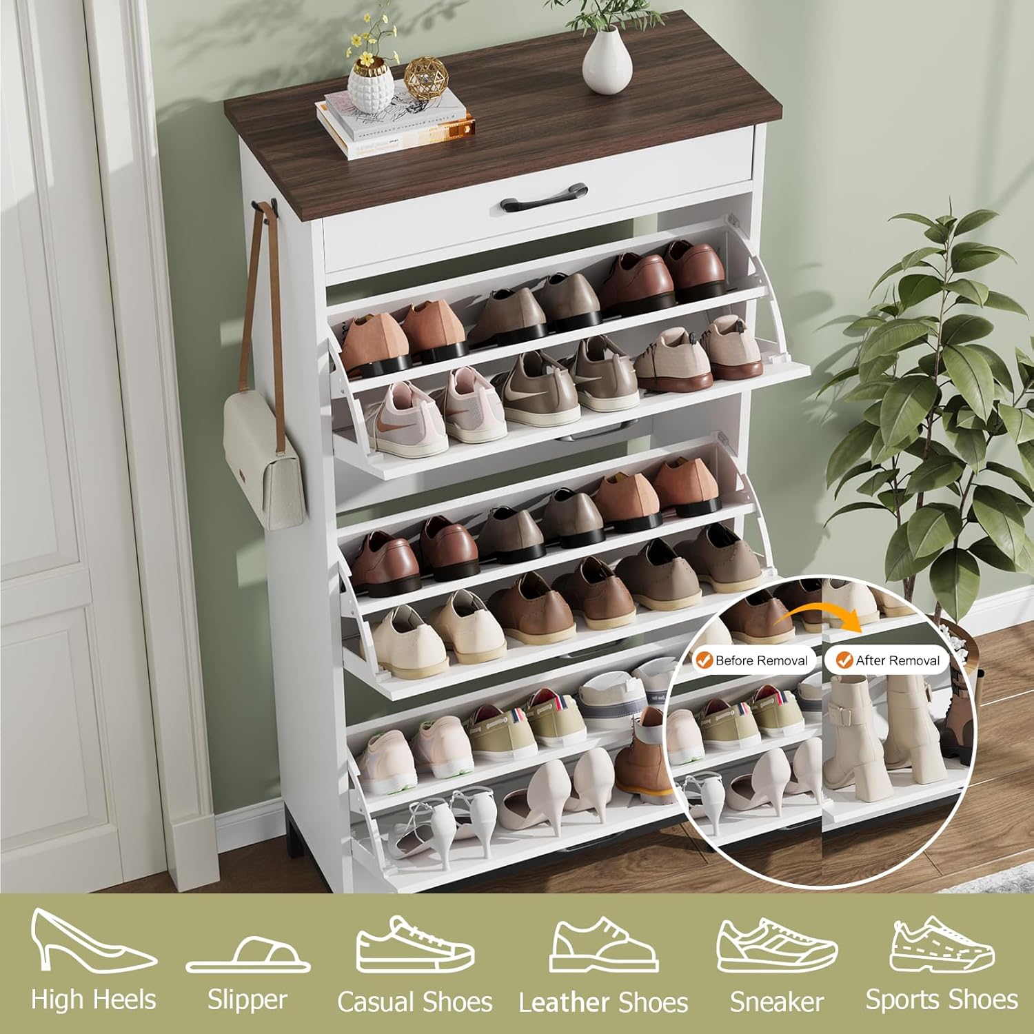 GarveeHome Shoe Cabinet for Entryway with 2 Flip Drawers,Tall Narrow Shoe Storage Cabinet, Freestanding Shoe Organizer Rack for Front Door Entrance, White