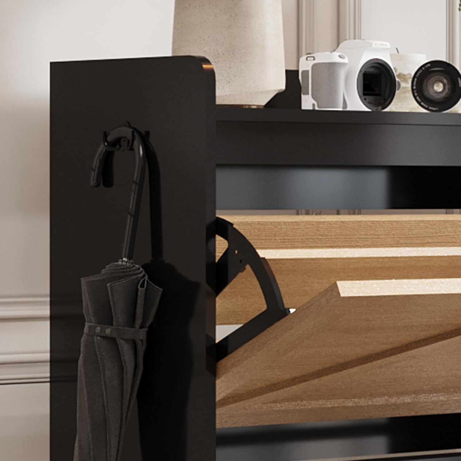IDEALHOUSE Modern Natural Shoe Cabinet with 3 Flip Drawers & 2 Small Drawers & Hook, Slim Fluted Shoe Storage Organizer, Narrow Entryway Cabinet for Apartment, Hallway, Entrance ((White Color))