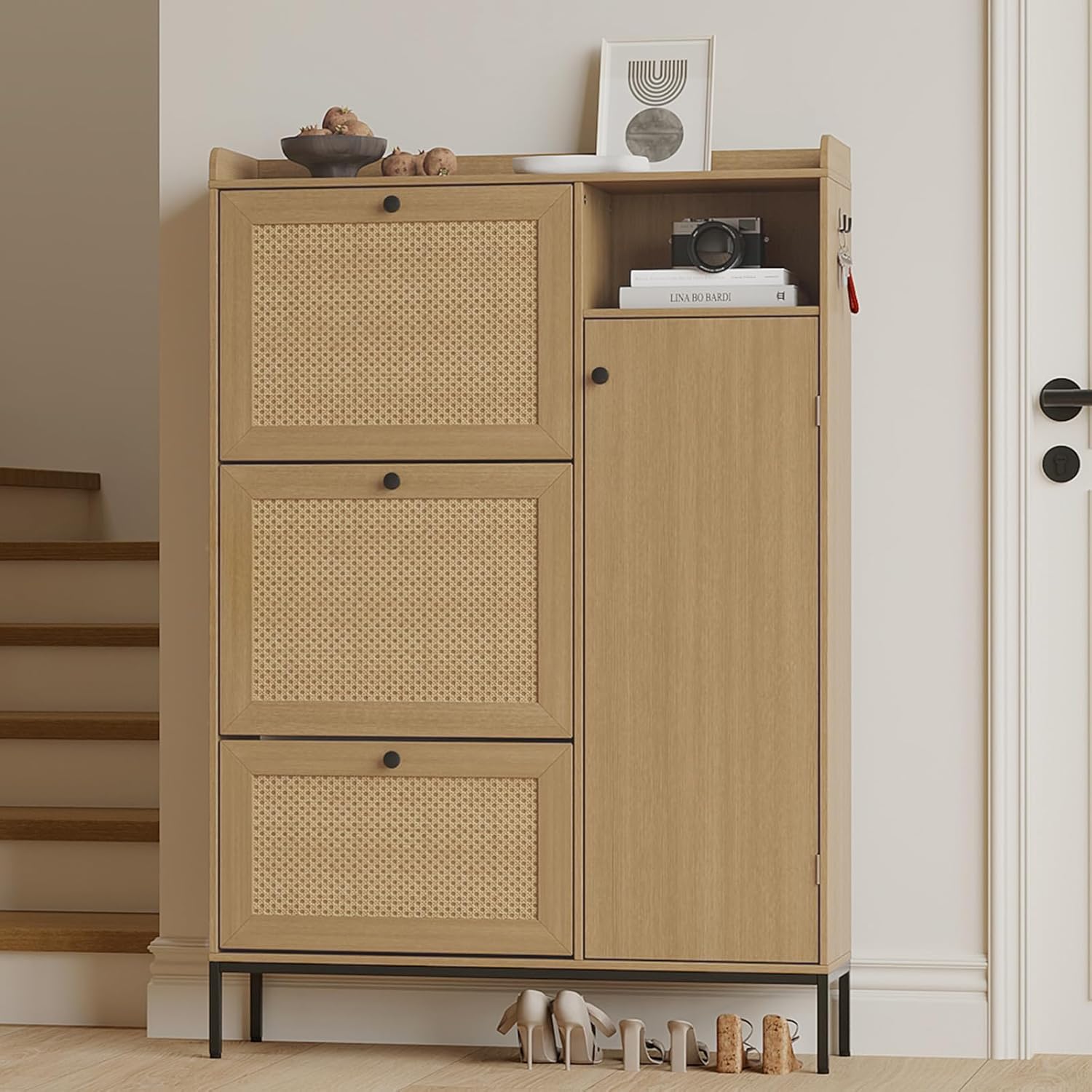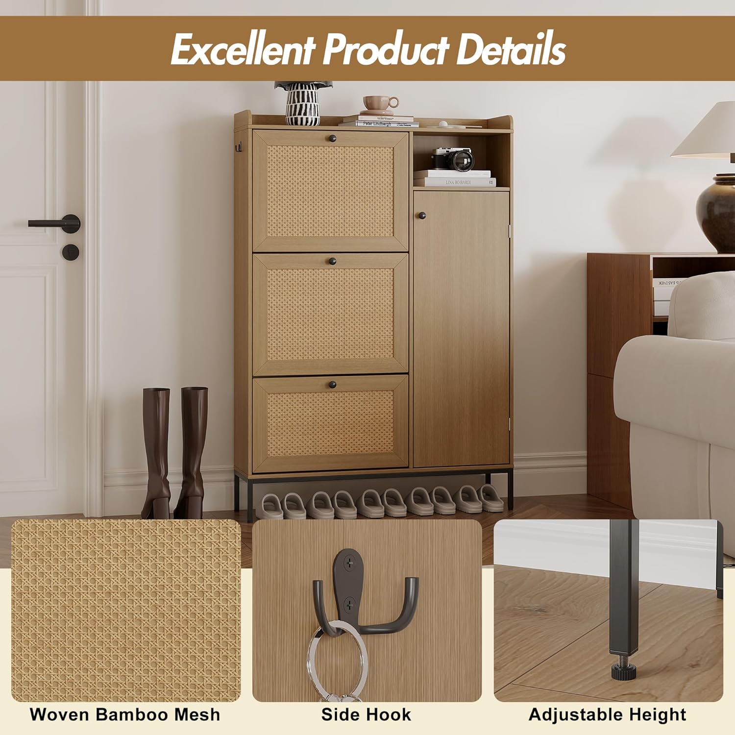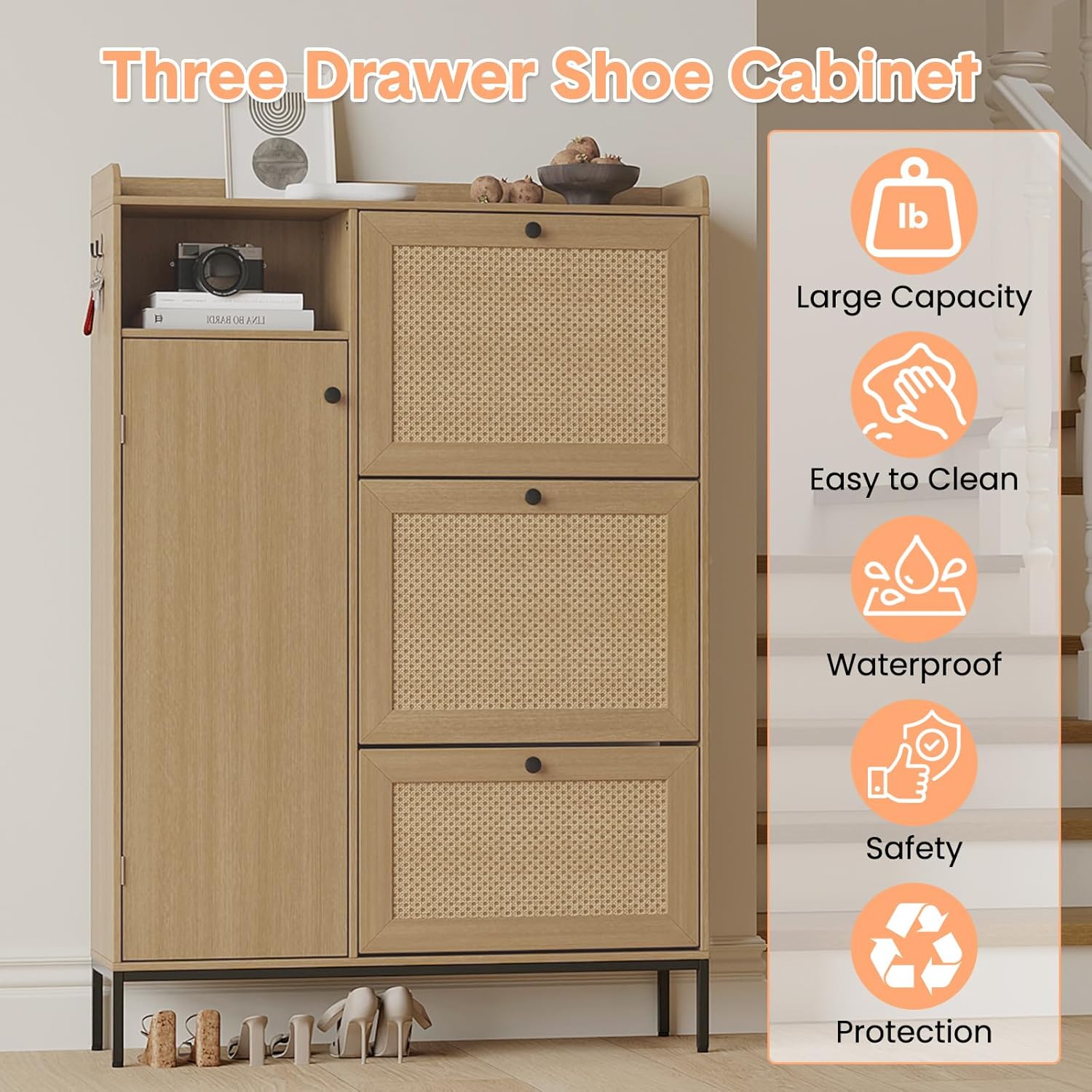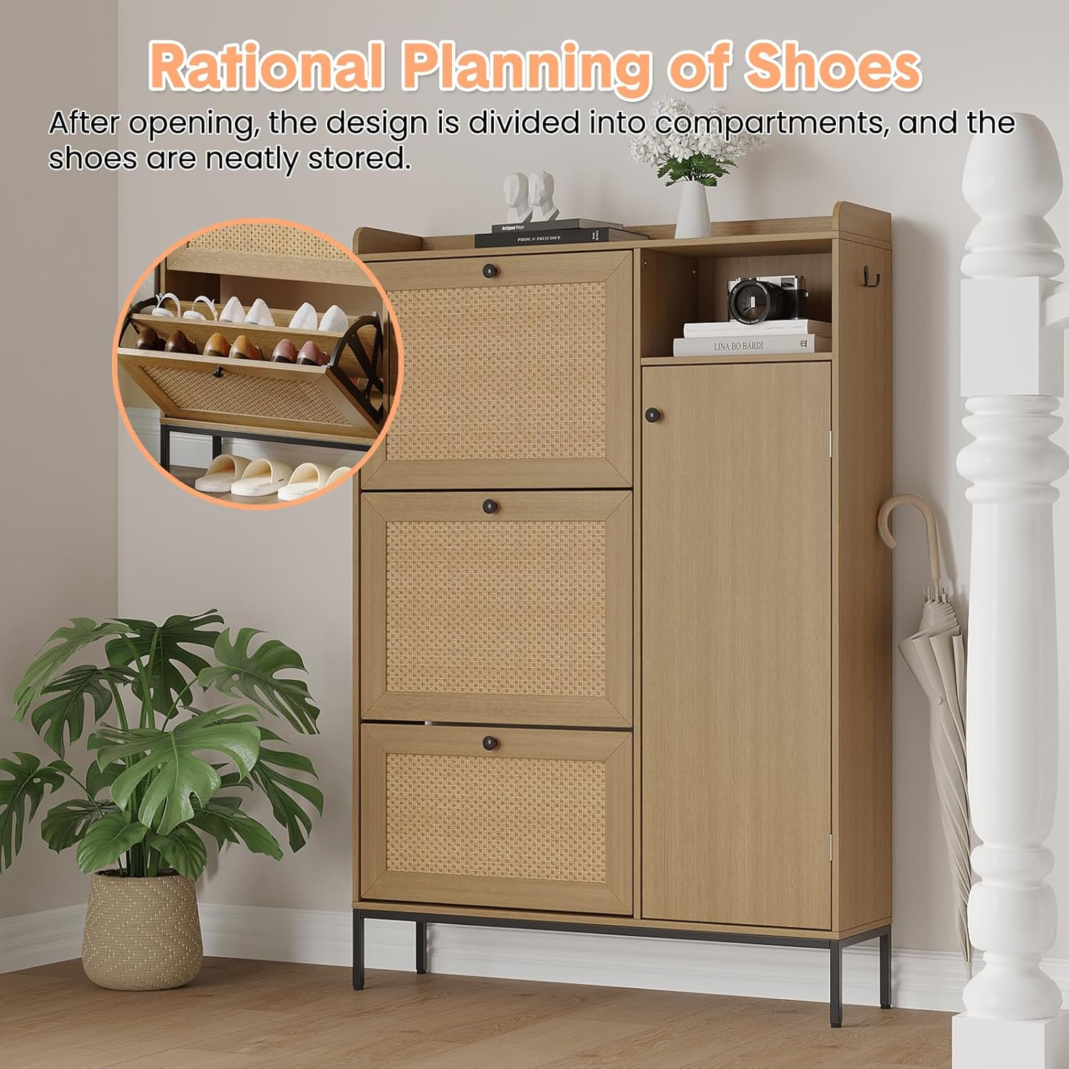 3 Tier Shoe Cabinet, Rattan Shoe Organizer with Flip Drawers, Adjustable Shelves and Top Grate, Narrow Free Standing Wood Shoe Storage Cabinet for Entryway, Hallway, Bedroom