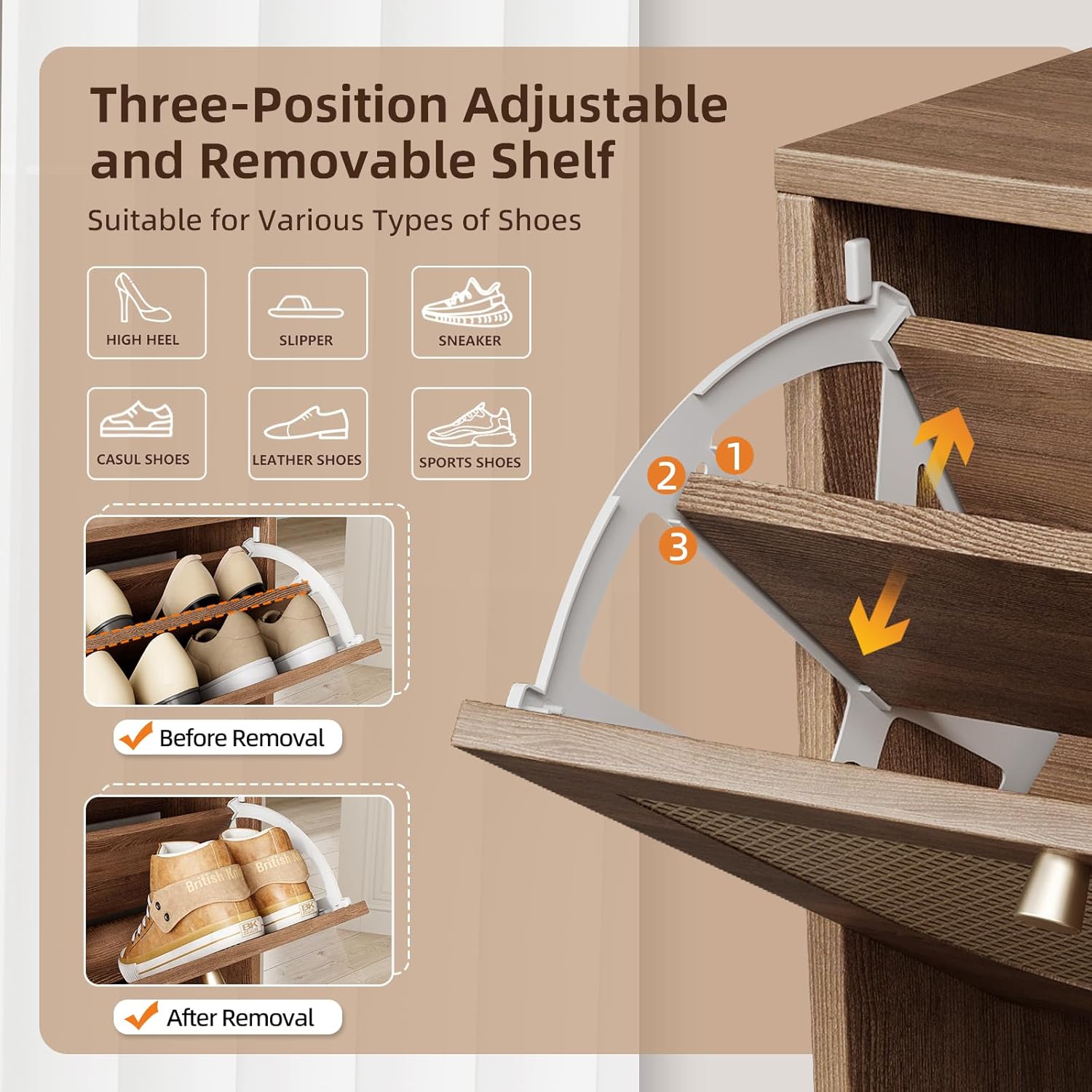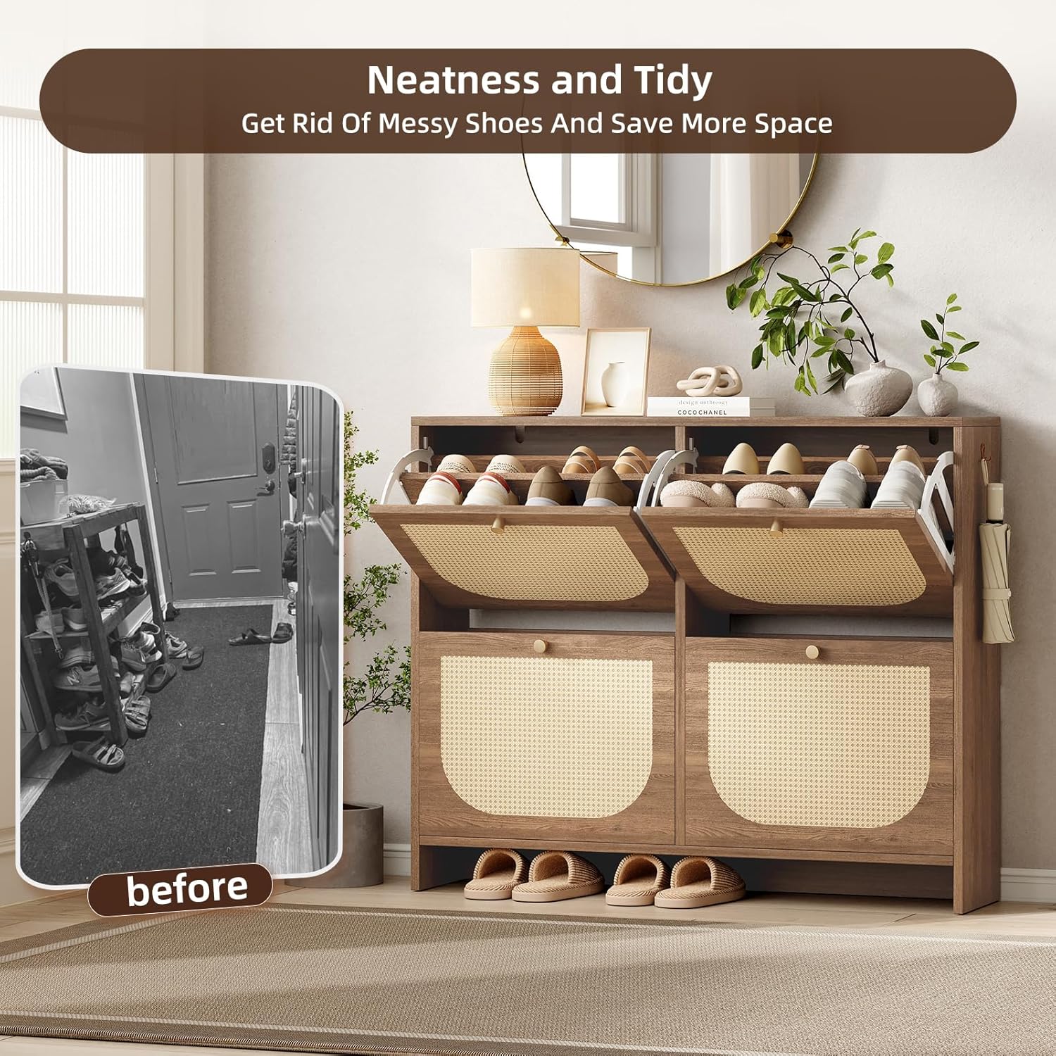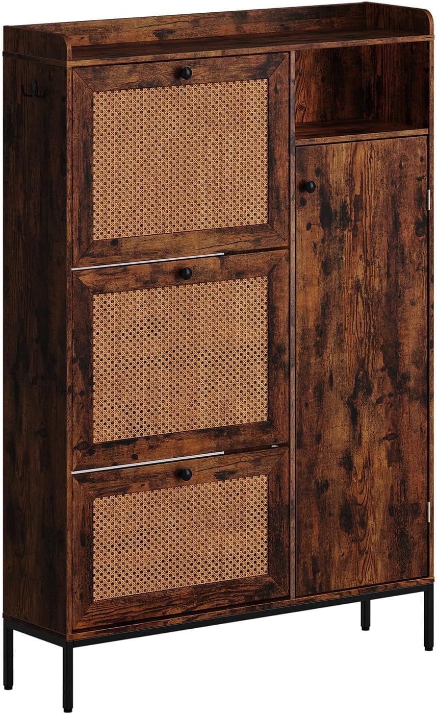3 Tier Shoe Cabinet, Rattan Shoe Organizer with Flip Drawers, Adjustable Shelves and Top Grate, Narrow Free Standing Wood Shoe Storage Cabinet for Entryway, Hallway, Bedroom