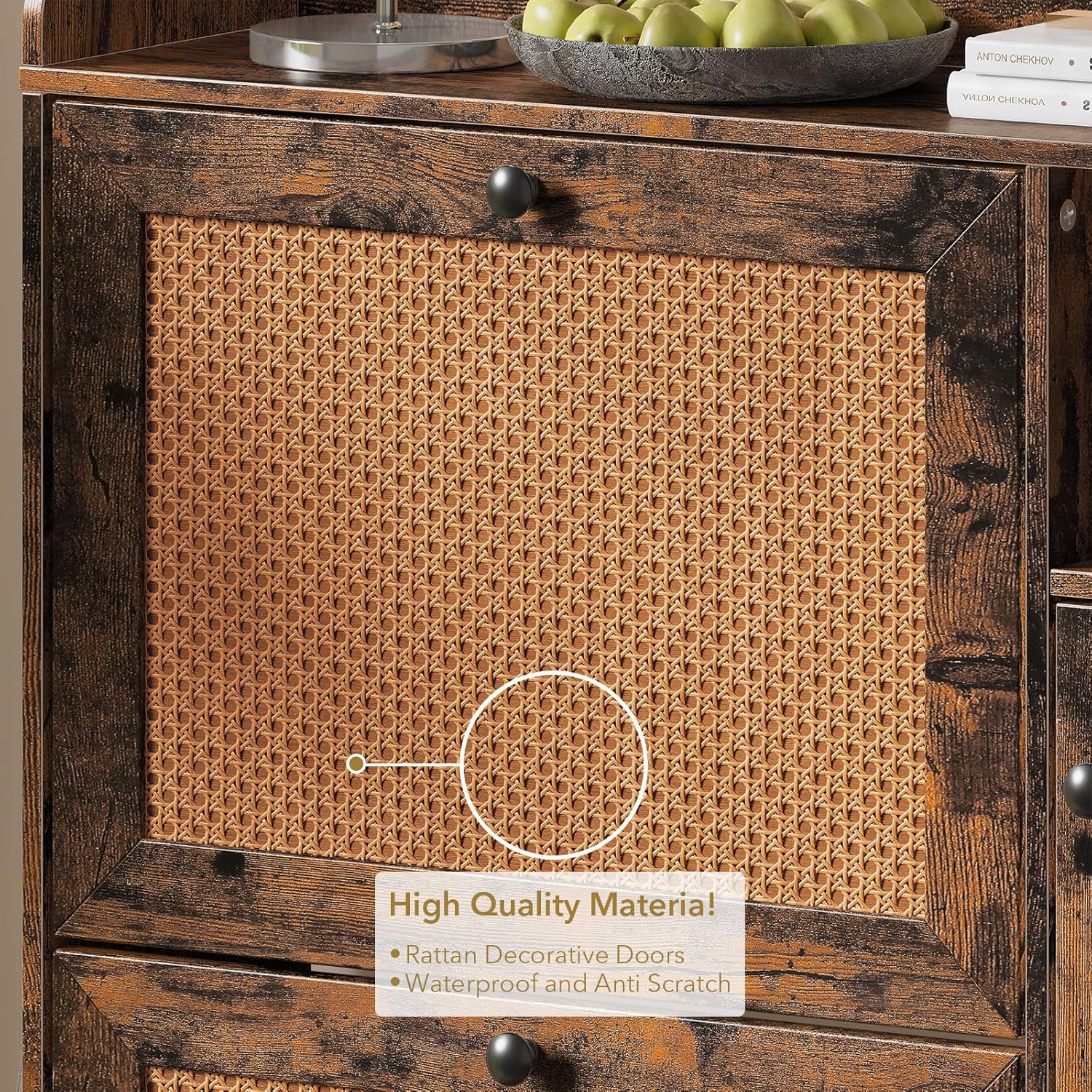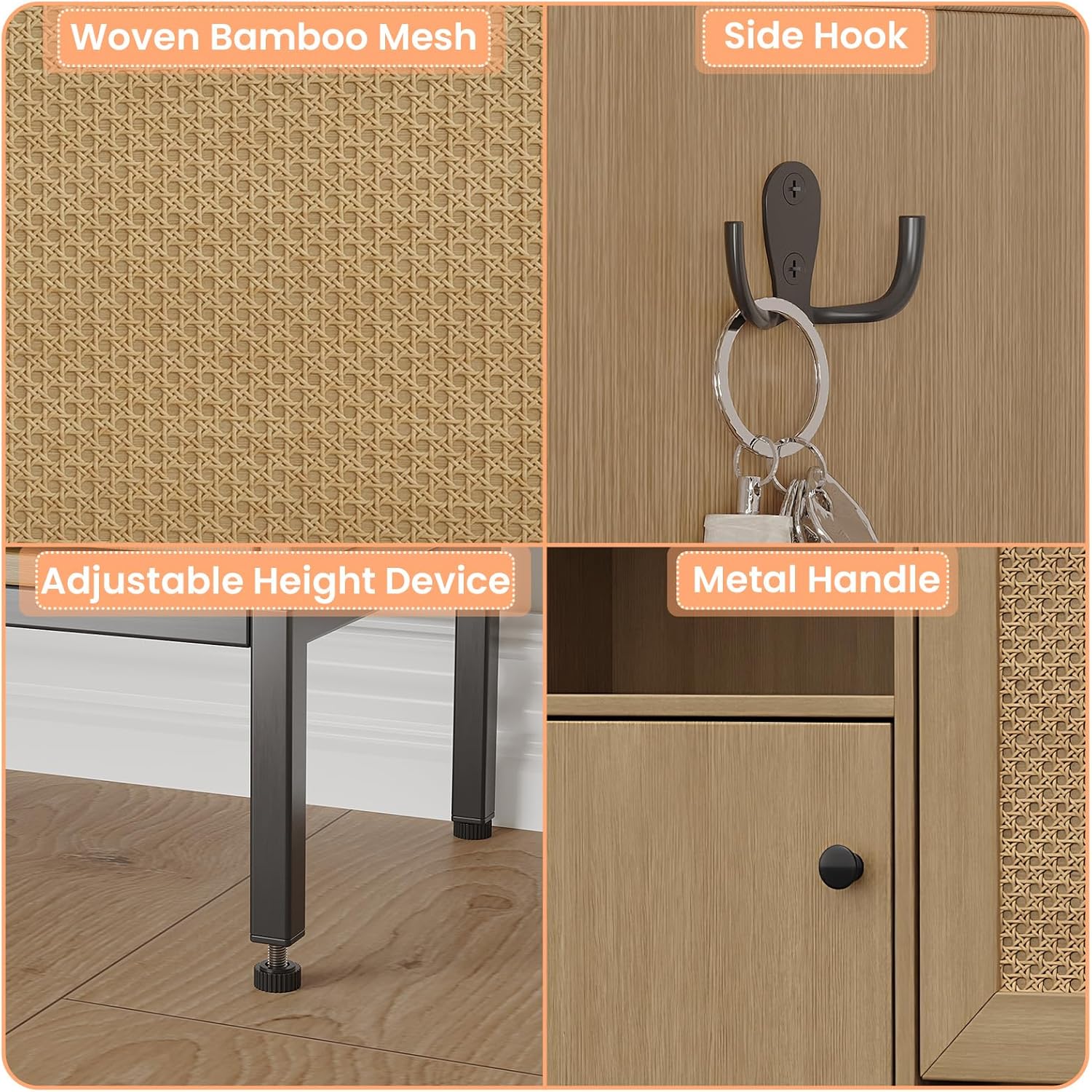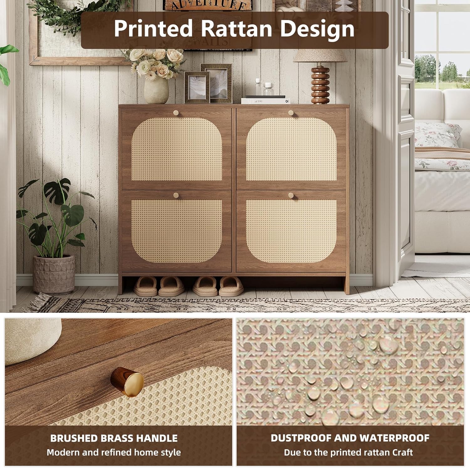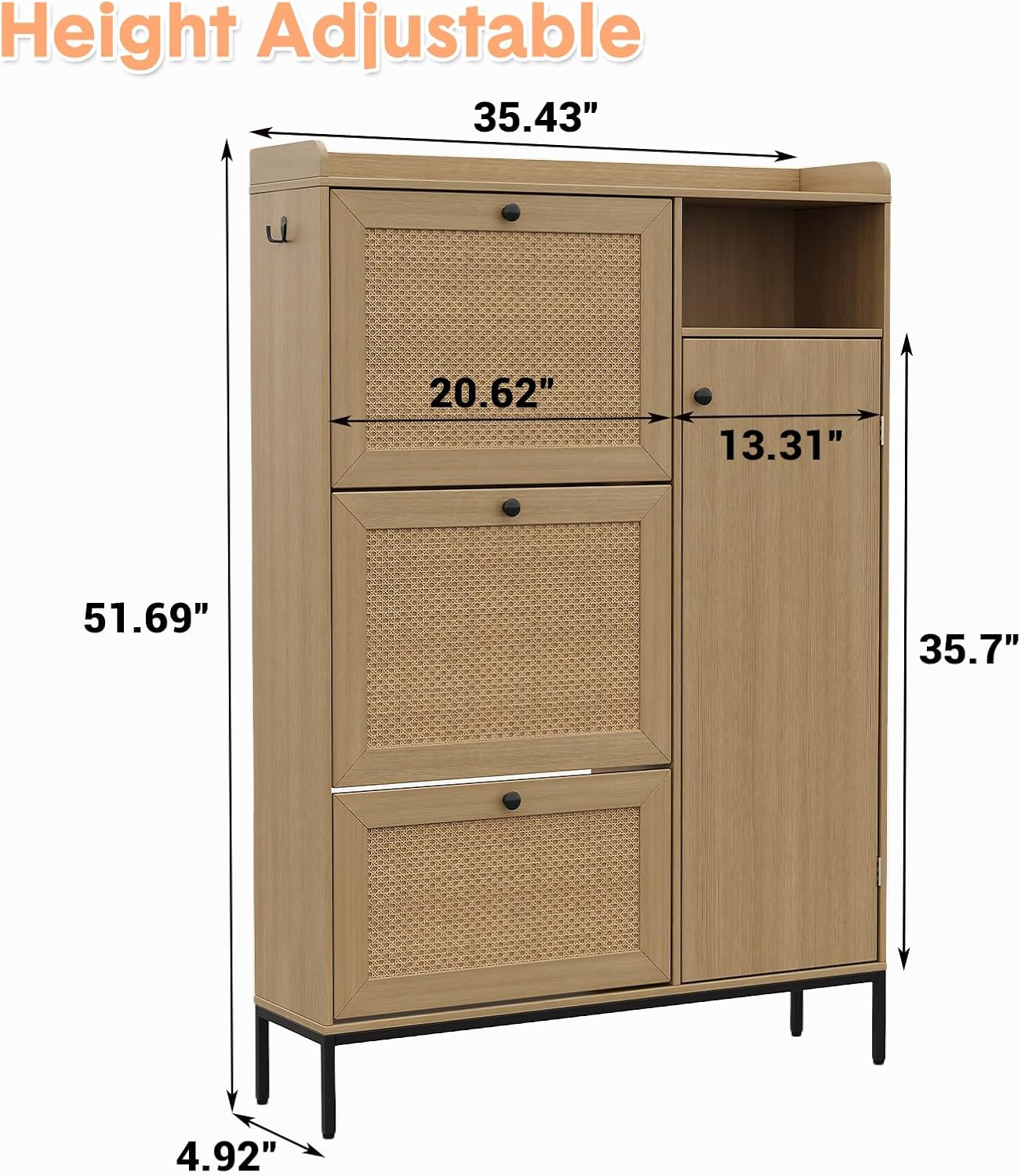 3 Tier Shoe Cabinet, Rattan Shoe Organizer with Flip Drawers, Adjustable Shelves and Top Grate, Narrow Free Standing Wood Shoe Storage Cabinet for Entryway, Hallway, Bedroom