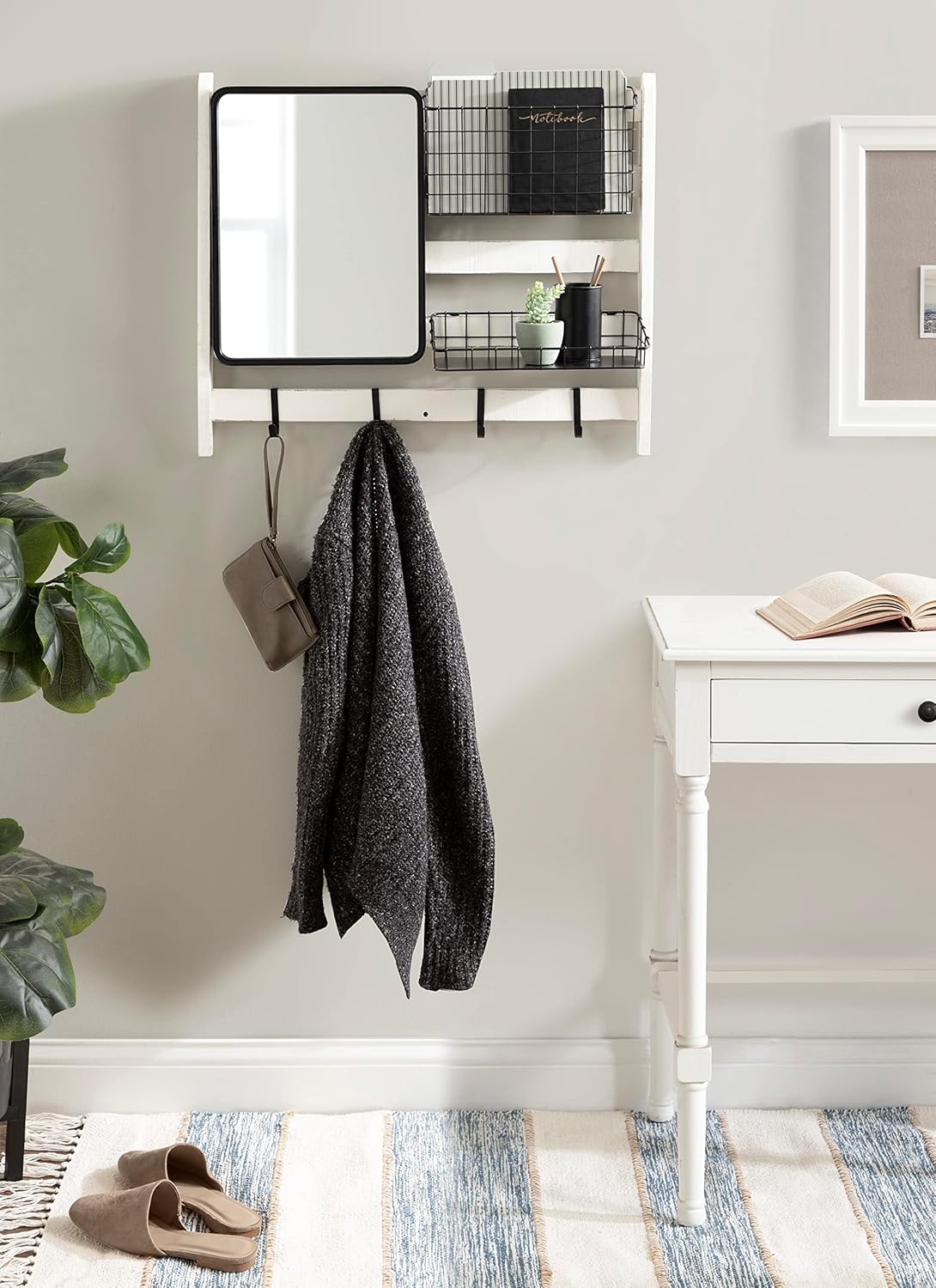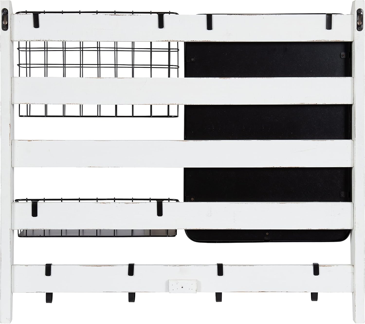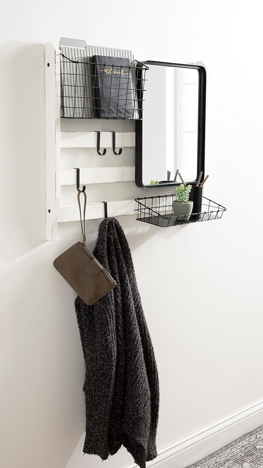Kate and Laurel Tanner Wall Organizer with Mirror and Hooks, 28 x 8 x 24, White and Black, Farmhouse Wall Organization Home Office Station with Baskets for Modular Storage