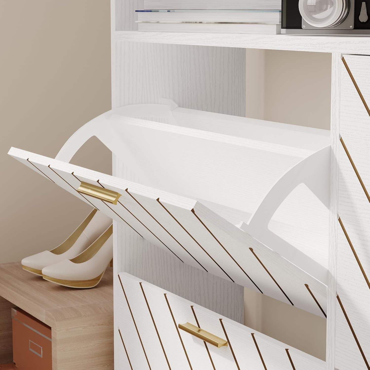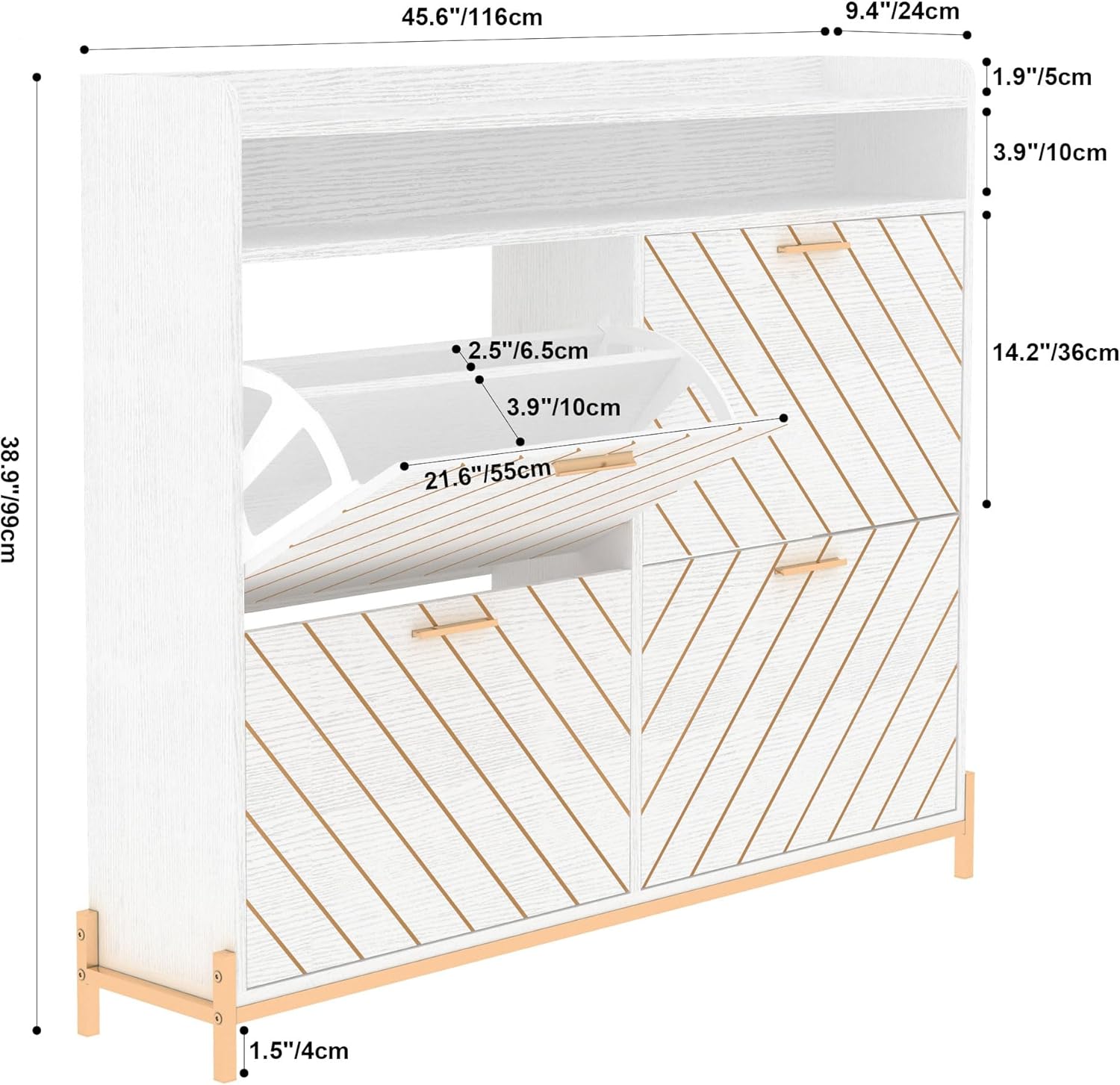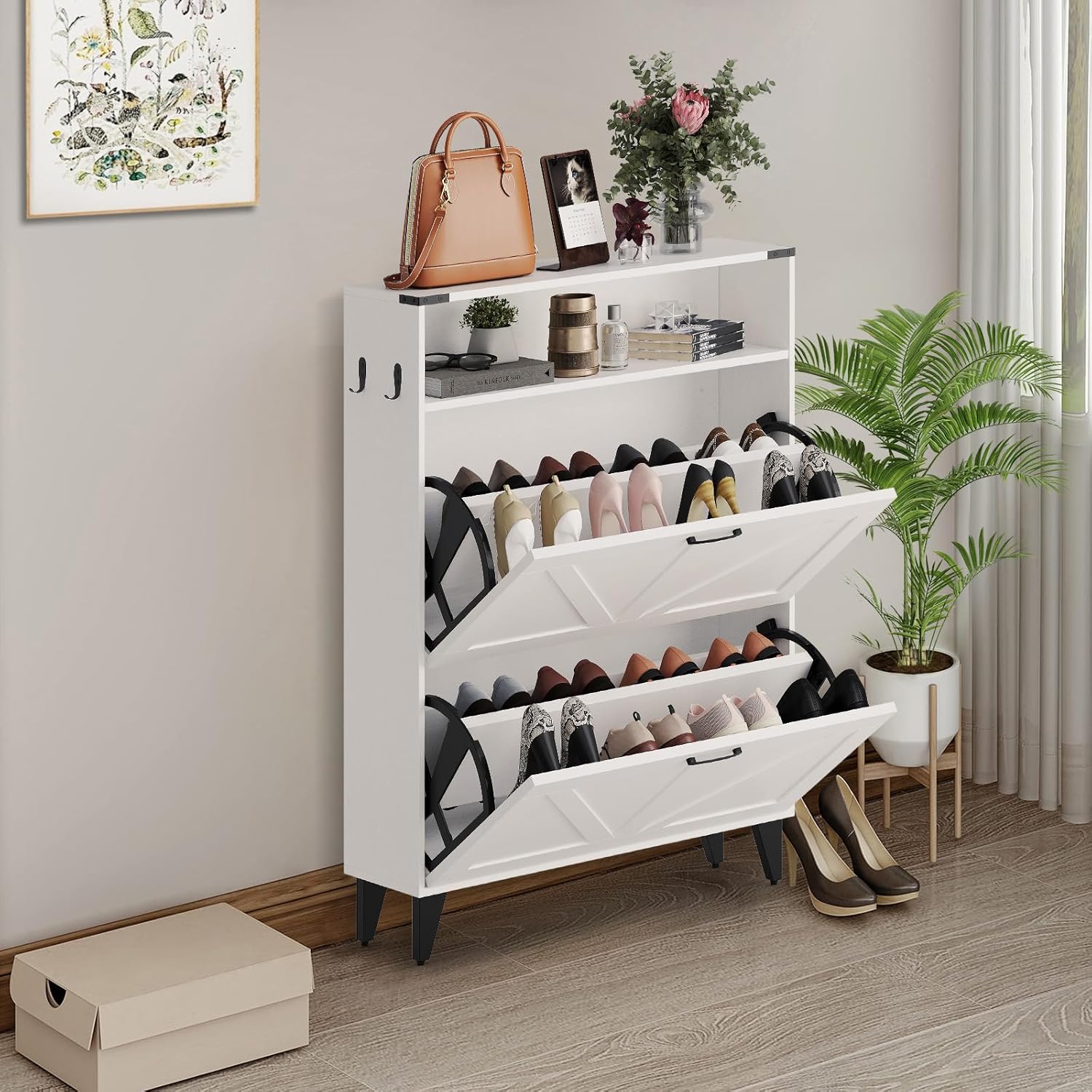 GarveeHome Freestanding Shoe Cabinet, 2 Flip Drawers Front Door Shoe Rack with Adjustable Shelf & Metal Legs, Shoe Rack for Front Door Entrance, Entryway, 31.5 in D x 9.45 in W x 44.49 in H, White