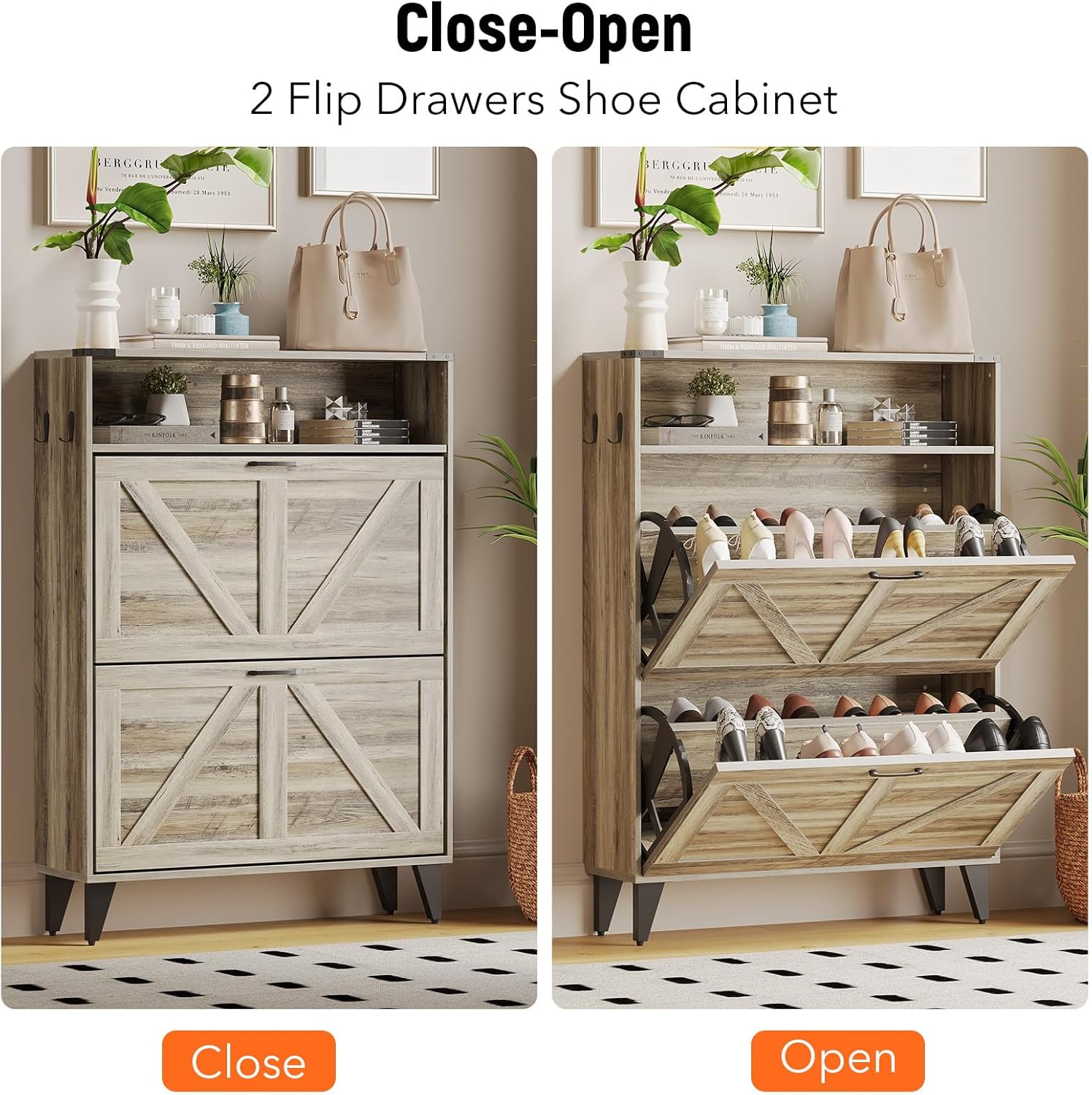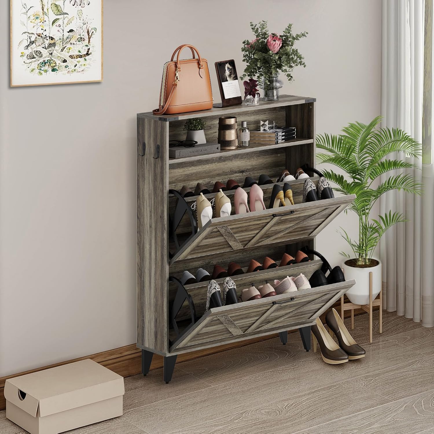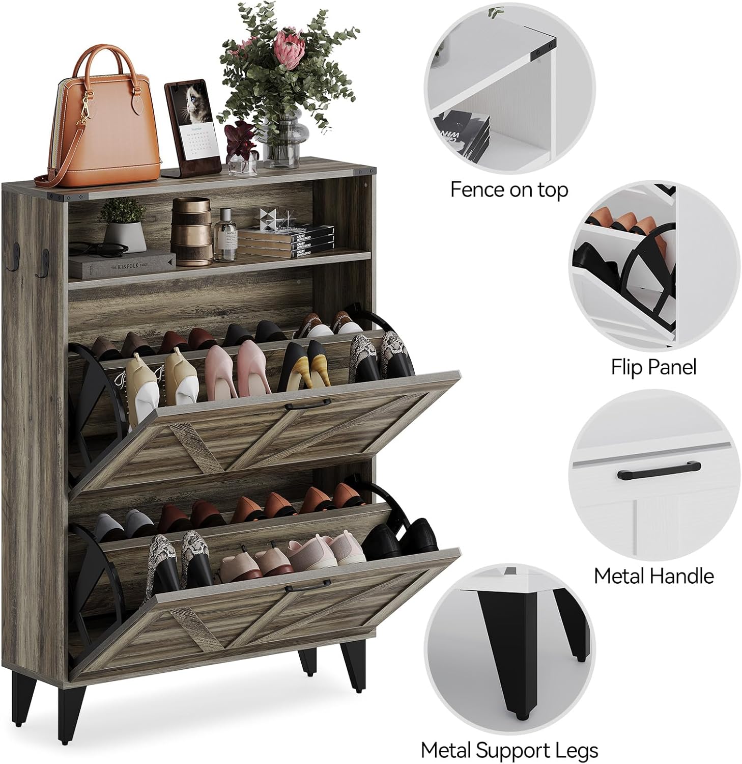 YITAHOME Farmhouse Shoe Cabinet with Bench – Slim Entryway Storage Organizer, Narrow Shoe Rack with Flip-Down Drawers for Hallway & Living Room (Washed Grey)