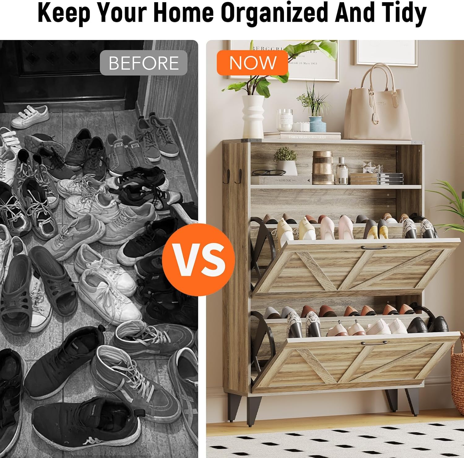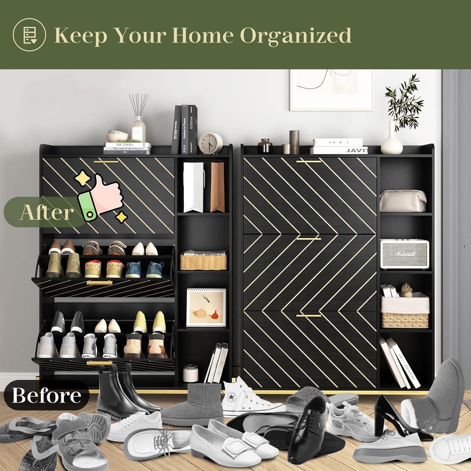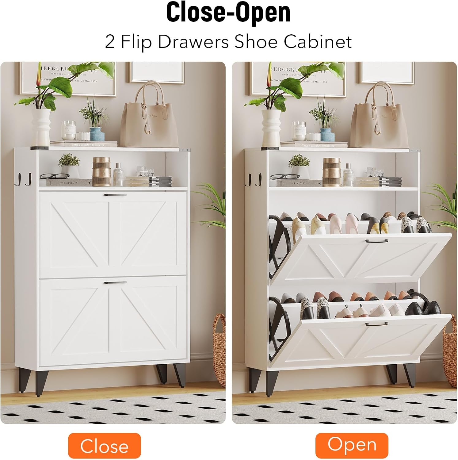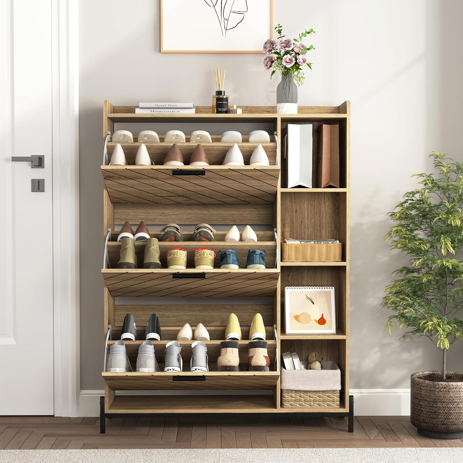 KEIKI Shoe Storage Cabinet with 3 Flip Drawers & Open Shelves, Narrow Shoe Cabinet for Entryway Slim, Farmhouse Shoe Cabinet Freestanding Entry Shoe Rack Cabinet, Wood Shoe Organizer, Black