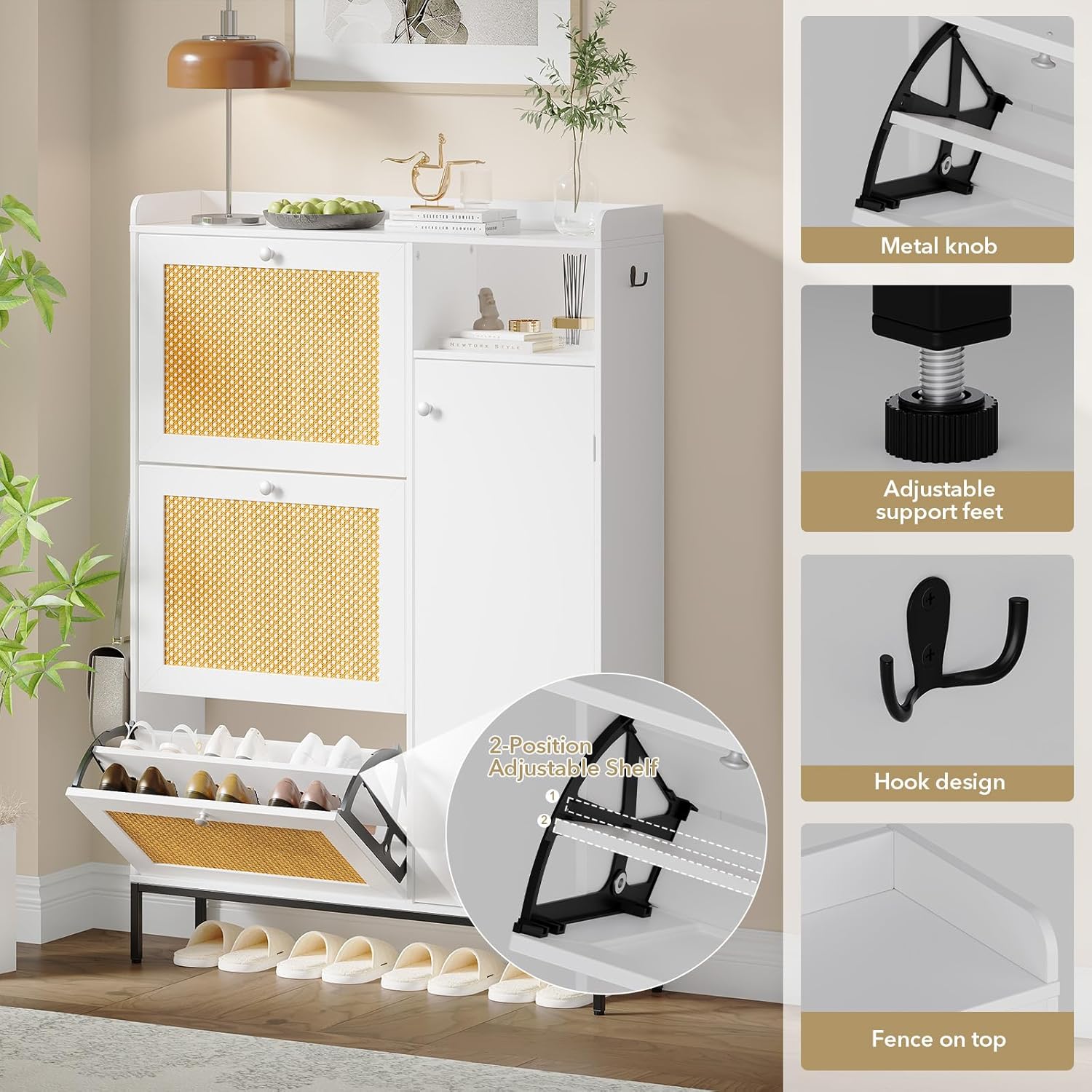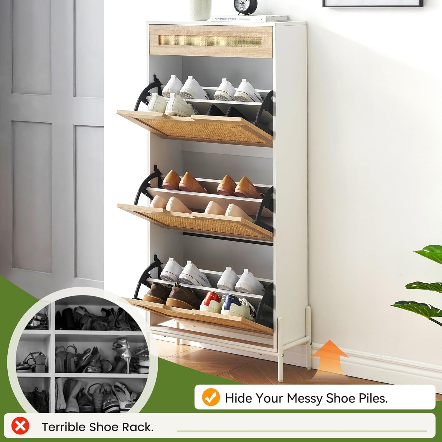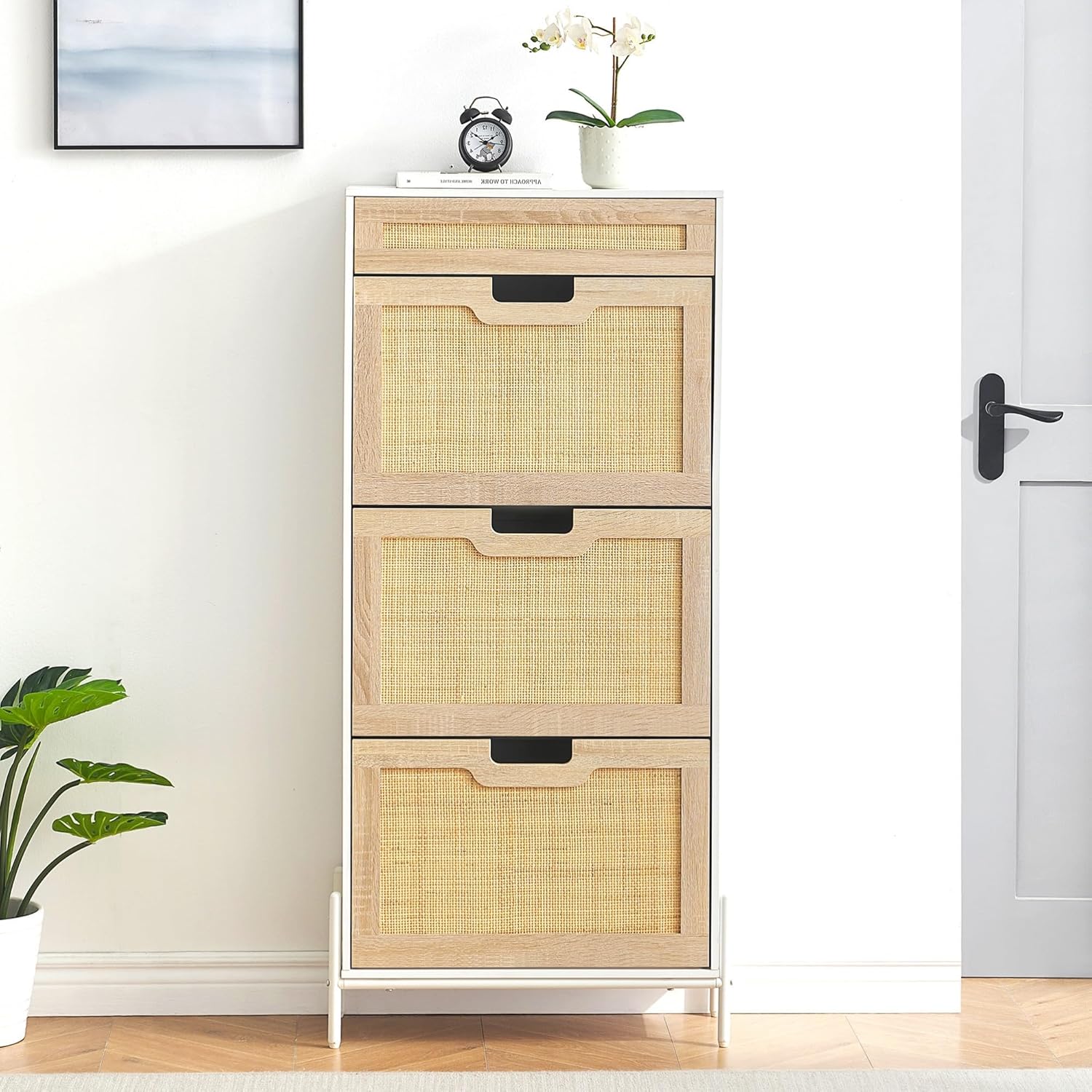GarveeHome Natural Rattan Storage Cabinet with 3 Flip Doors and 1 Drawer, Entry Way Shoe Storage Cabinet with Adjustable Shelf, Freestanding Entrance Shoe Cabinet for Entryway, Hallway, White and Oak