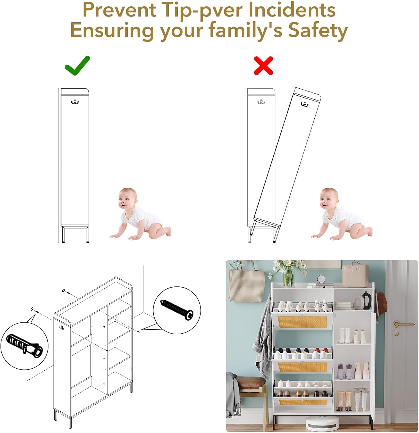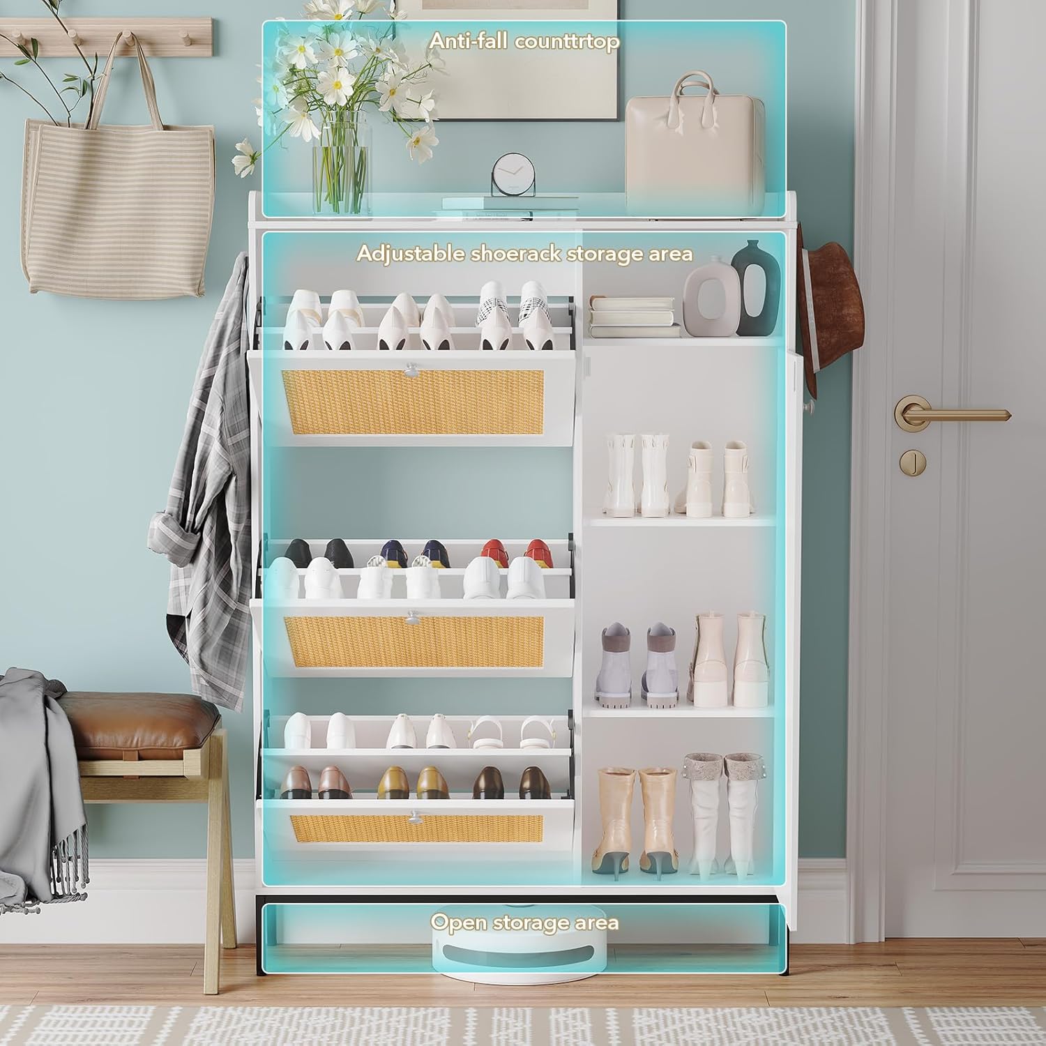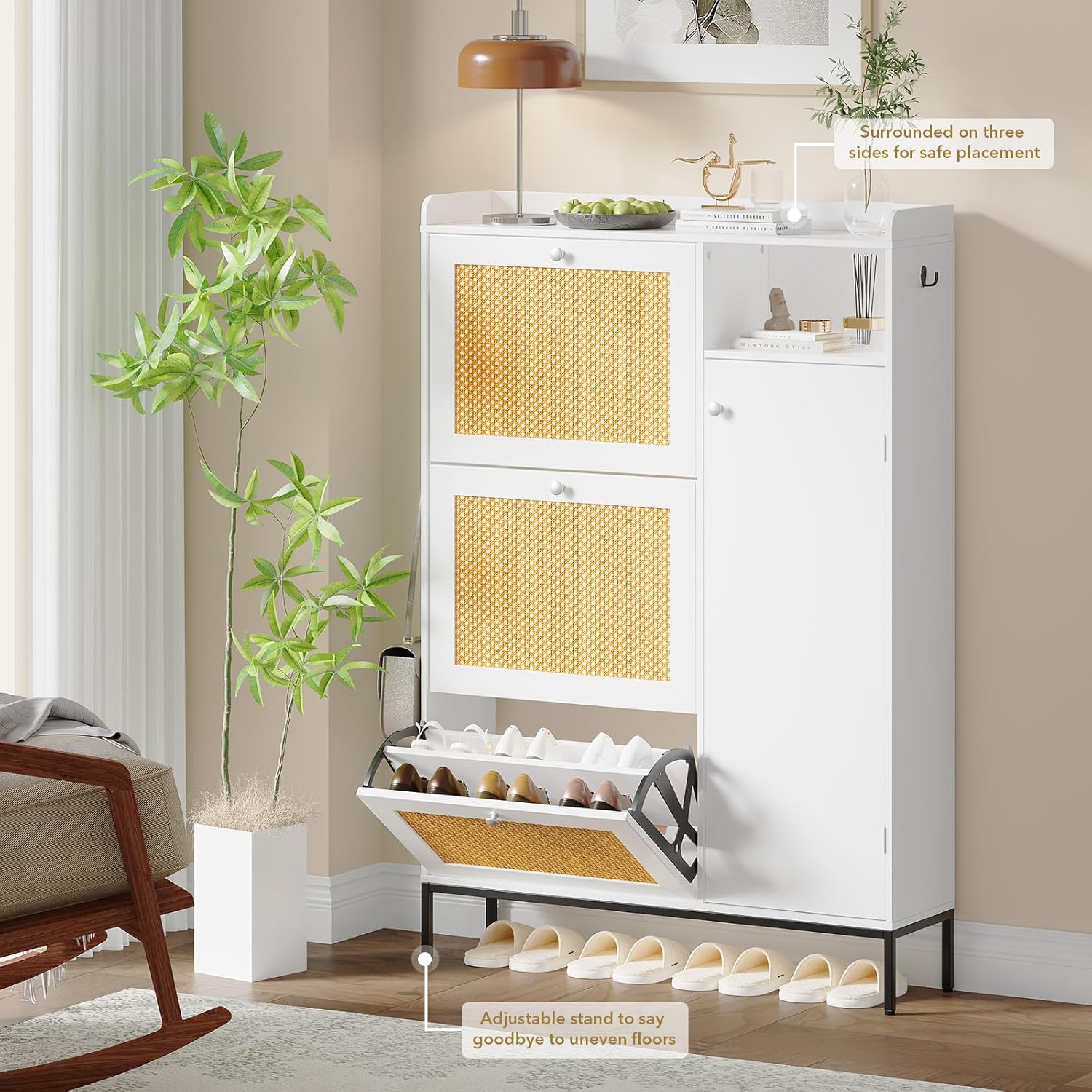 GarveeHome Natural Rattan Storage Cabinet with 3 Flip Doors and 1 Drawer, Entry Way Shoe Storage Cabinet with Adjustable Shelf, Freestanding Entrance Shoe Cabinet for Entryway, Hallway, White and Oak
