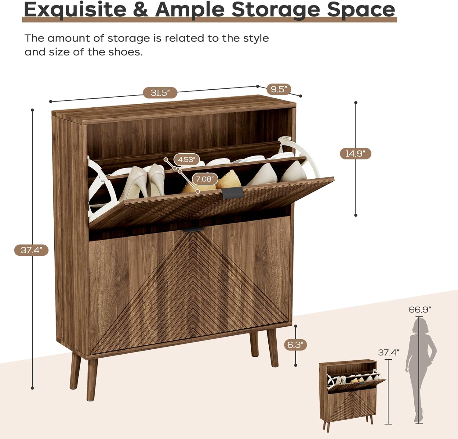 Shoe Storage Cabinet, Farmhouse Shoe Organizer with 2 Flip Drawers & Barn Door Design, 1Top Drawer Storage, Freestanding Hidden Slim Narrow Shoe Rack Cabinet for Entryway, Hallway - Walnut