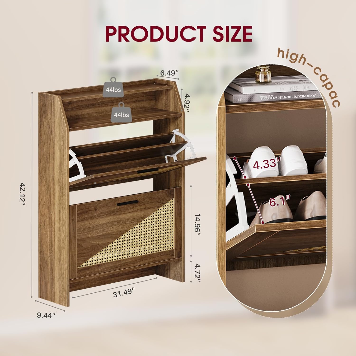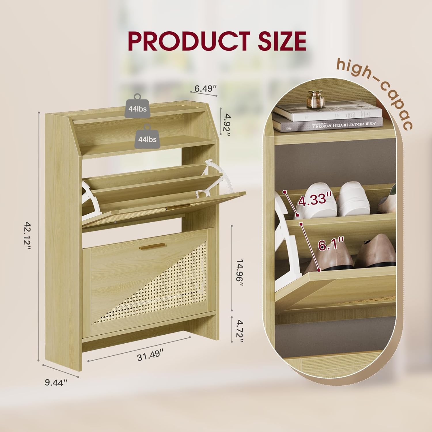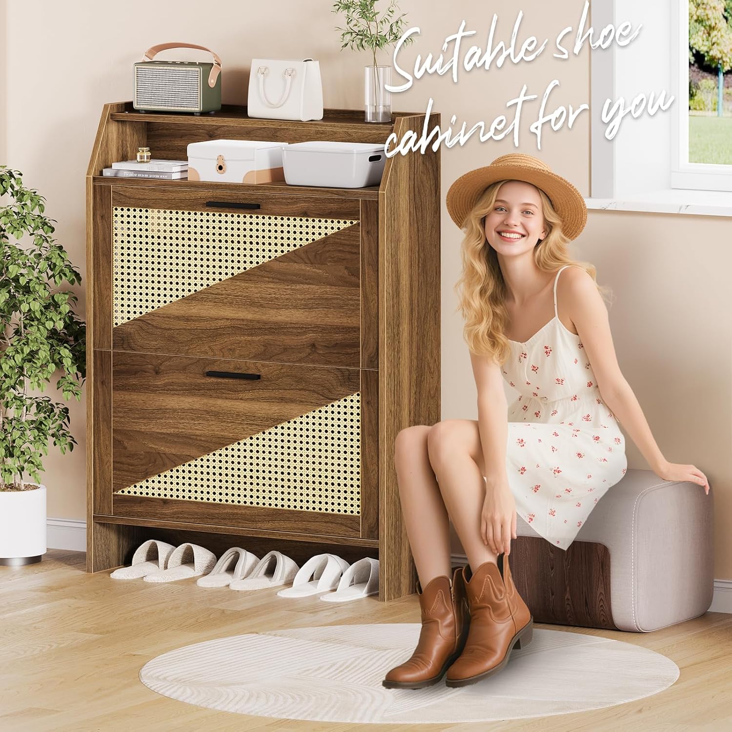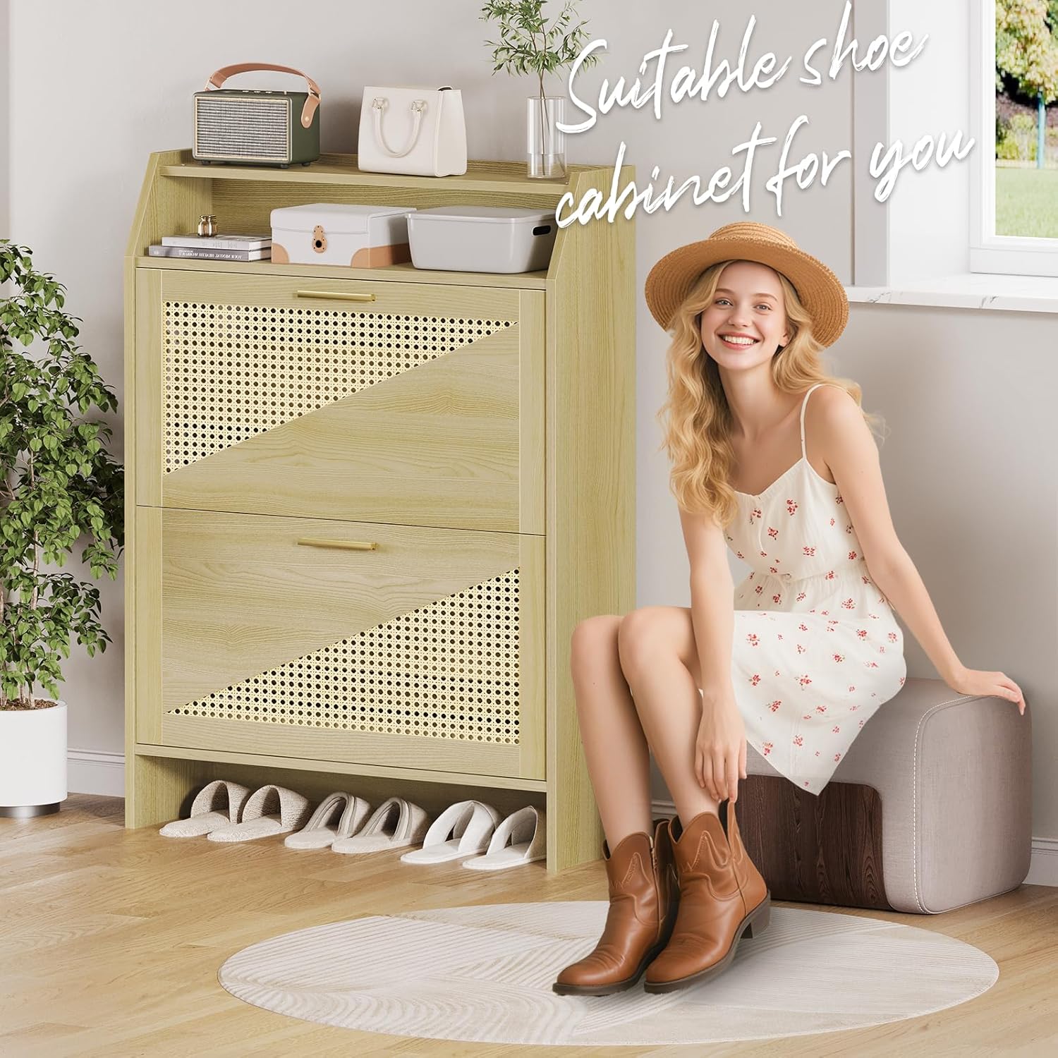 Rattan Shoe Storage Cabinet with 2 Flip Drawers, Wooden Shoe Cabinet with Adjustable Shelf, Narrow Shoe Rack Organizer Cabinet for Entryway, Hallway, Living Room (Wood)