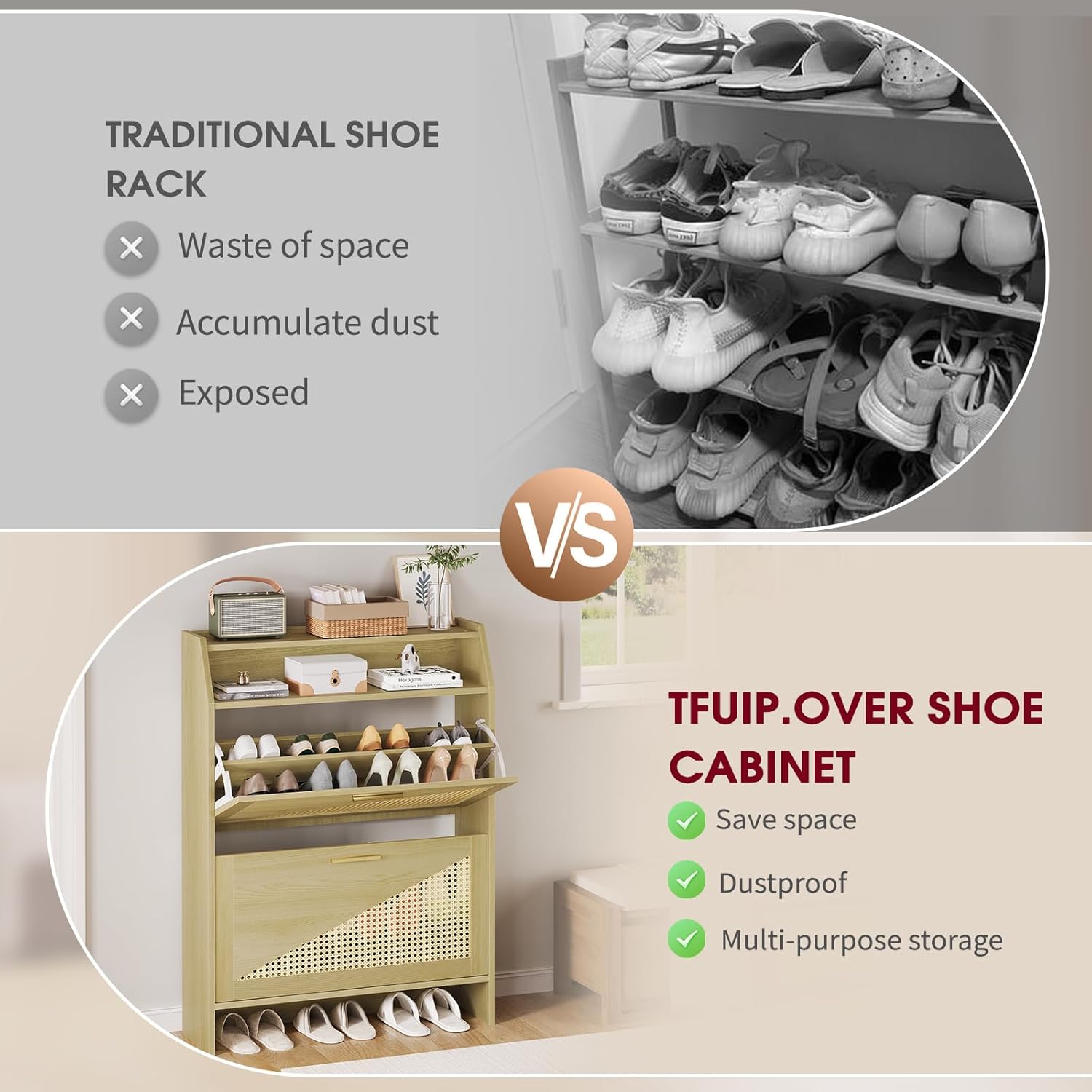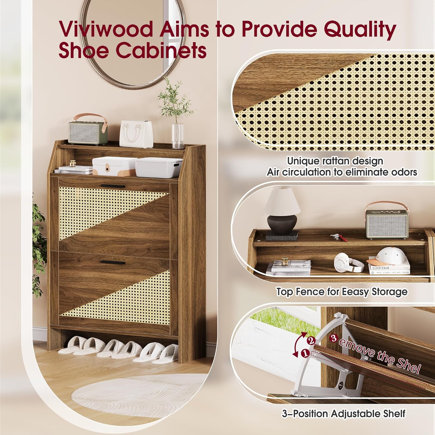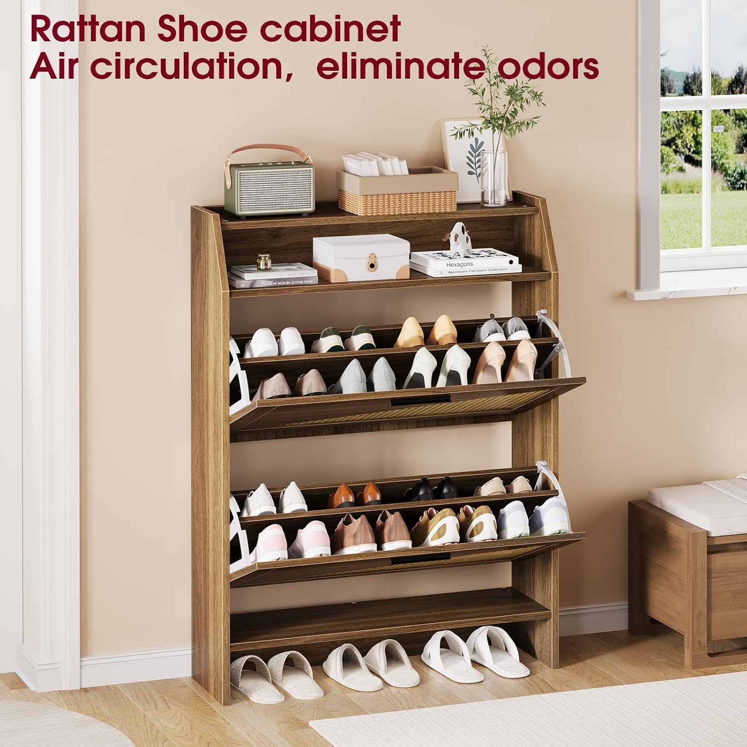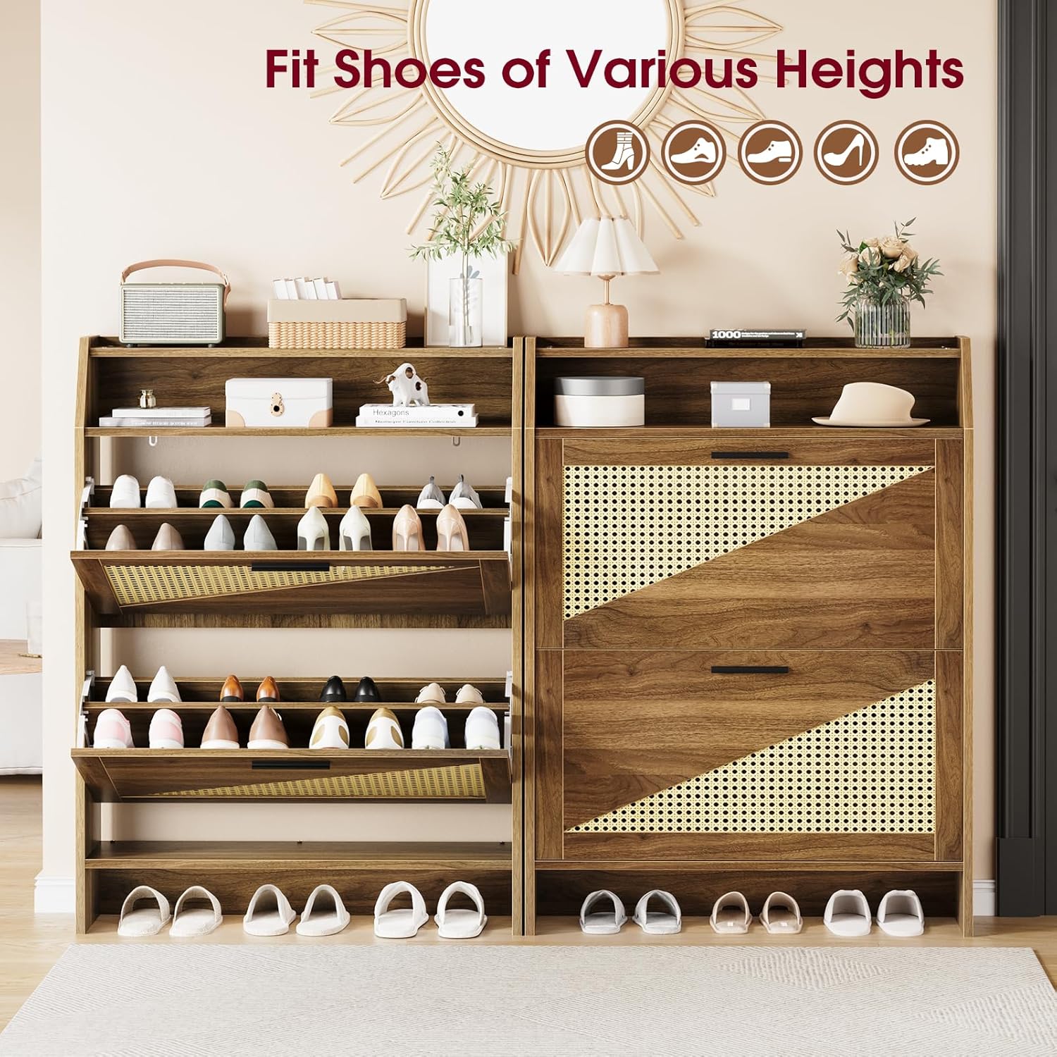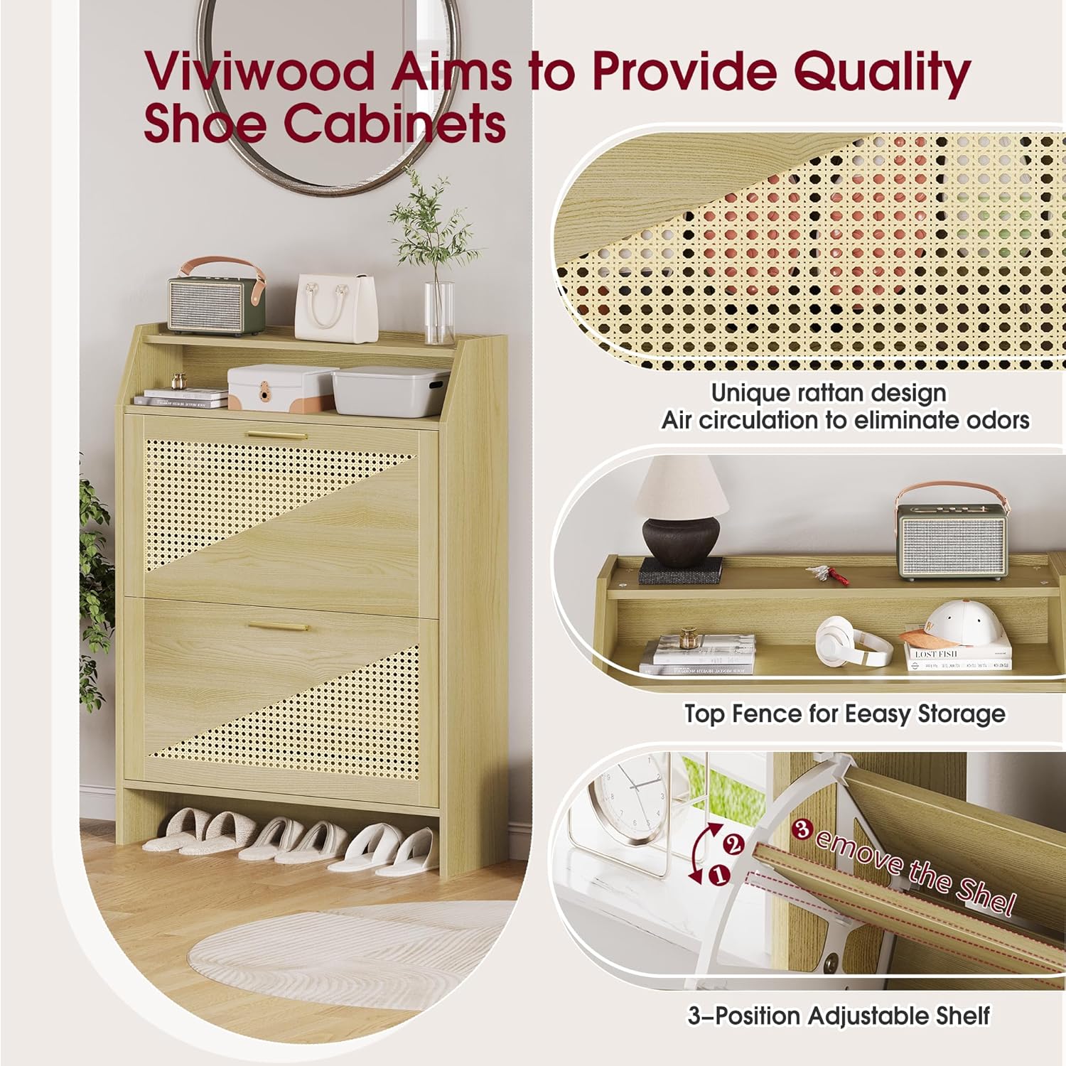 Rattan Shoe Storage Cabinet with 2 Flip Drawers, Wooden Shoe Cabinet with Adjustable Shelf, Narrow Shoe Rack Organizer Cabinet for Entryway, Hallway, Living Room (Wood)