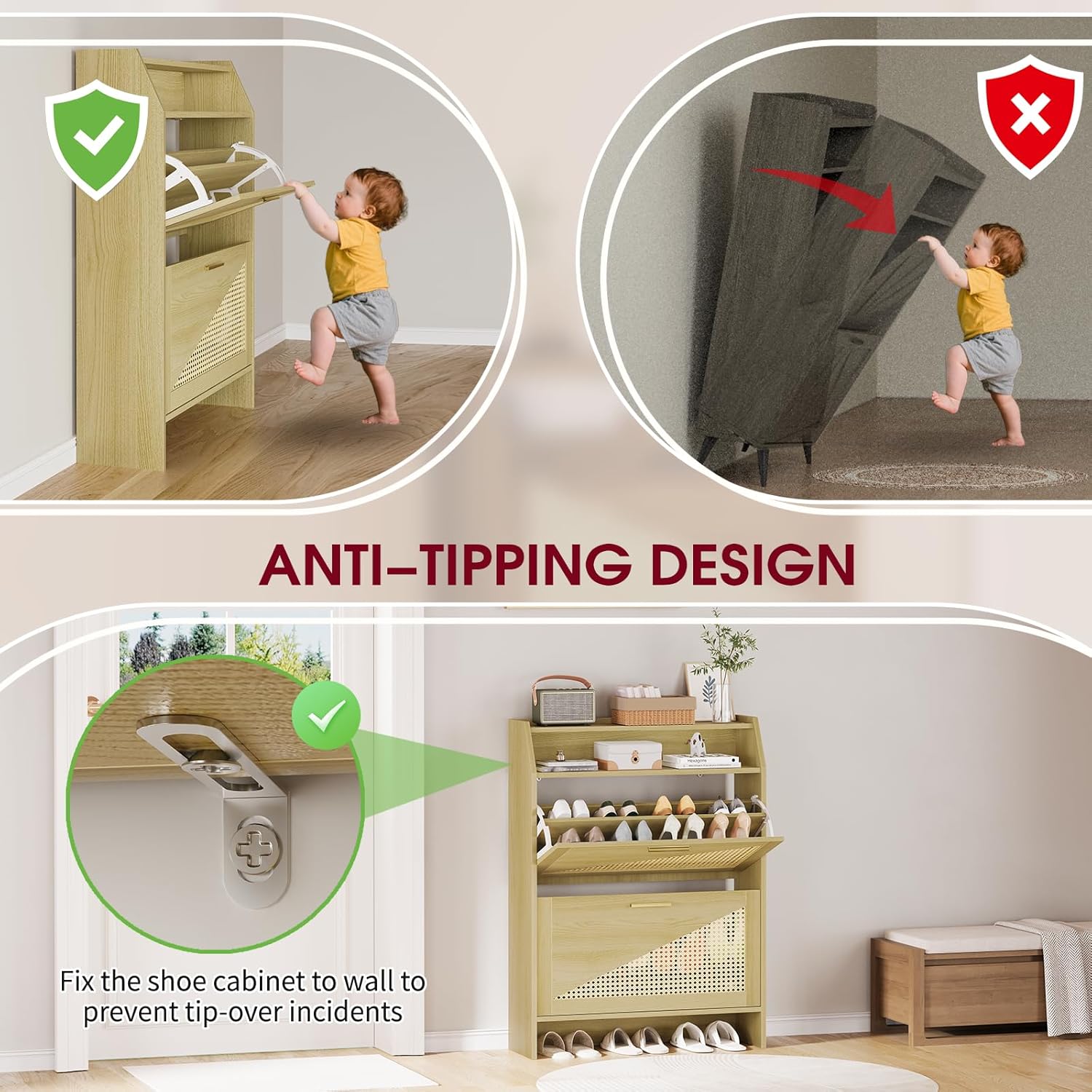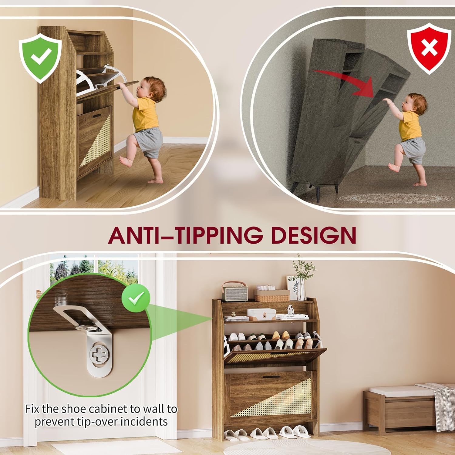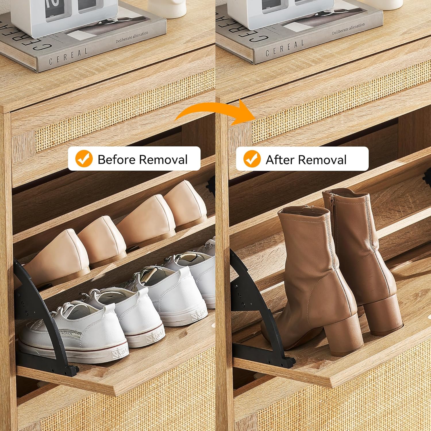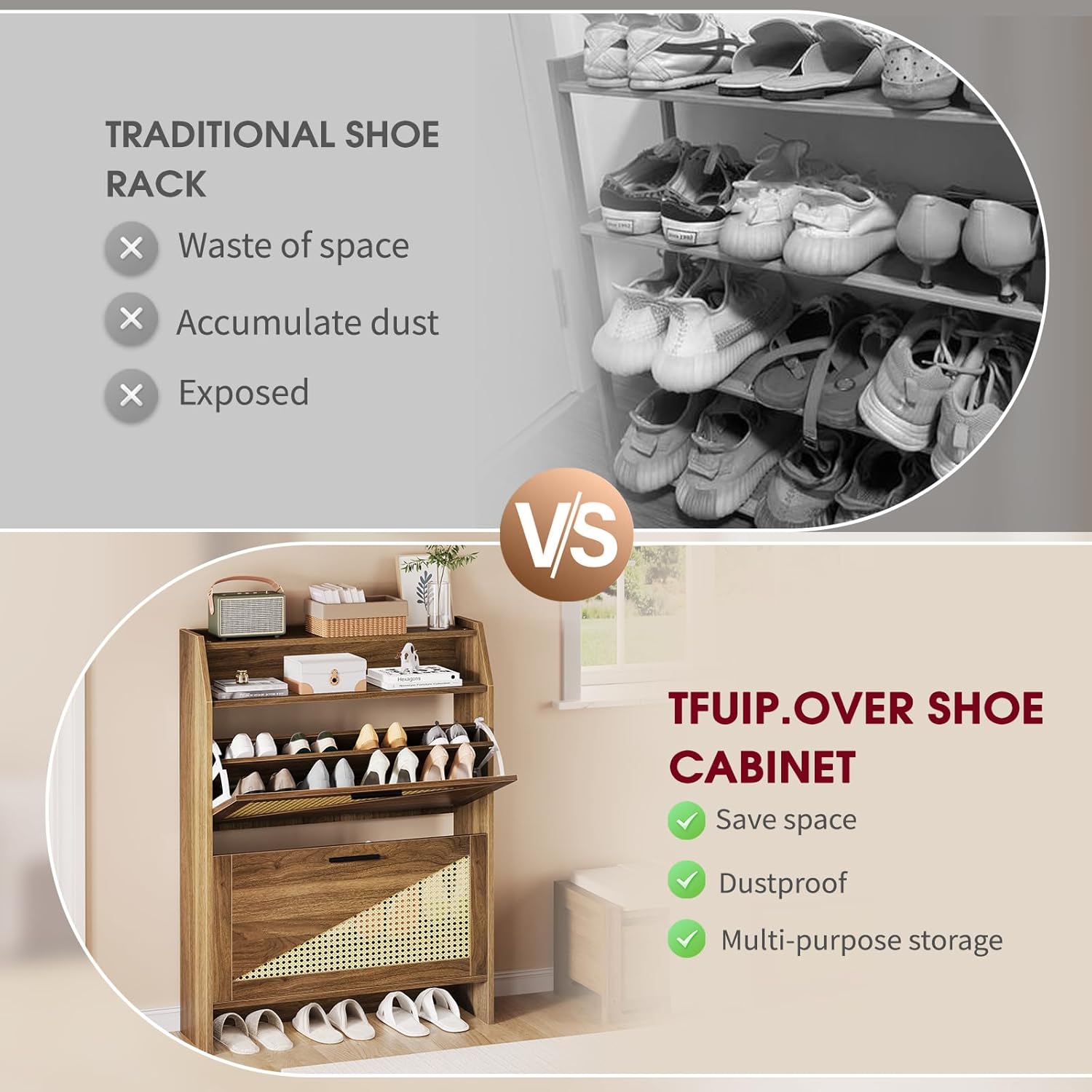 Rattan Shoe Storage Cabinet with 2 Flip Drawers, Wooden Shoe Cabinet with Adjustable Shelf, Narrow Shoe Rack Organizer Cabinet for Entryway, Hallway, Living Room (Wood)