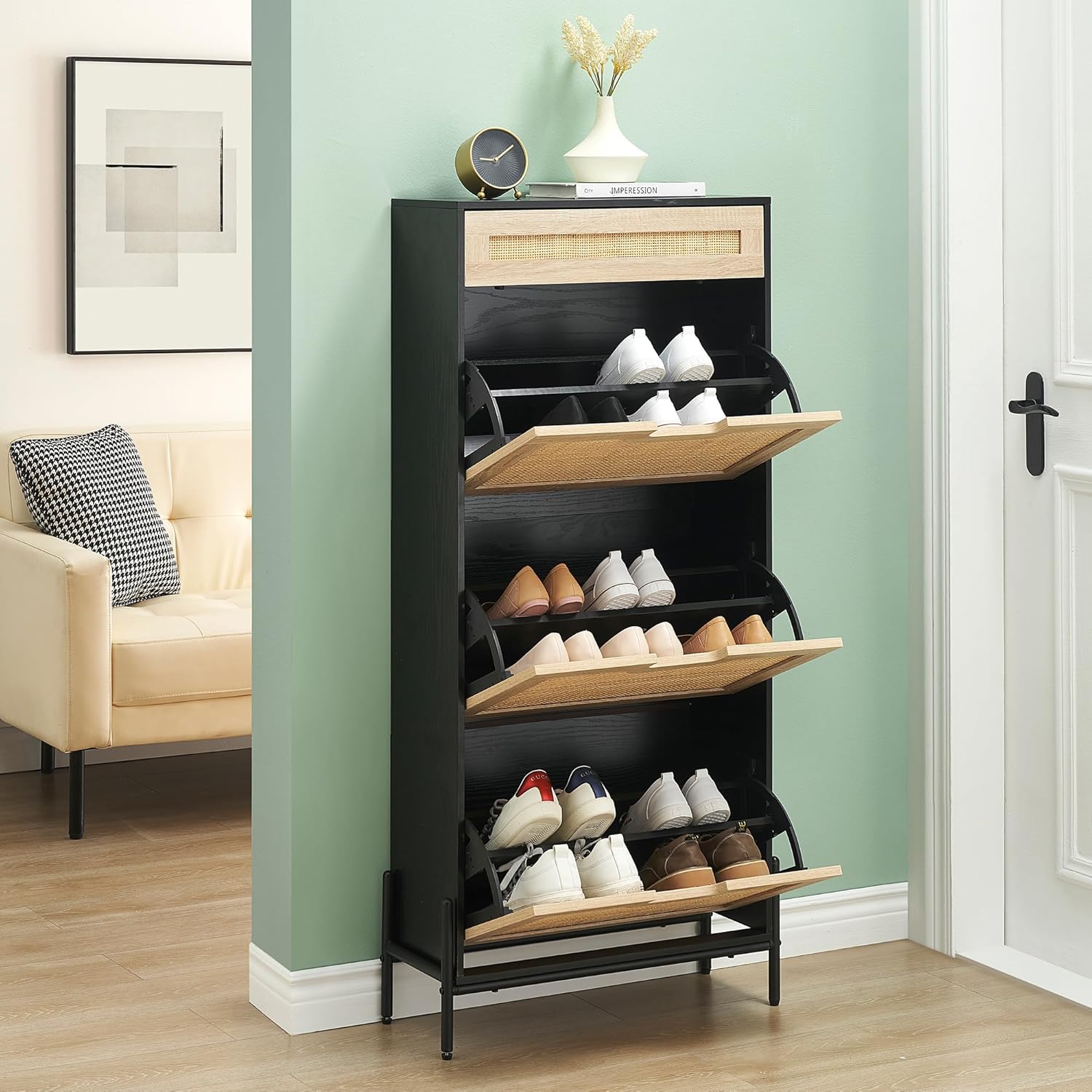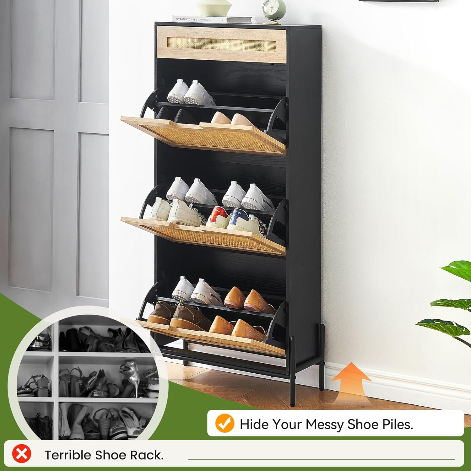 Garvee 3 Tier Shoe Cabinet with Natural Rattan Flip Drawers for Entryway, Free Standing Shoe Storage Organizer with Adjustable Shelves, Narrow Shoe Rack for Hallway, Living Room, Easy Assembly. Black