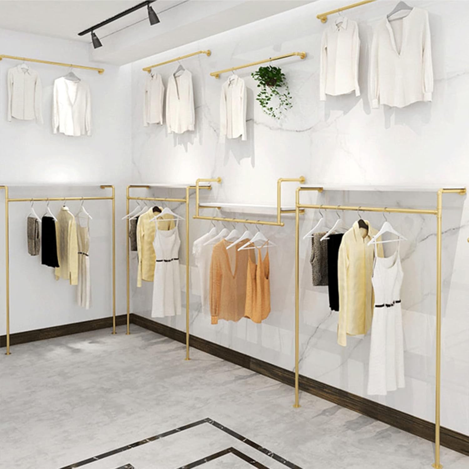 Modern Simple Industrial Pipe Hanging Rods Clothing Rack,Retail Display Wall Mounted Storage Clothes Hanging Shelf, Wood Garment Rack (Gold, 59" L)