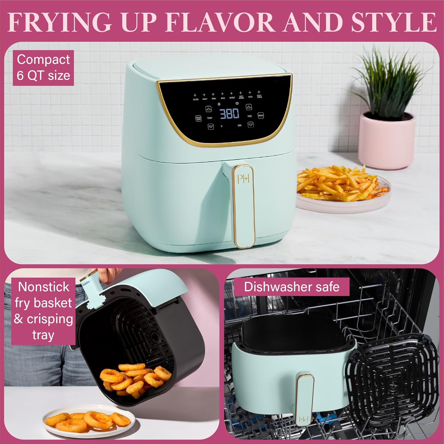 Paris Hilton Air Fryer, Large 6-Quart Capacity, Nonstick Made without PFAS, Touchscreen Display, 8-in-1 (Air Fry, Roast, Broil, Bake, Reheat, Keep Warm, Pizza, Dehydrate), Dishwasher Safe, Pink