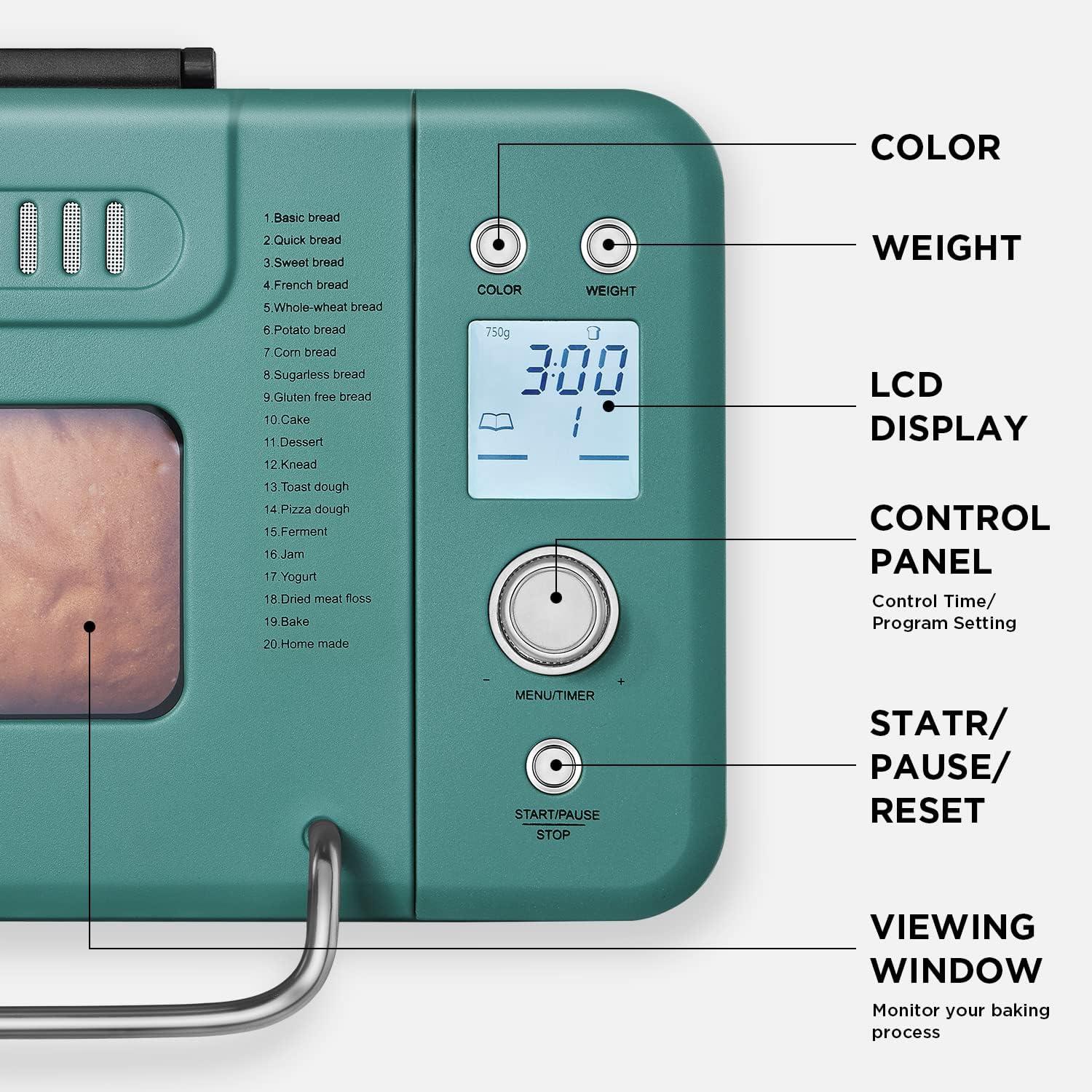 Neretva Bread Maker, 20-IN-1 2LB Bread Machine Dual Heater Bread Maker Machine Automatic with Nonstick Ceramic Pan, 15H Timer & 1H Keep Warm Set, Low Noise, Stainless Steel Breadmaker Recipe-Green