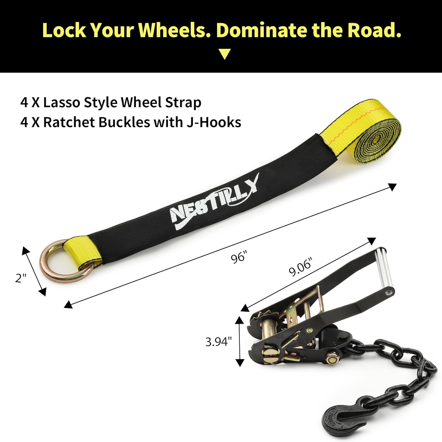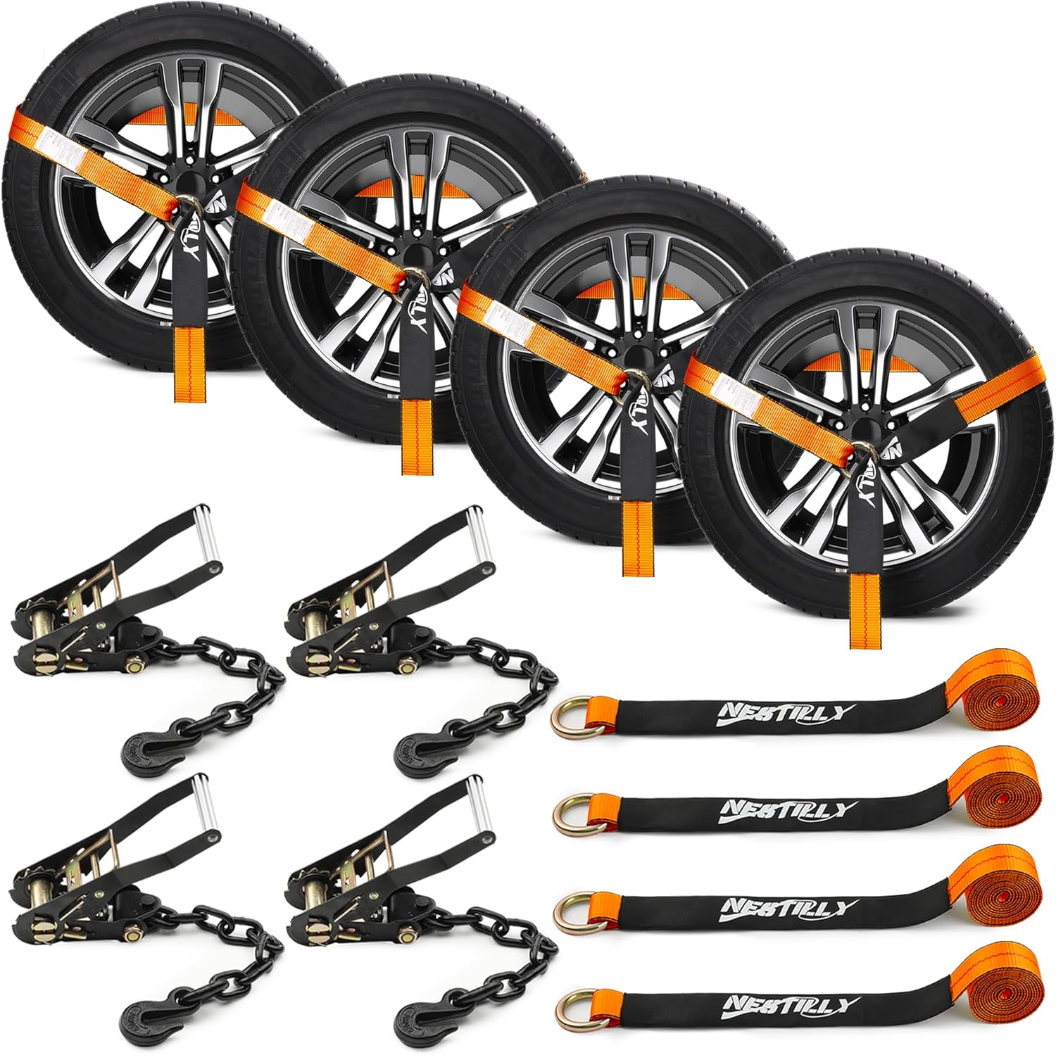KJE 4 Pack Reflective Car Tie Down Straps for Trailers - Tire Ratchet Strap with Chain Anchors - 2" x 10' 10,000LBS Break Strength - Lasso Style Wheel Straps for Hauling UTV, SUV, Truck, Any Cars
