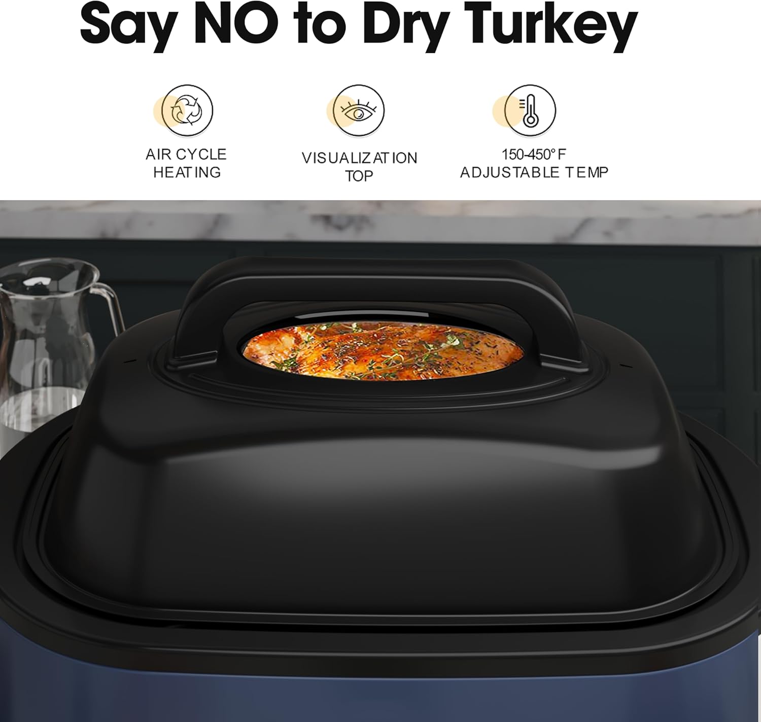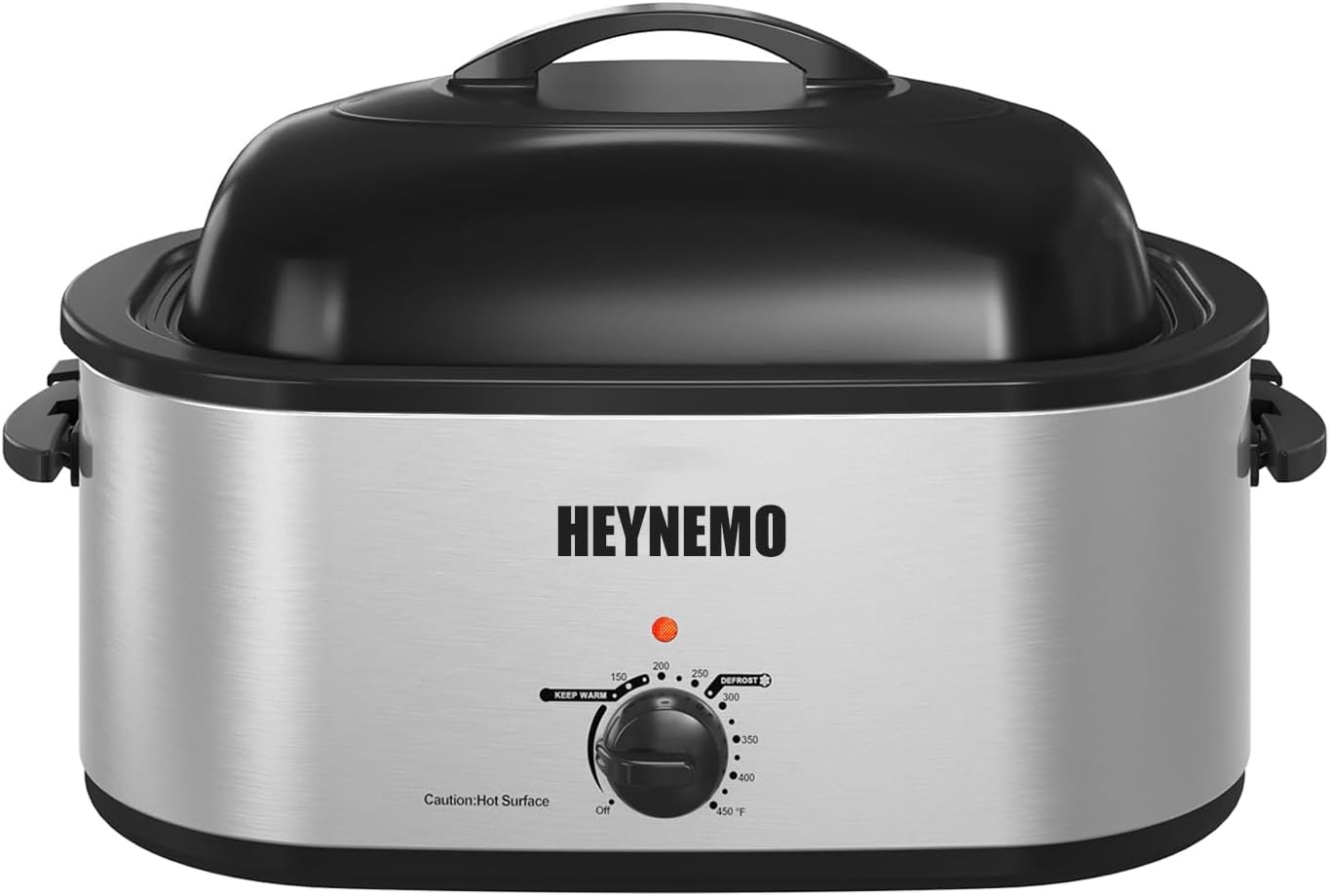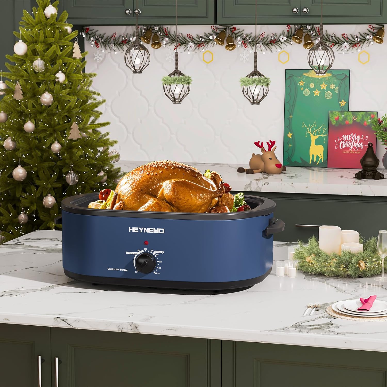 HEYNEMO Roaster Oven 22Qt, 1450W Electric Turkey Roaster Oven Buffet with Self-Basting Lid, Cool-Touch Handles, Removable Pan and Rack, Stainless Steel, Blue