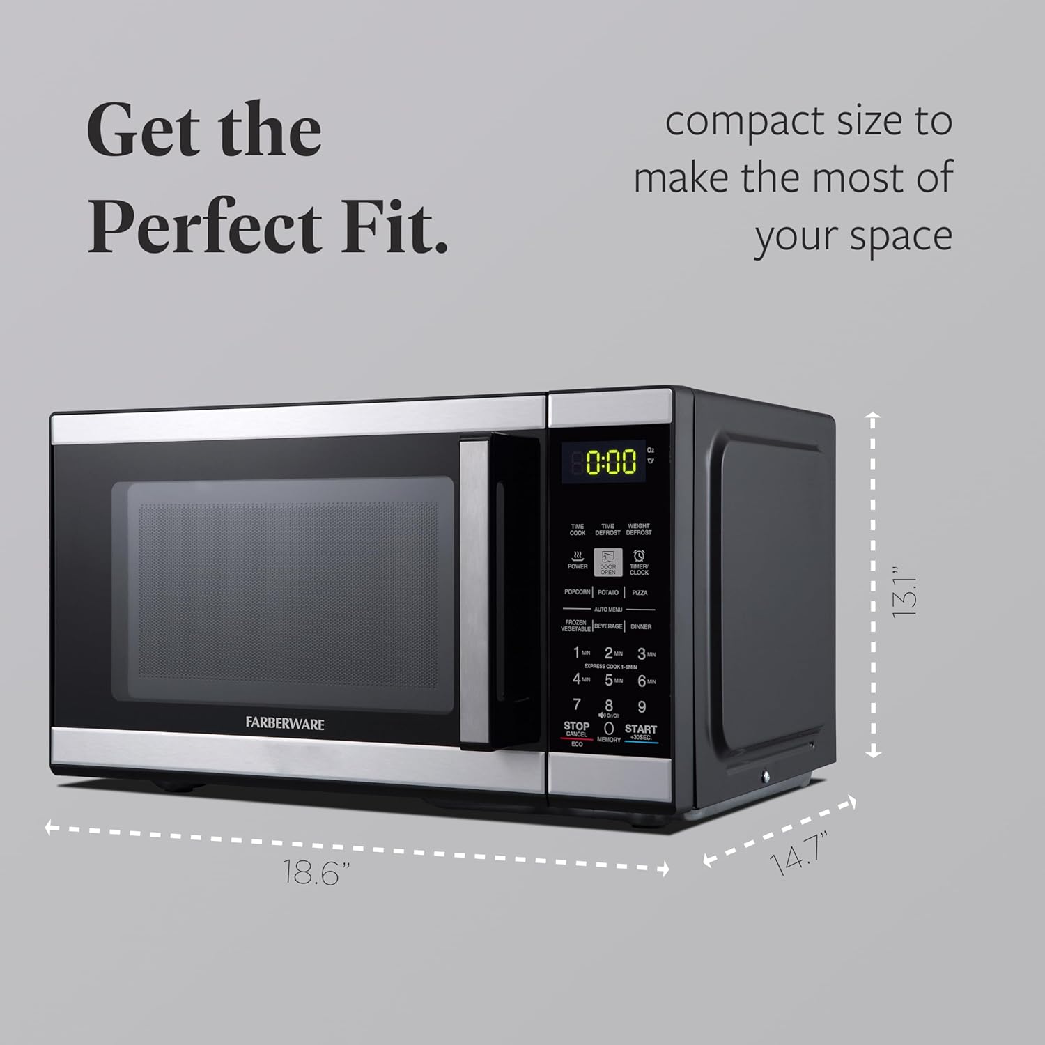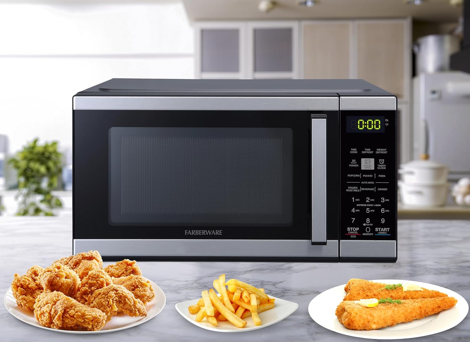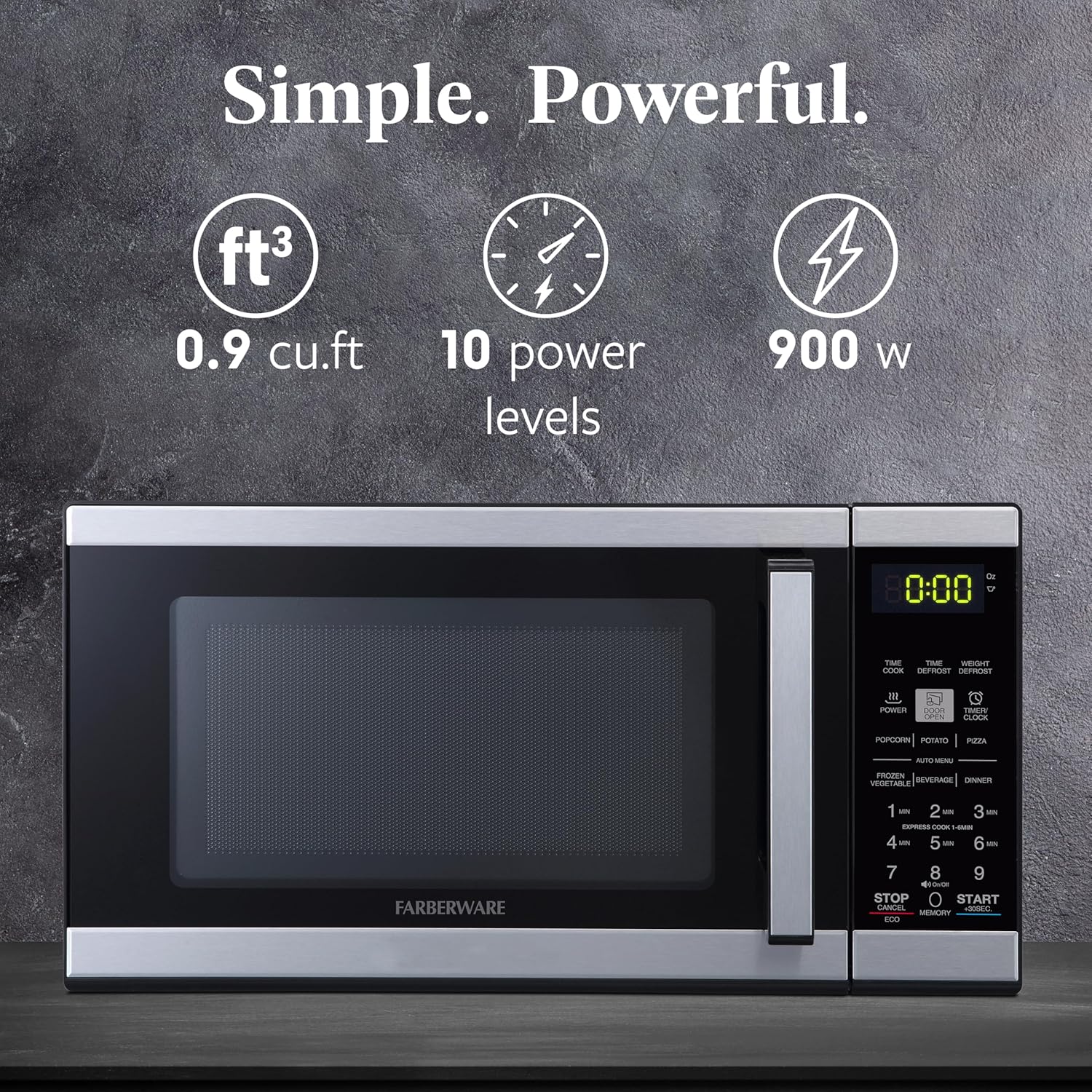 Farberware 0.9 Cu. Ft. Countertop Microwave Oven 900 Watts Power, Auto Cook Settings, Defrost, Easy Clean and Child Safety Lock, Black Stainless