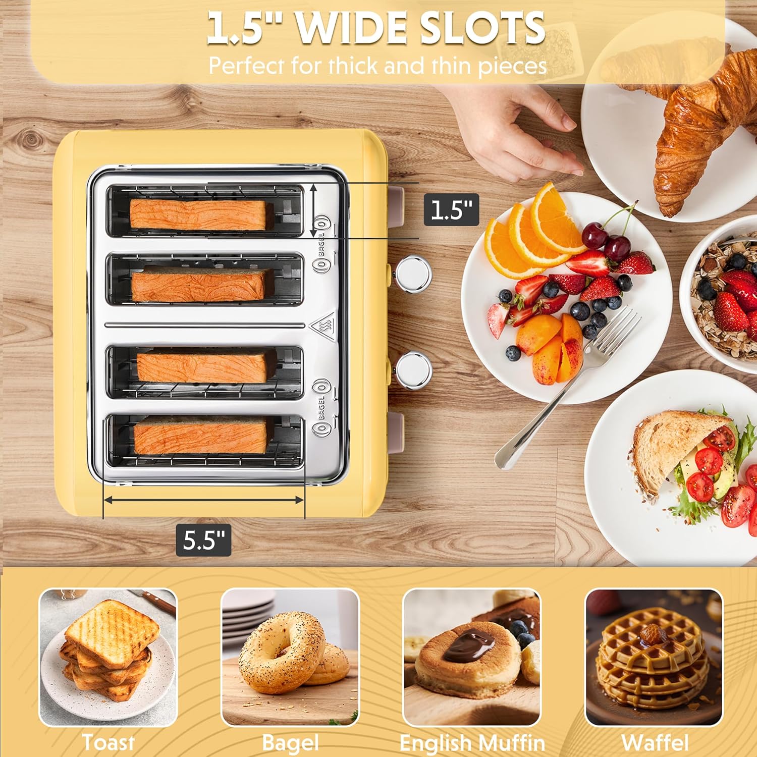 BUYDEEM DT640 Retro 4 Slice Toaster, 7 Shade Settings, Extra Wide 1.5'' Slots, Stainless Steel Toaster with Bagel Muffin Defrost Reheat Function, Yellow