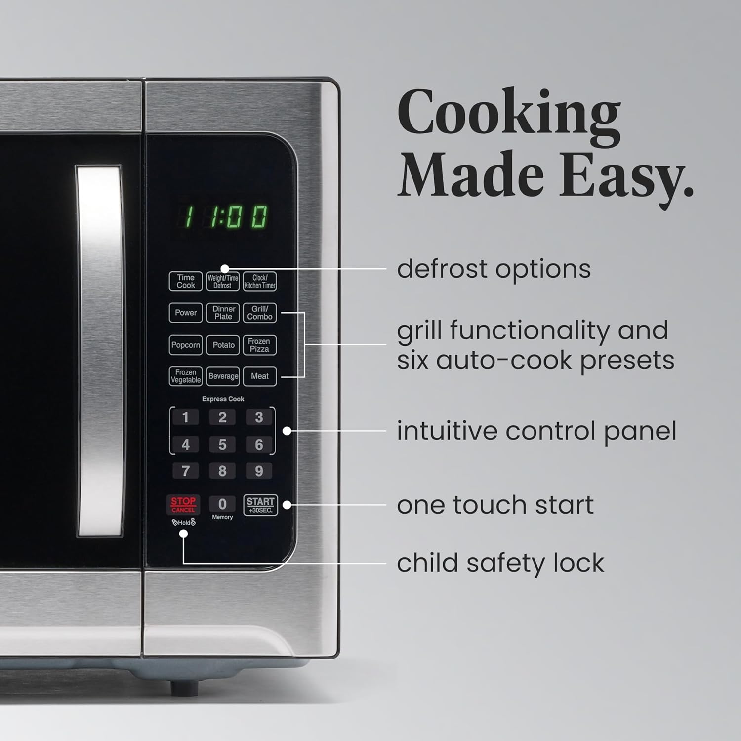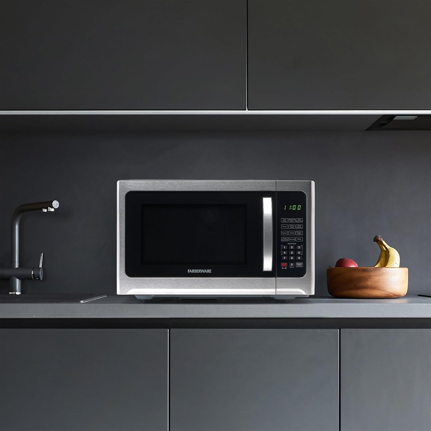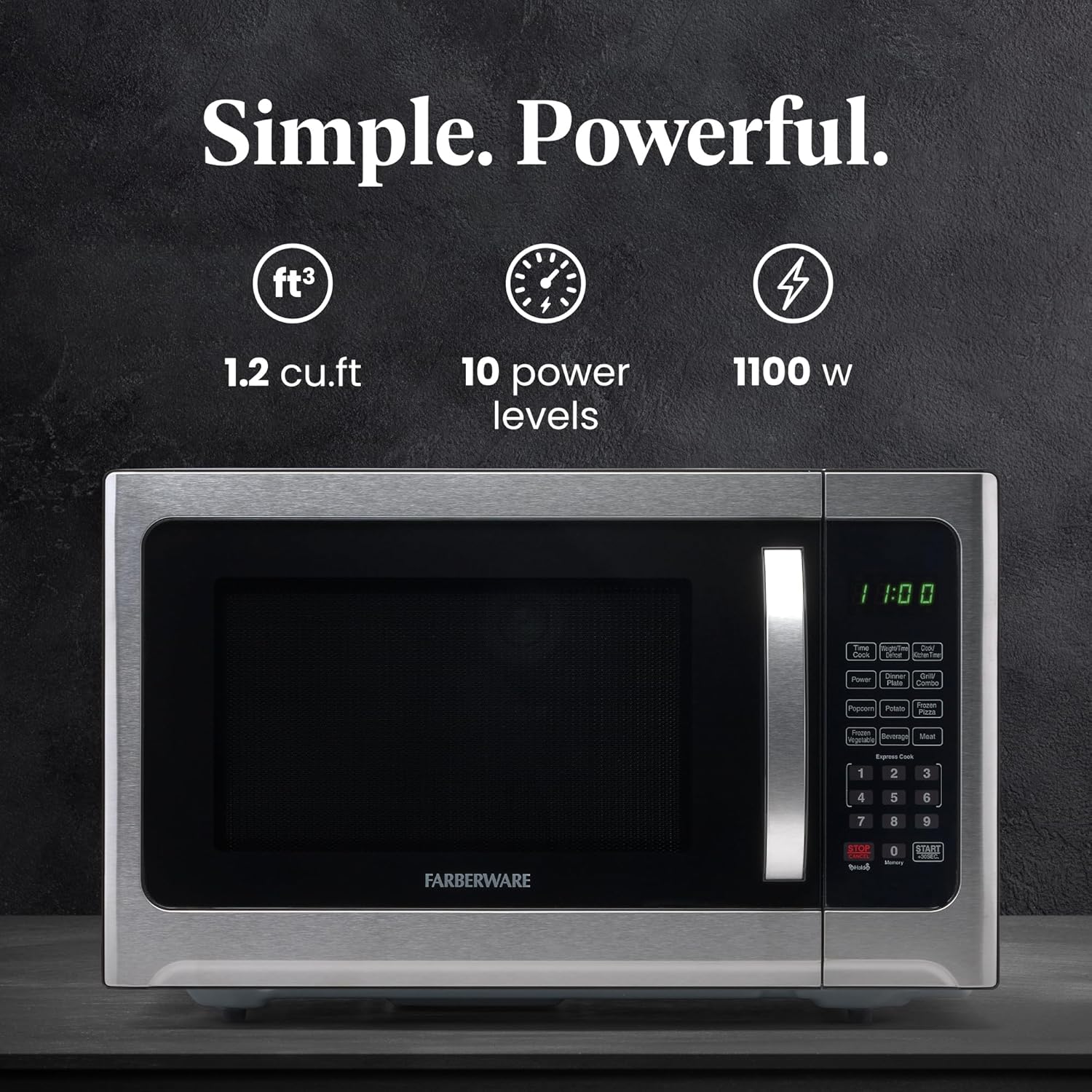 Farberware 1.2 Cu. Ft. Countertop Microwave Oven – 1000 Watts Power, Auto Cook Settings, Defrost, Easy Clean and Child Safety Lock - Stainless and Black