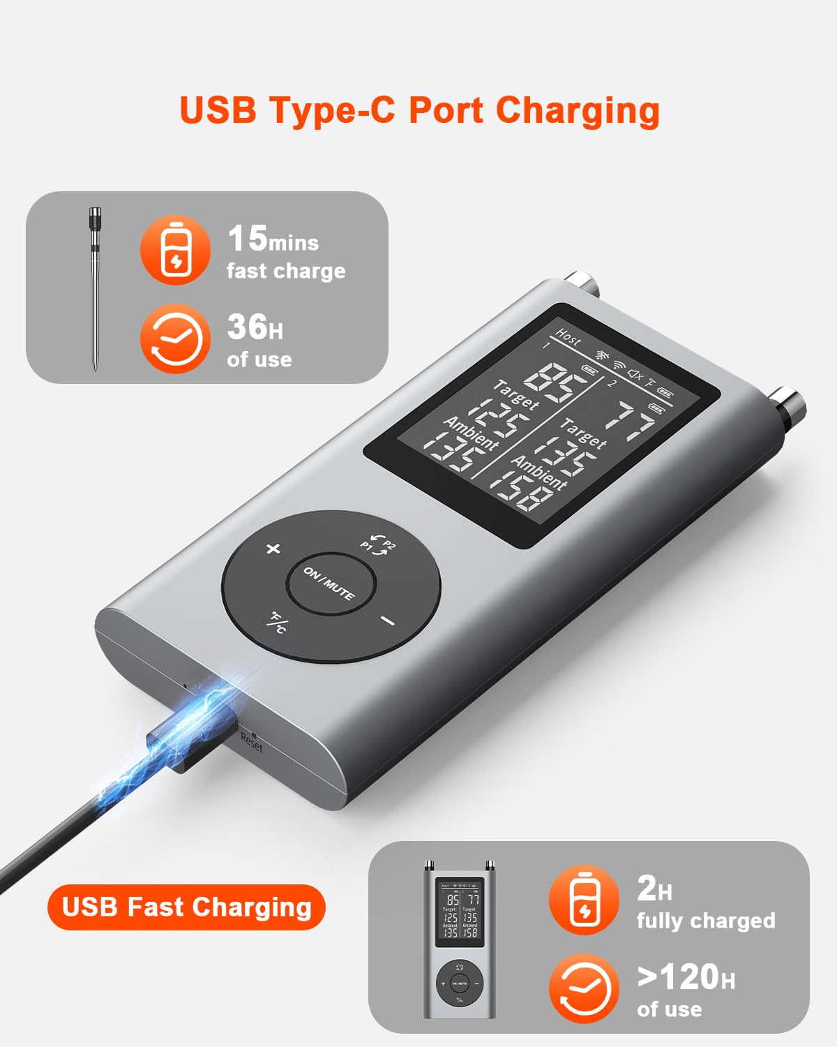 Wireless Meat Thermometer with Smart Timer & APP Alerts, 800ft Bluetooth Grill Food Thermometer, Dual 0.19In-Ultra Thin Probes, ±0.5℉ Accuracy, Big Digital Backlit Screen, for BBQ, Oven, Smoker