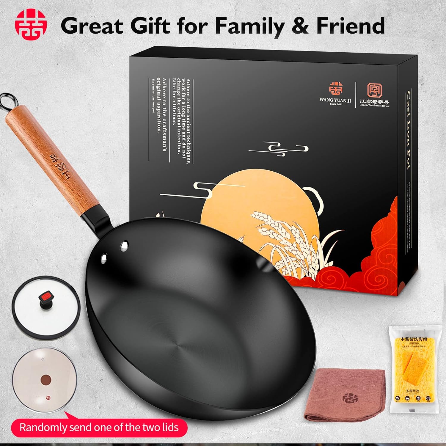 WANGYUANJI Carbon Steel Wok Pan, 11" Flat Bottom Woks and Stir Fry Pans with Lid,No Chemical Coated Traditional Wok for Induction, Electric, Gas, Halogen All Stoves