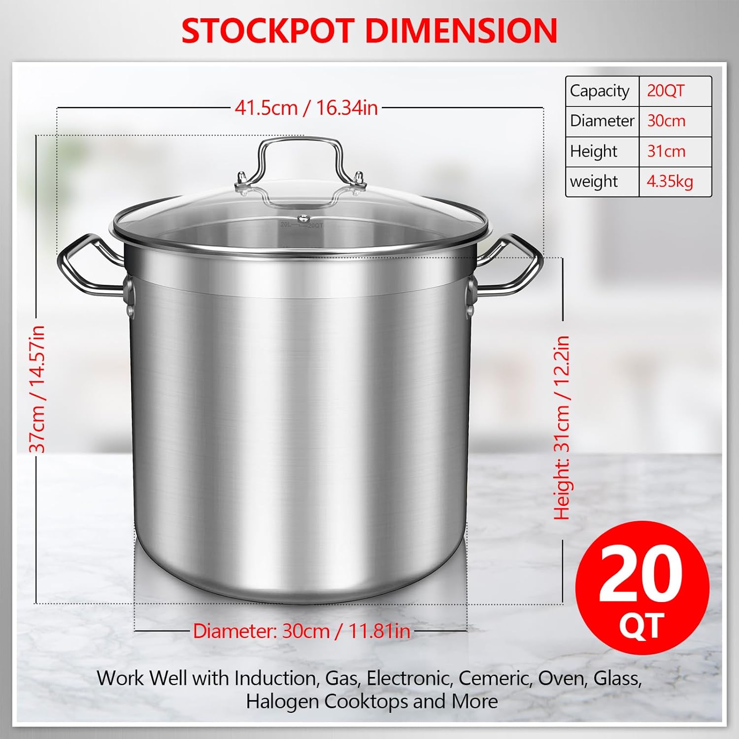 Large Stock Pot 20 Quart - Commercial Grade Soup Pot With Glass Lid - Nickel Free Stainless Steel Cookware - Healthy Polished Stockpots - Heavy Duty Induction Pots