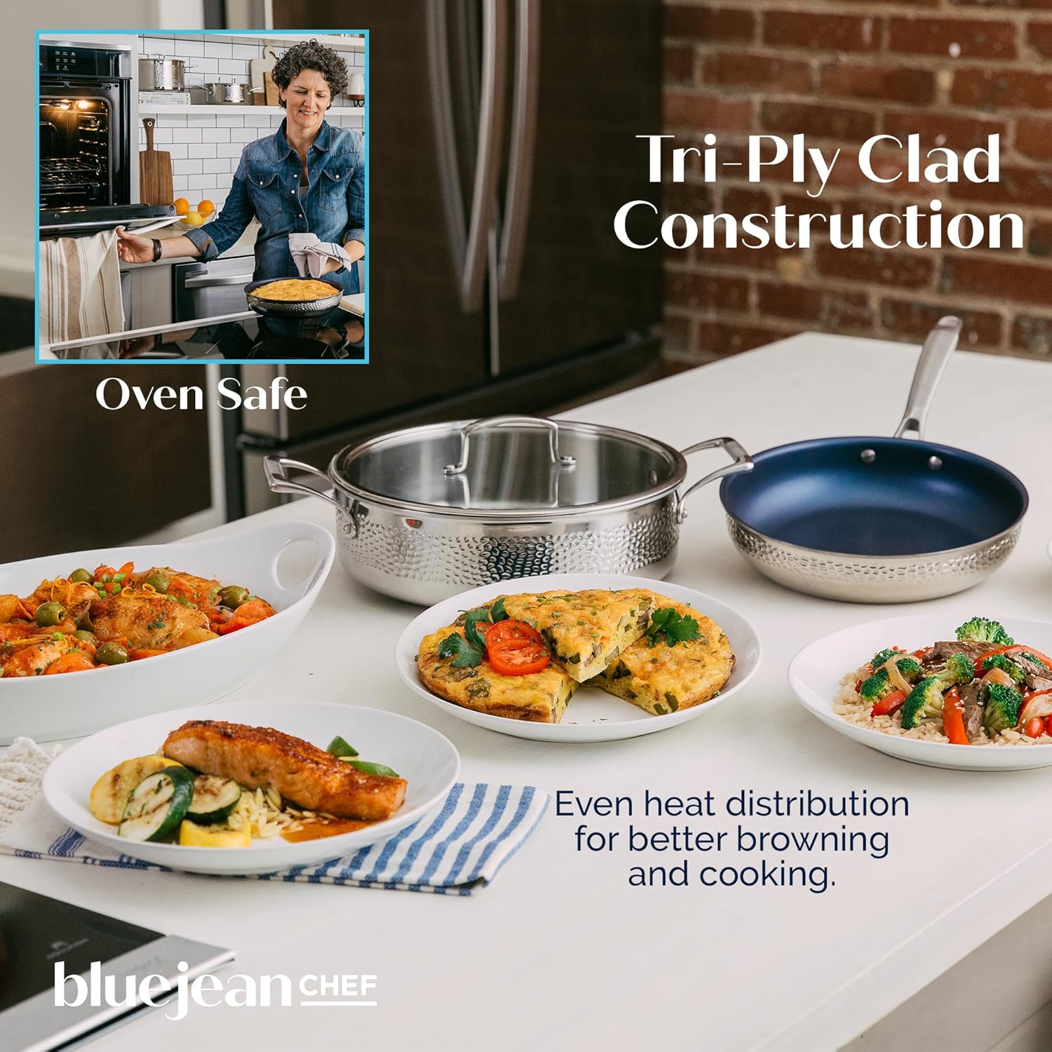 The Blue Jean Chef 3-Piece Stainless Steel Cookware Set, Hammered Finish, Tri-Ply Construction Clad Cookware, Nonstick; Induction, Oven & Dishwasher Safe