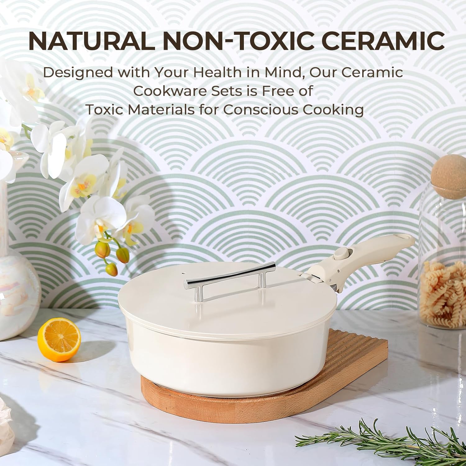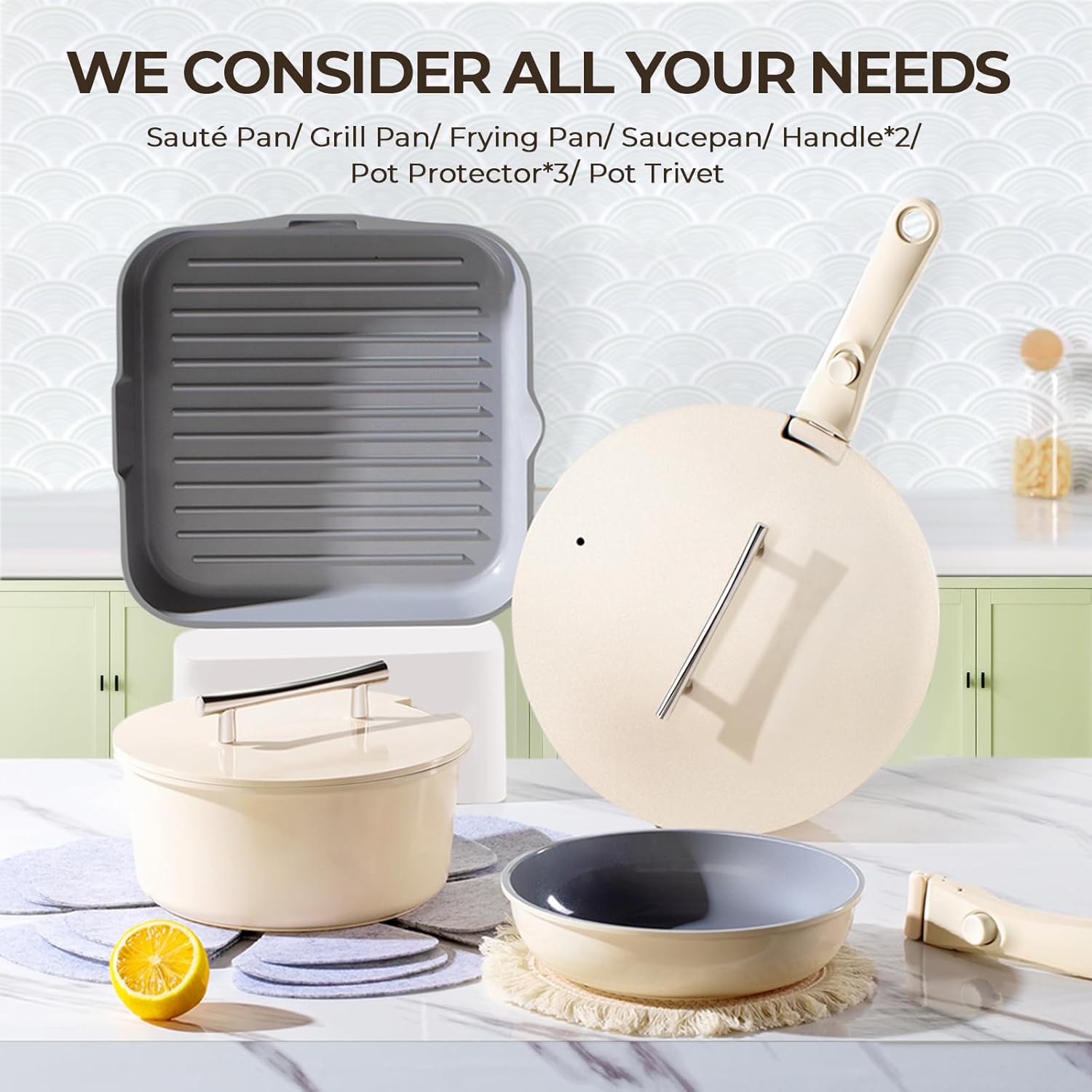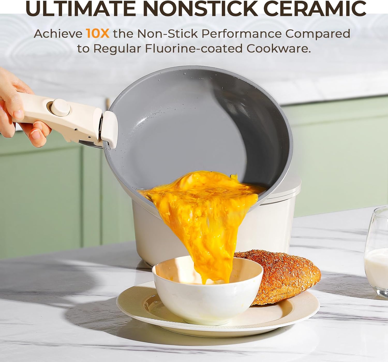 12 Pcs Nonstick Ceramic Cookware Set With Detachable Handle - Pots and Pans With Lids, Non Toxic, RV and Camping Cooking Set, PTFE & PFOA Free, Oven Safe, Space Saving - Cream