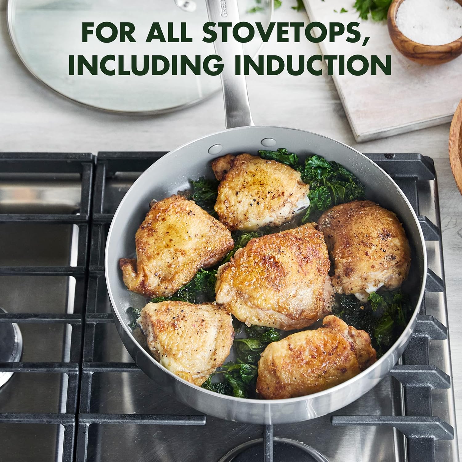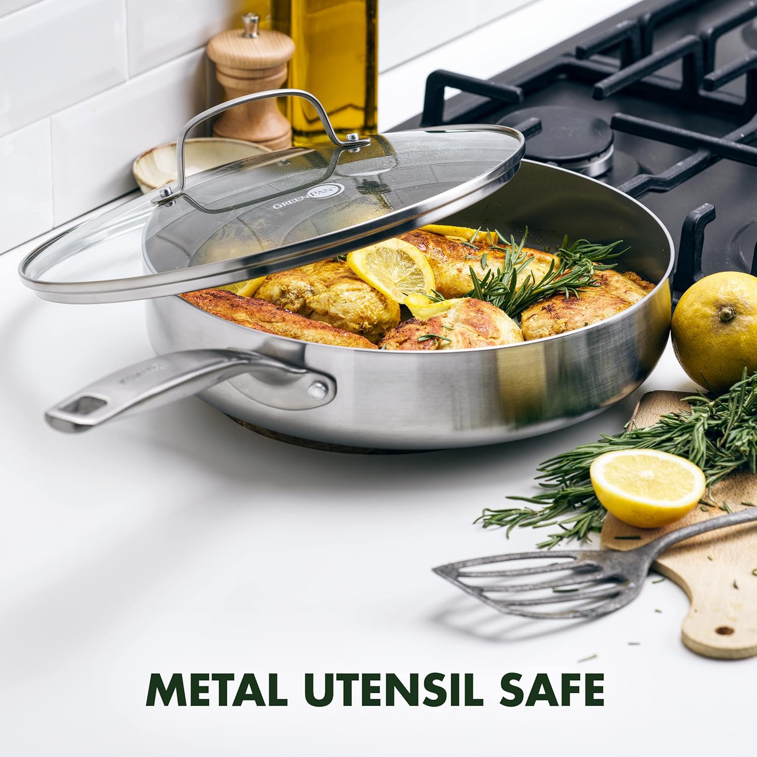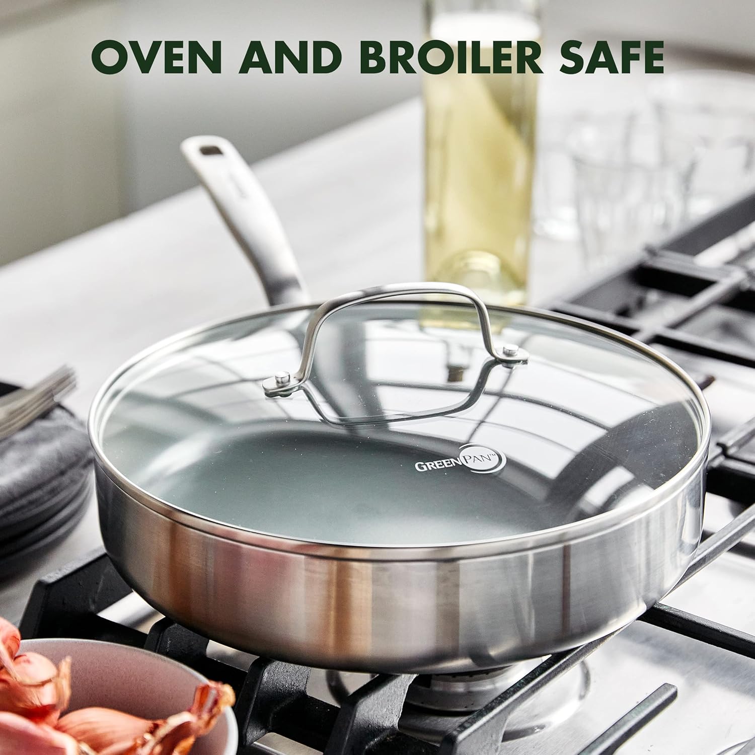 GreenPan Chatham Tri-Ply Stainless Steel Healthy Ceramic Nonstick 3.75QT Saute Pan Jumbo Cooker with Lid, PFAS-Free, Multi Clad, Induction, Dishwasher Safe, Oven Safe, Silver
