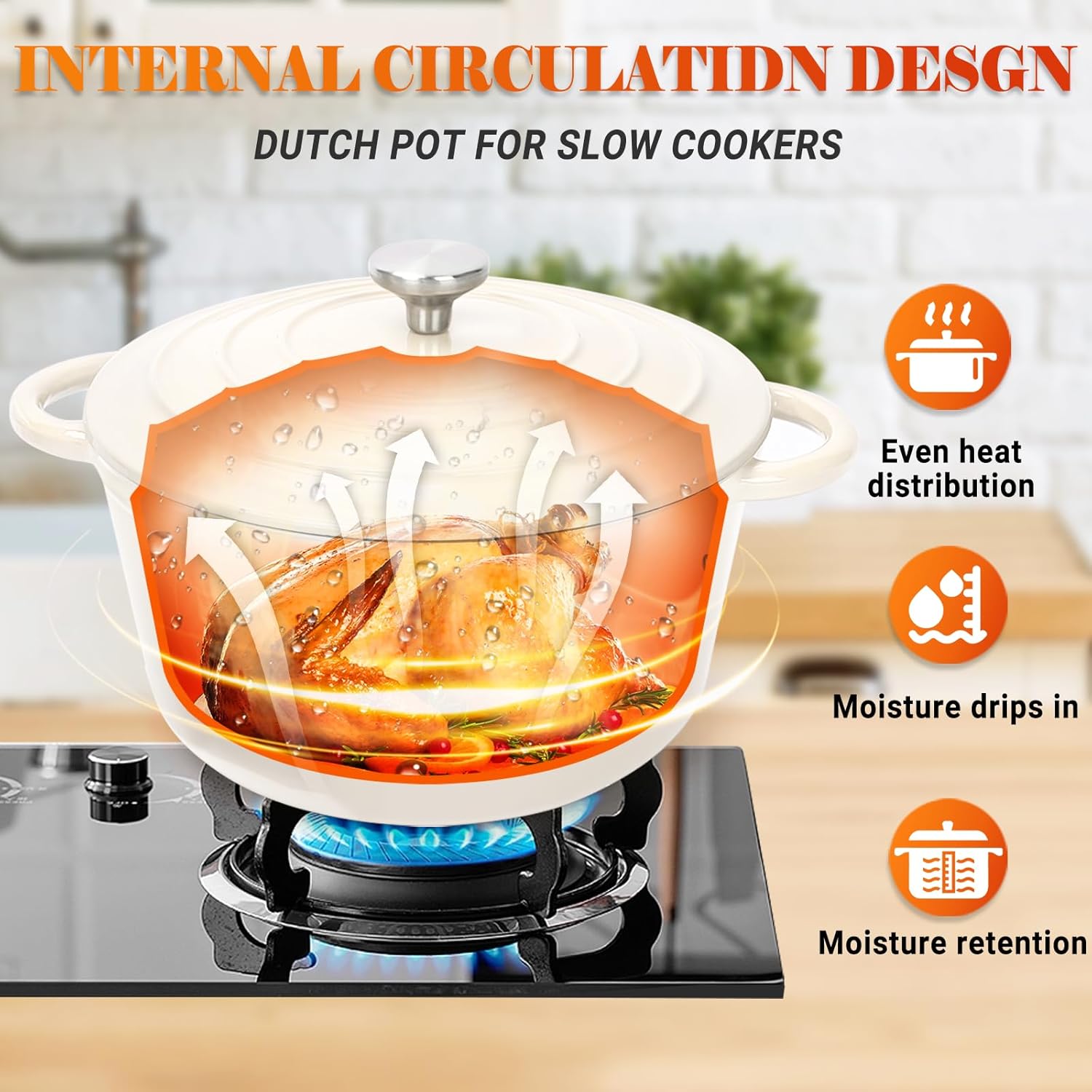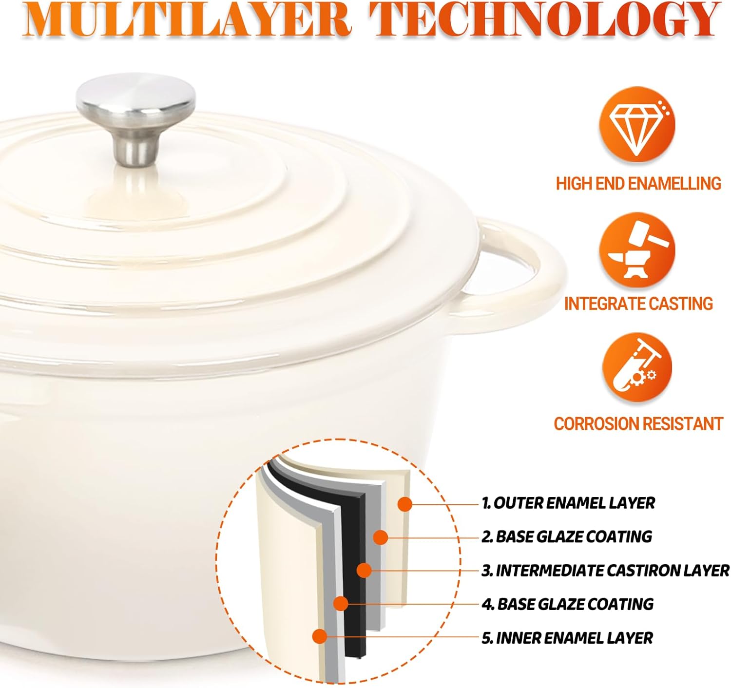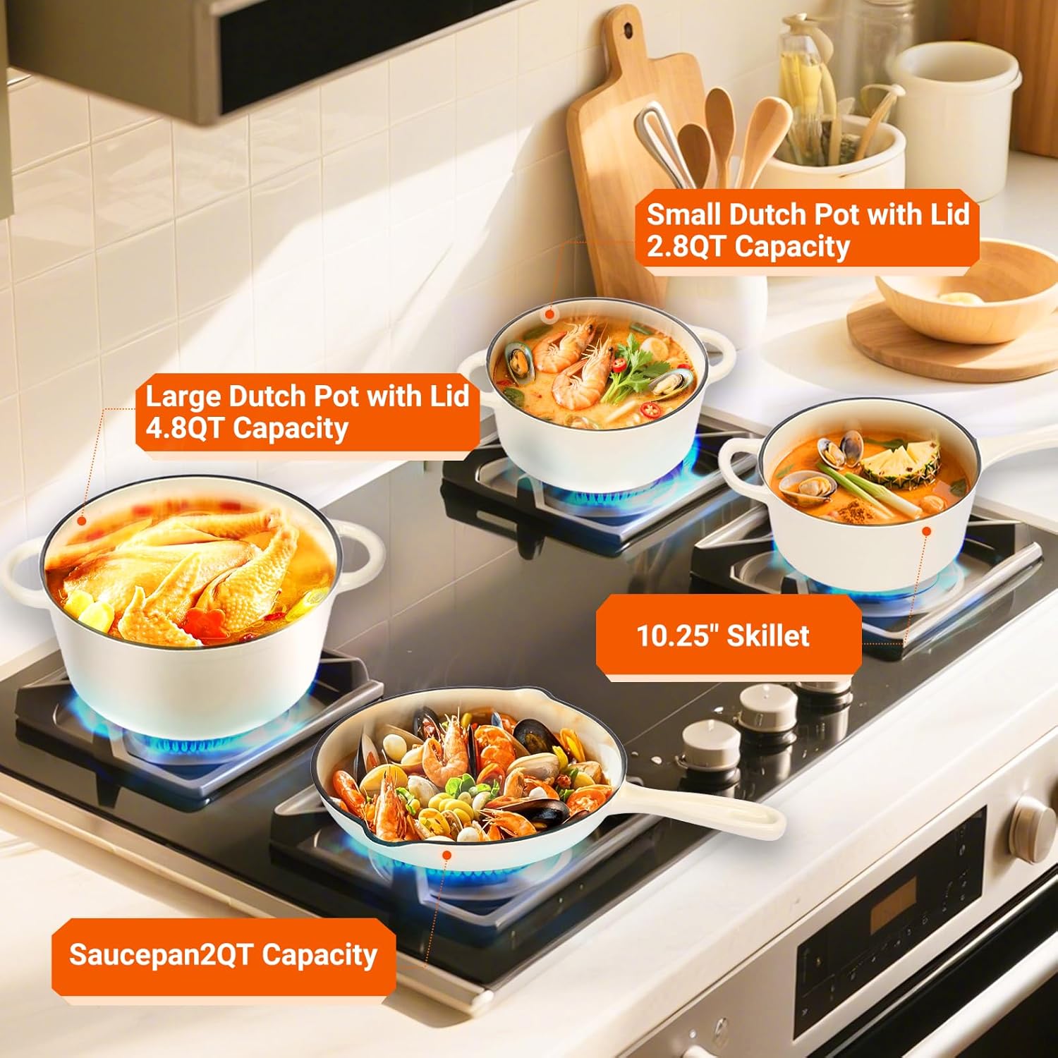 Ceramic Coated Cast Iron Cookware Set, 7-Piece Enameled Dutch Oven and Skillet Set with Lids, Nonstick Pots and Pans Set for Bread Baking, Oven Safe, Induction Compatible, PFAS-Free (Cream White)