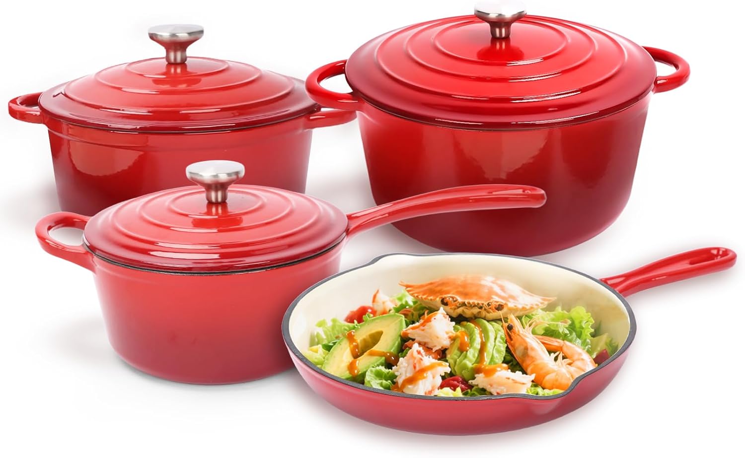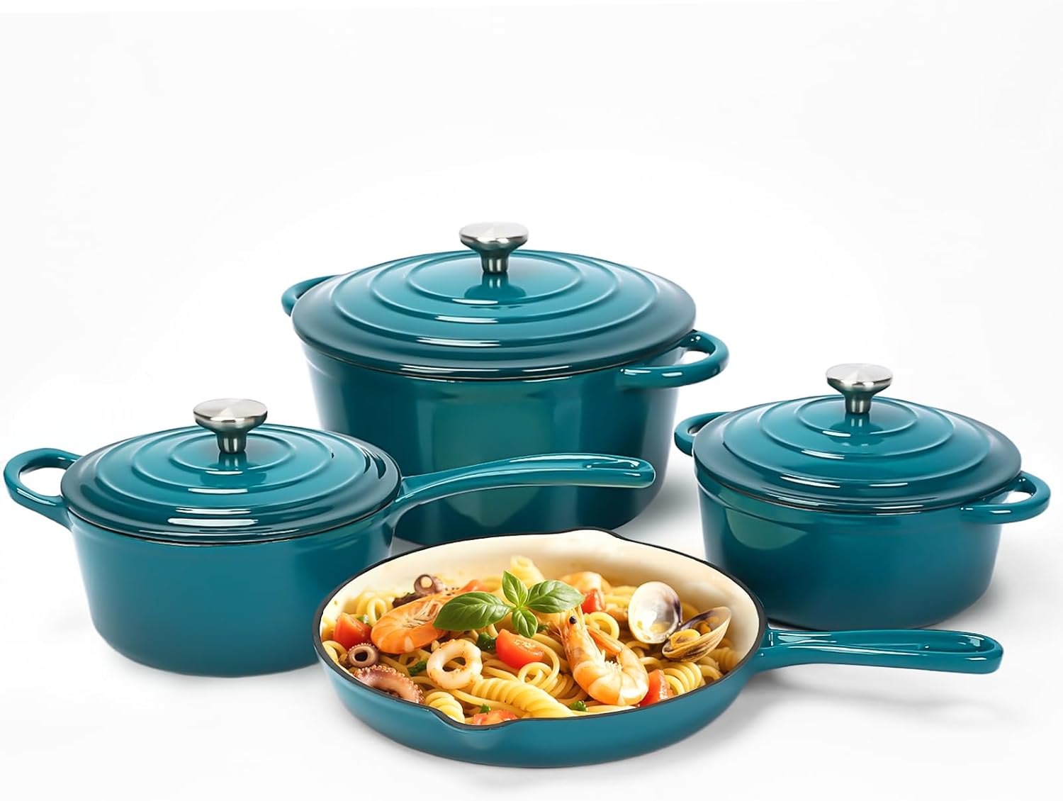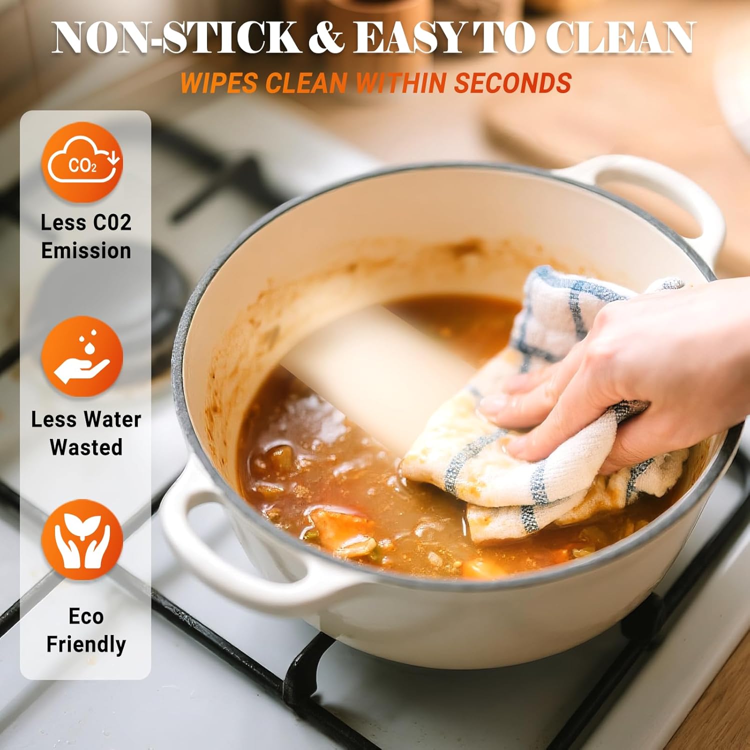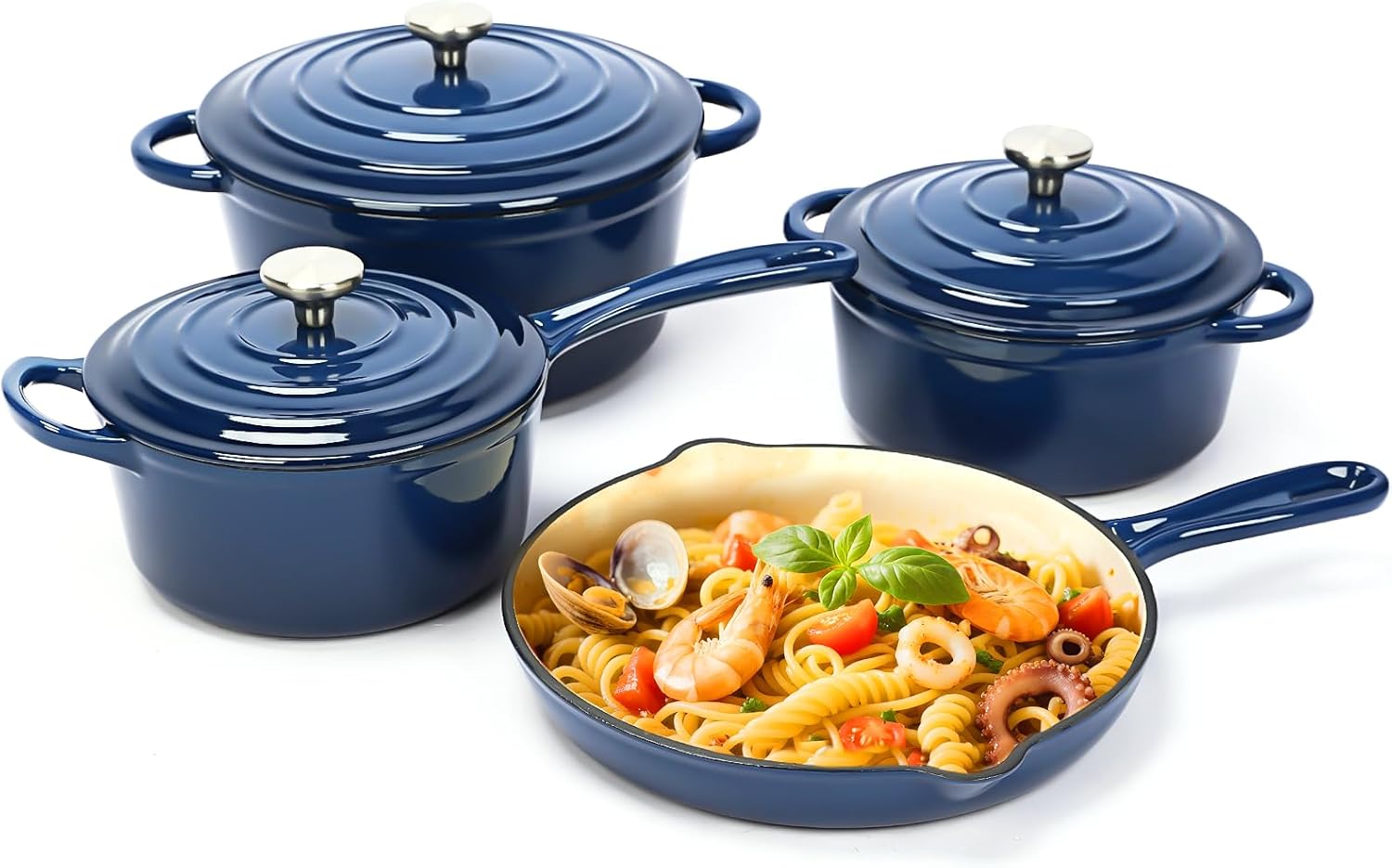 Ceramic Coated Cast Iron Cookware Set, 7-Piece Enameled Dutch Oven and Skillet Set with Lids, Nonstick Pots and Pans Set for Bread Baking, Oven Safe, Induction Compatible, PFAS-Free (Cream White)