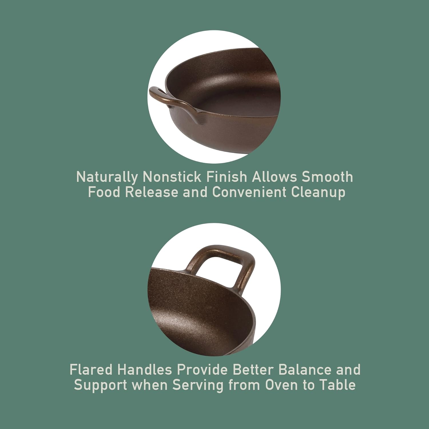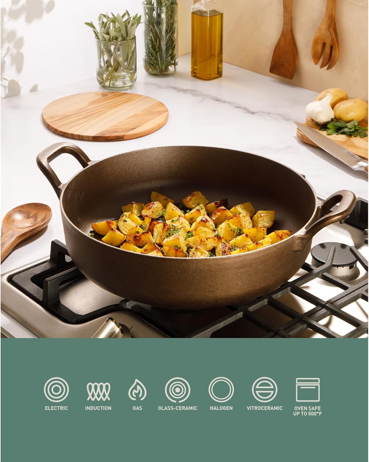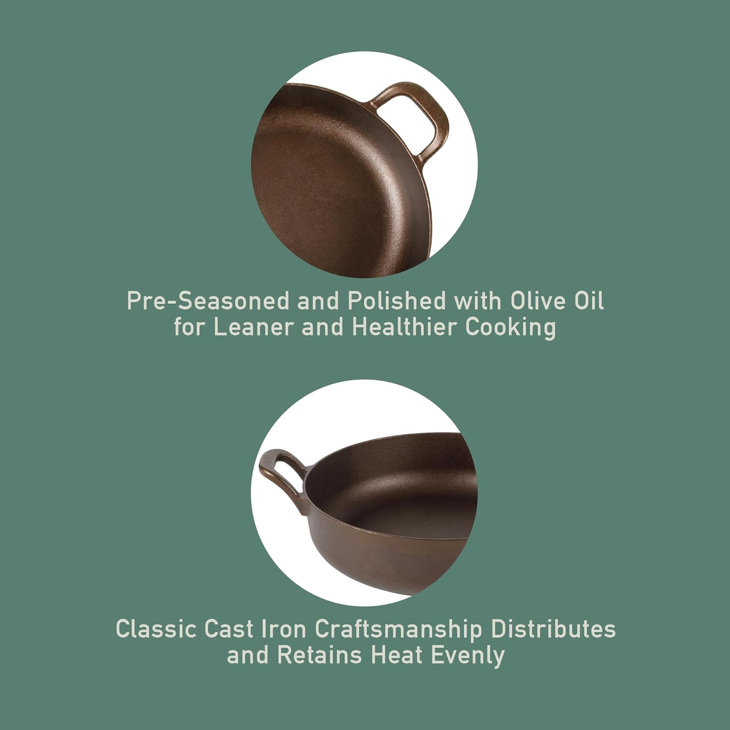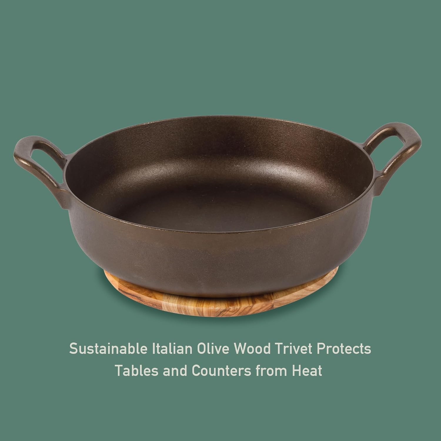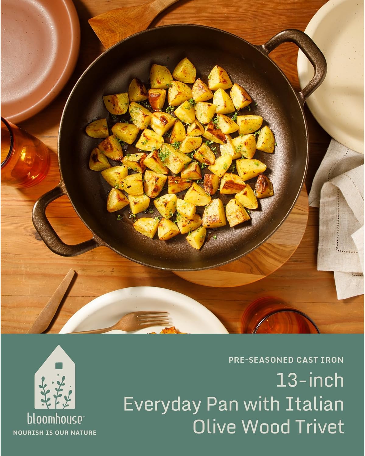 Bloomhouse Natural Bronze Finish 13-Inch Round Cast Iron Everyday Pan – Olive Oil Treated Cooking Surface with Dual Handles & Olive Wood Trivet, Oven, Stovetop & Campfire Safe