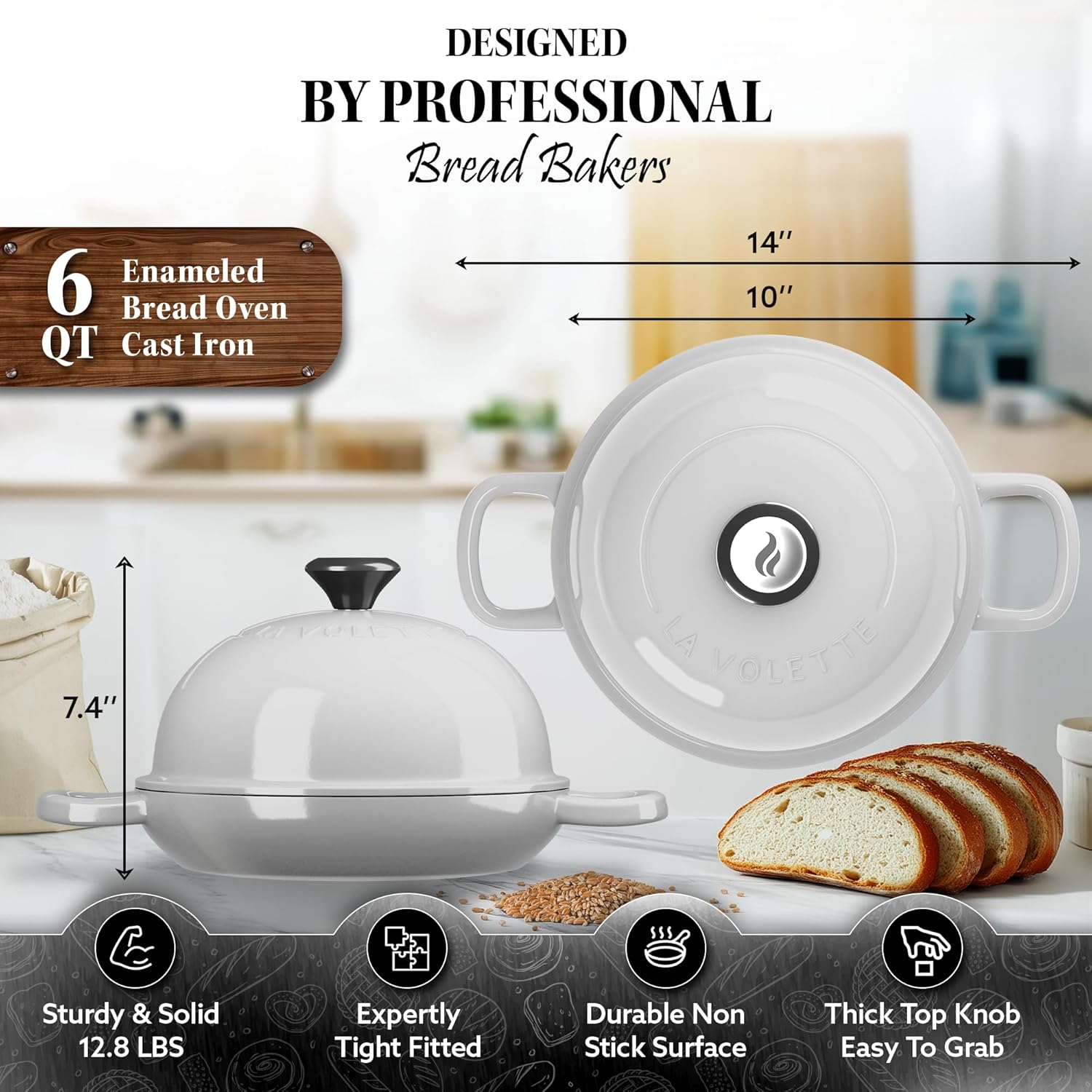 Enameled Cast Iron Bread Pan With Lid 9 Piece Complete Bread Baking Set | Dutch Oven for Bread Baking | 10 Inch Bread Oven with Lid | Thick Enamel | Silicone Baking Mat | Banneton | 6 Quart (white)