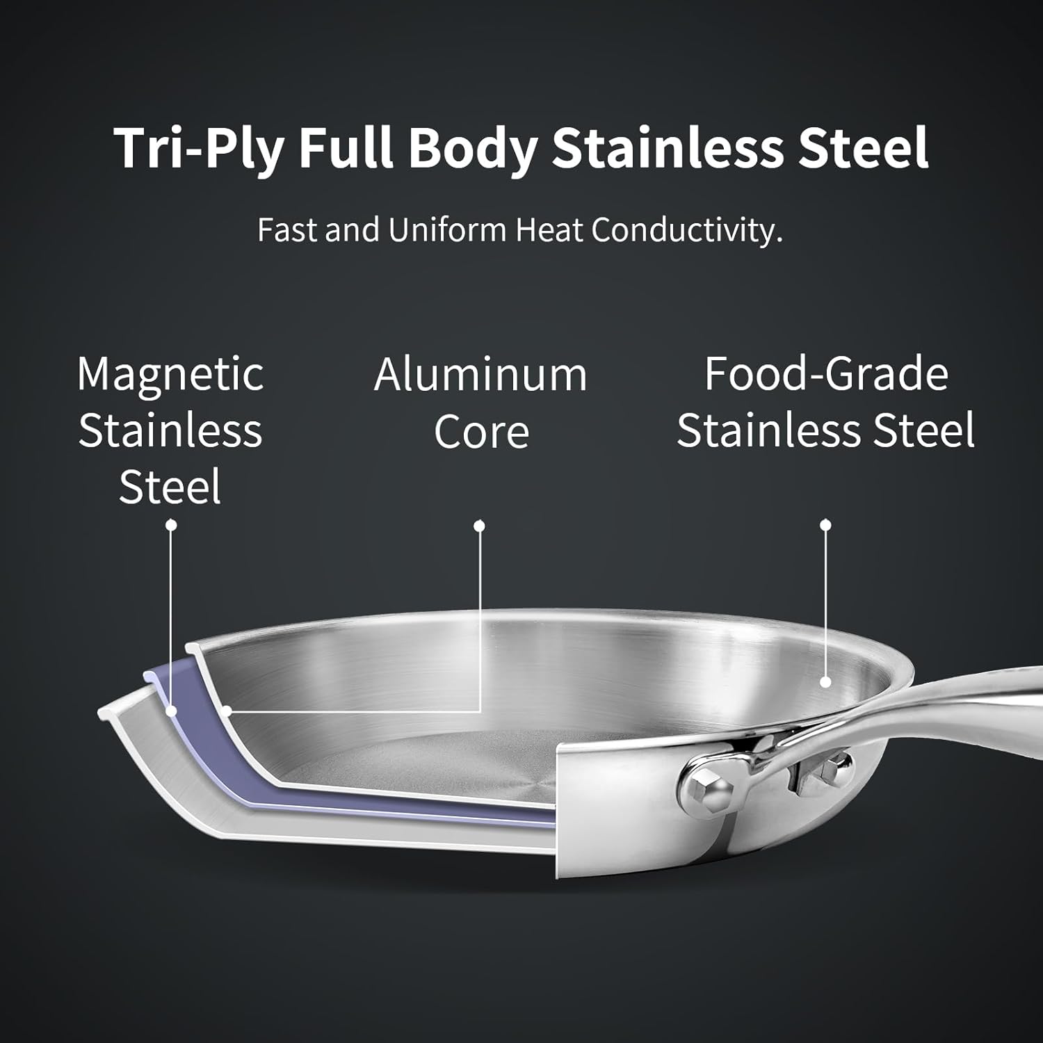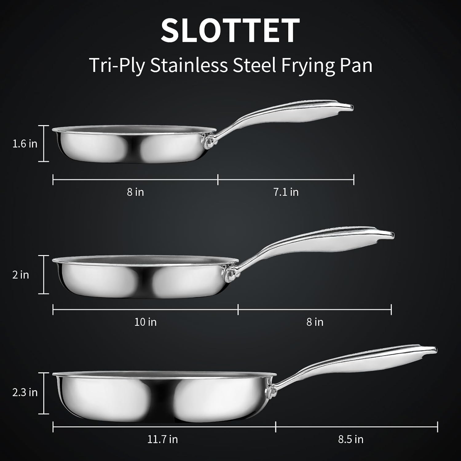 8-10-11.5inch Frying Pan Set Tri-Ply Stainless Steel Skillet Set,No Coatings Frying Pan with Stay-cool Handle for Cooking,Pots and Pans Set,Dishwasher and Oven Safe