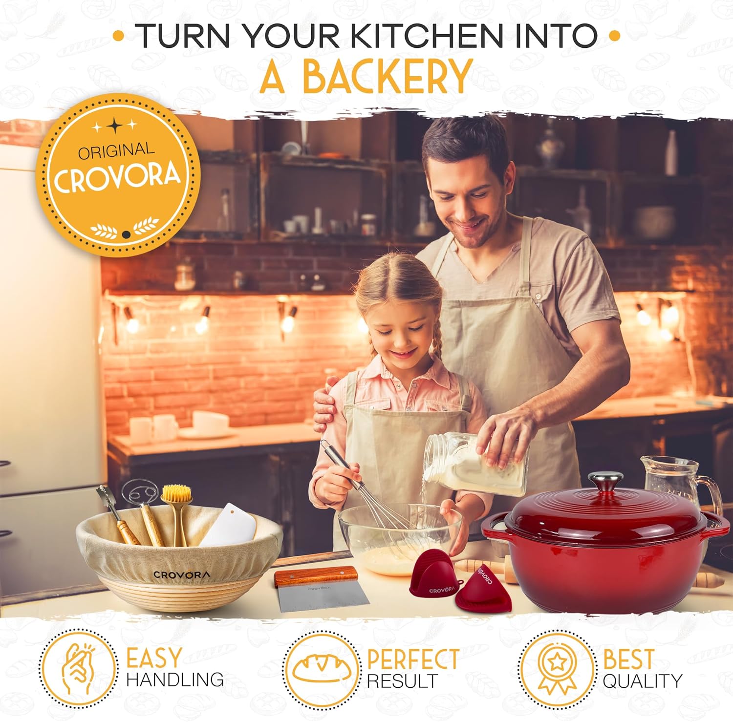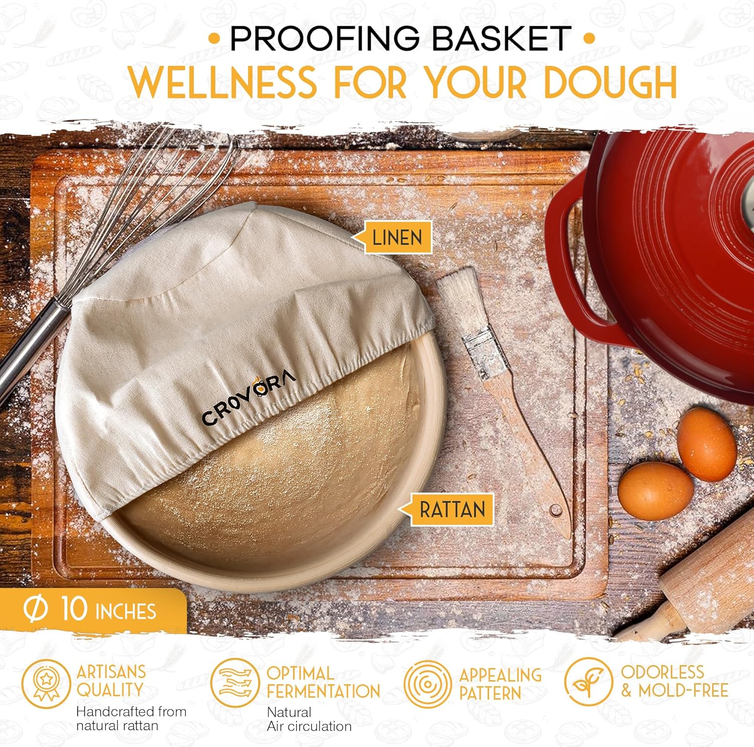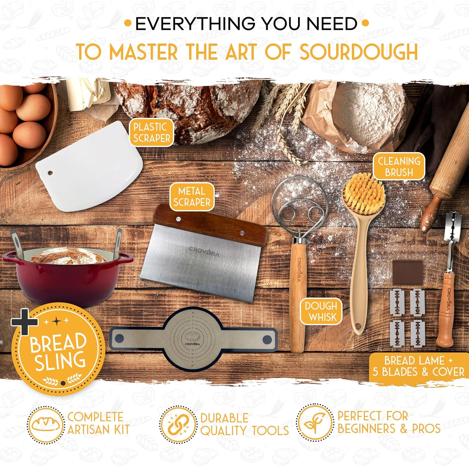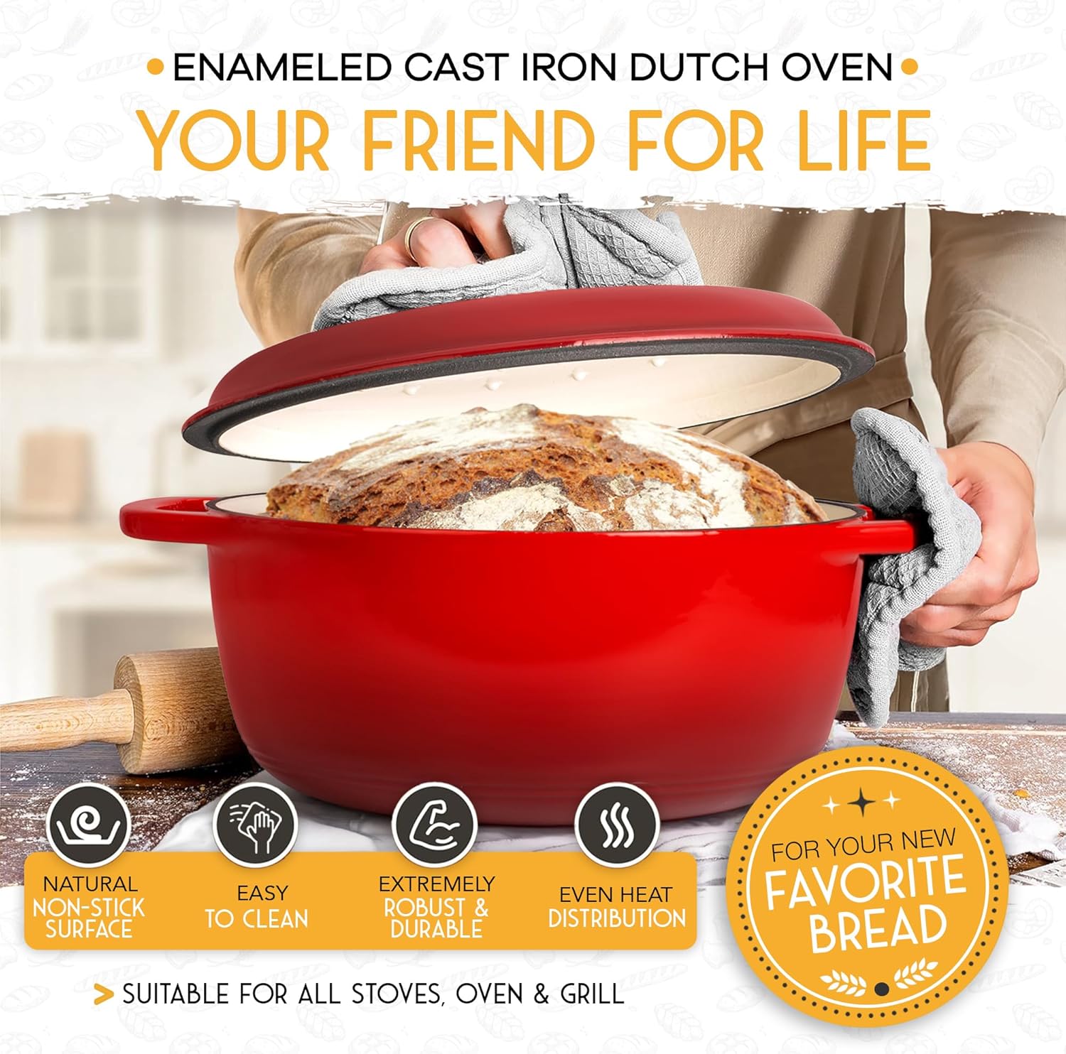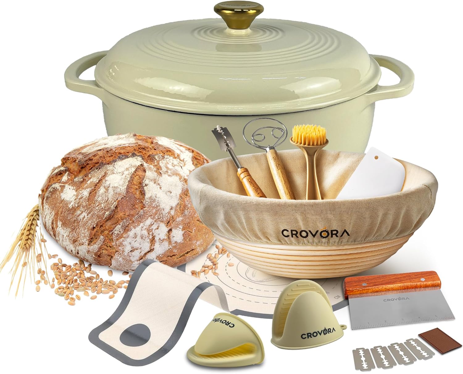 6 QT Enameled Cast Iron Dutch Oven for Bread Baking with Lid - Incl. Sourdough Bread Baking Supplies like Banneton Bread Proofing Basket, Cast Iron Bread Oven, Bread Pan, bread making tools