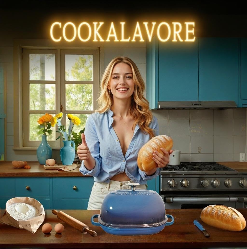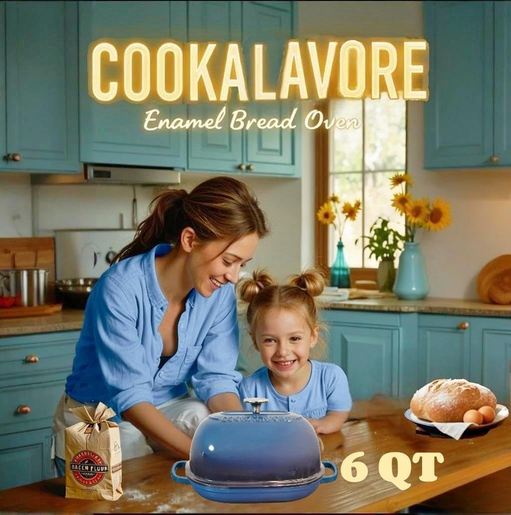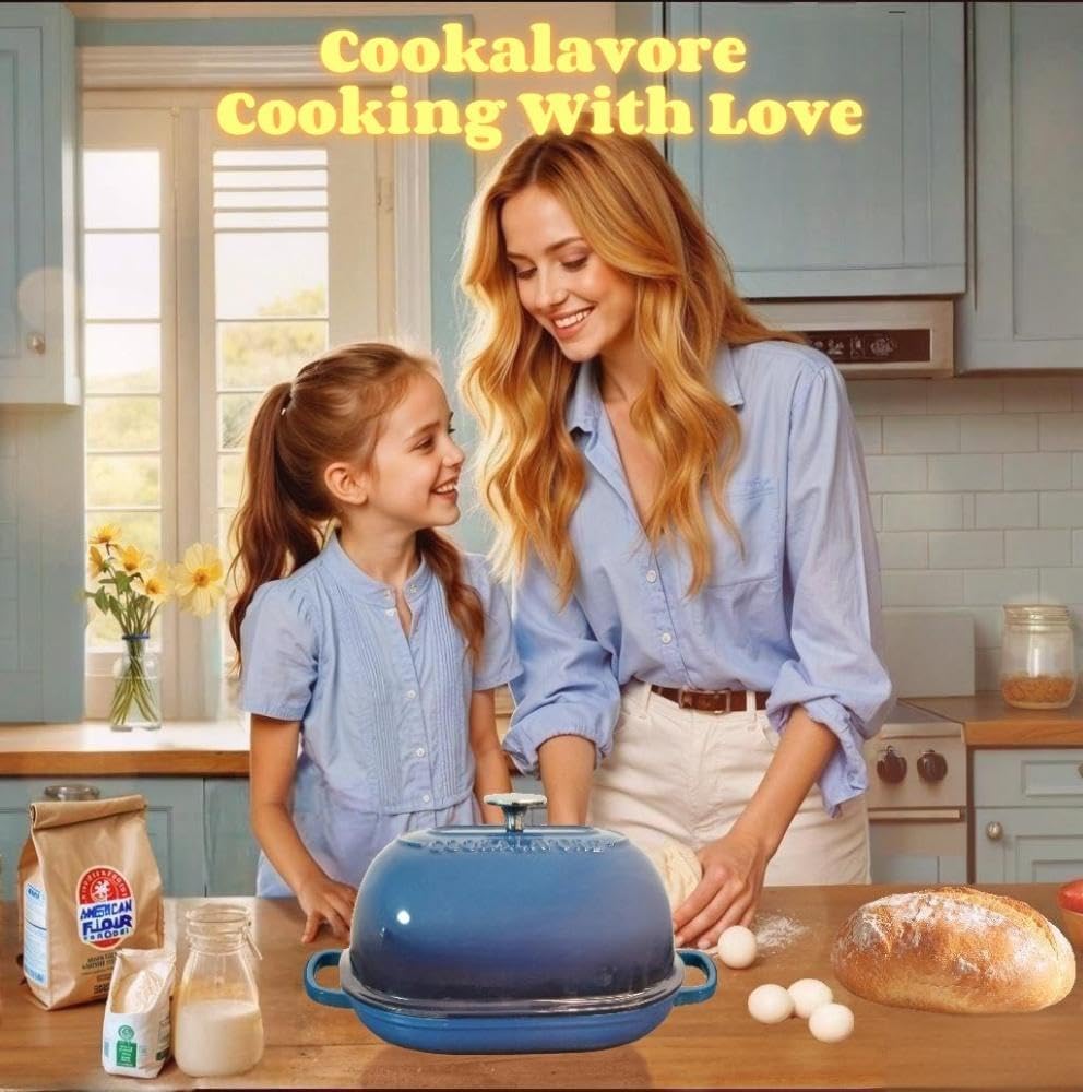 Cast Iron Bread Oven,6 QT Bread Oven,Thick Enameled Loaf Pan with Lid,Bread Pans for Homemade Bread,14.5"Dutch Oven for Bread Baking,Dutch Oven-with Silicone Baking Mat&Recipe,Gifts for Family,Blue