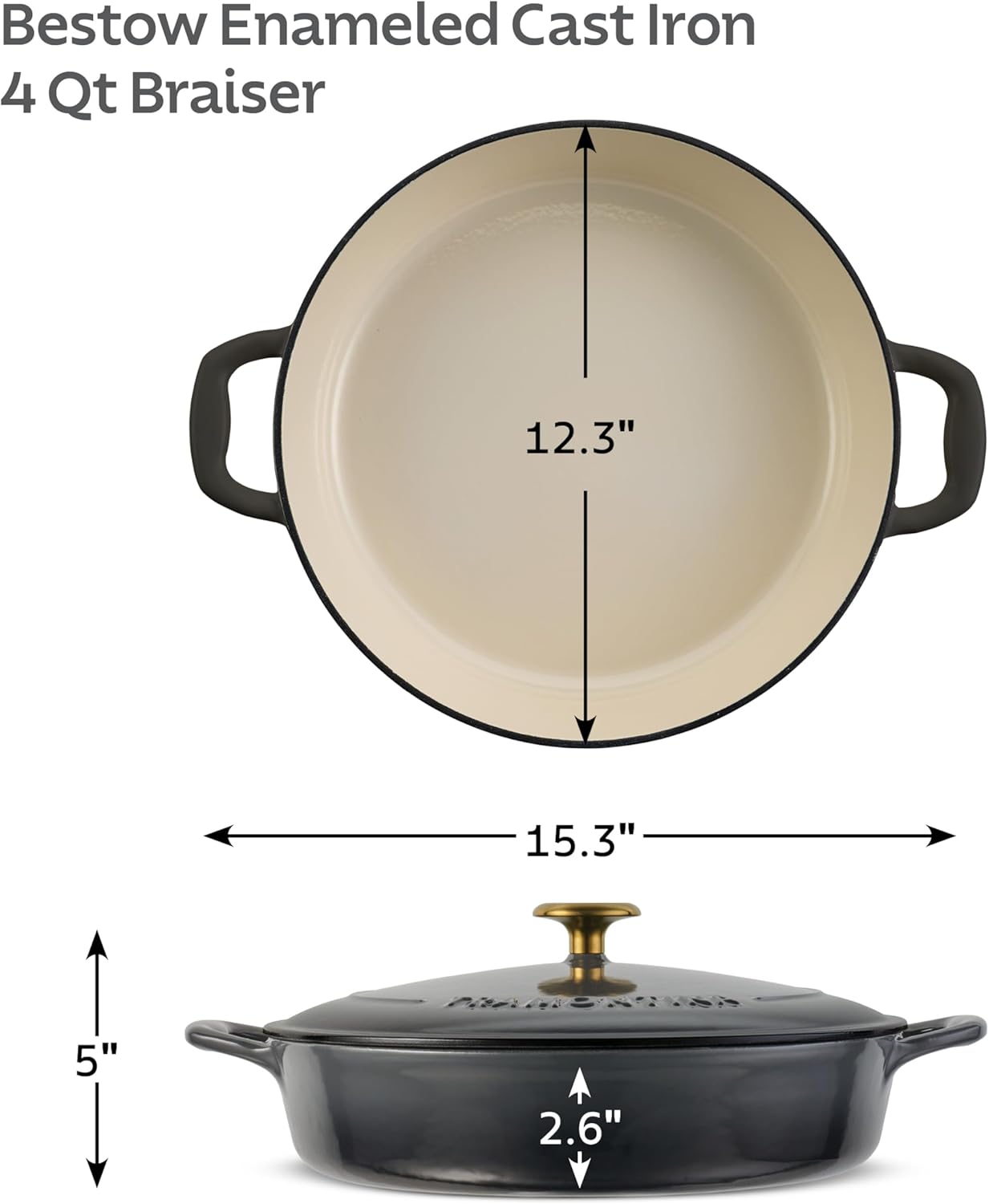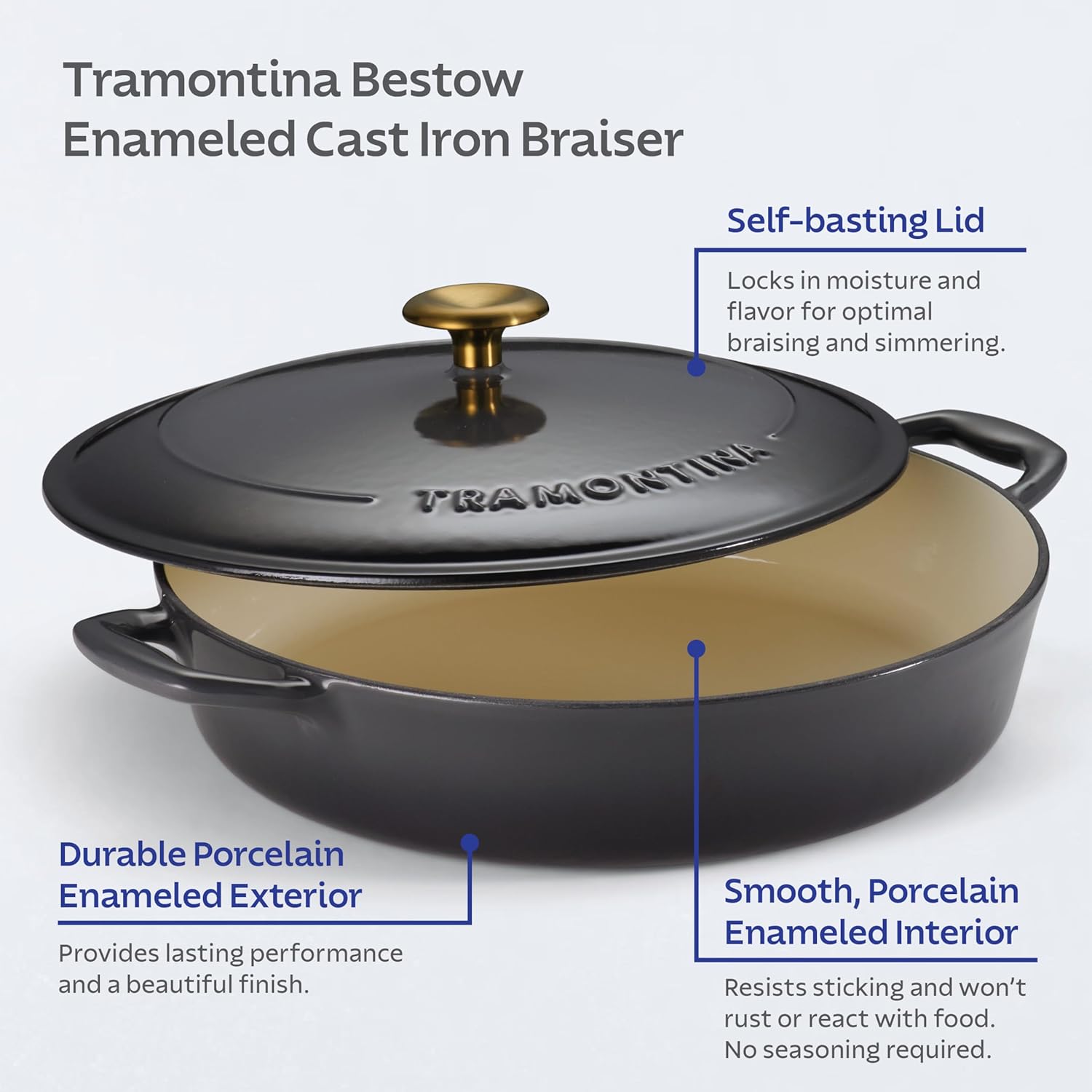 Tramontina Bestow Enameled Cast Iron Braiser Pan with Lid, 4-quart, Smoke with Gold Knob