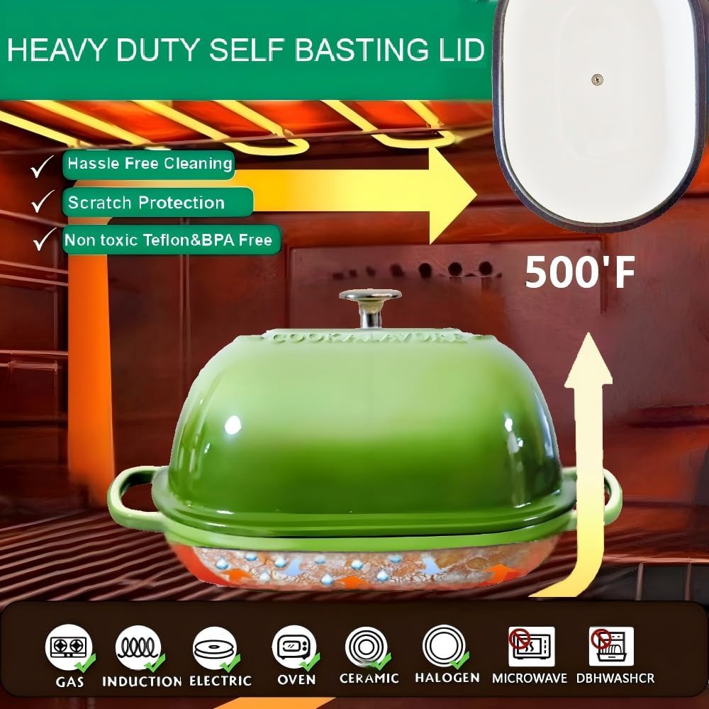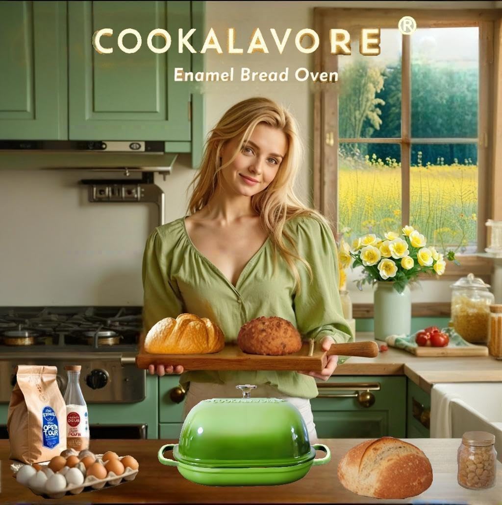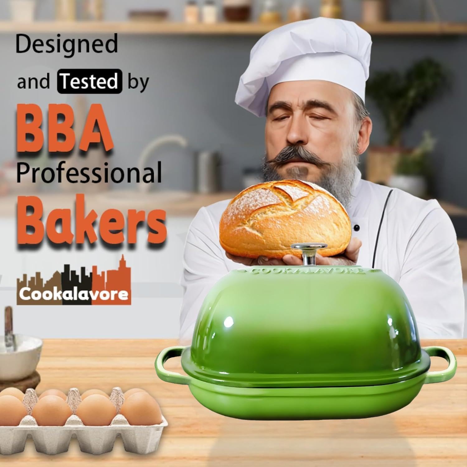 Cast Iron Bread Oven,6 QT Bread Oven,Thick Enameled Loaf Pan with Lid,Bread Pans for Homemade Bread,14.5"Dutch Oven for Bread Baking,Dutch Oven-with Silicone Baking Mat&Recipe,Gifts for Family,Green