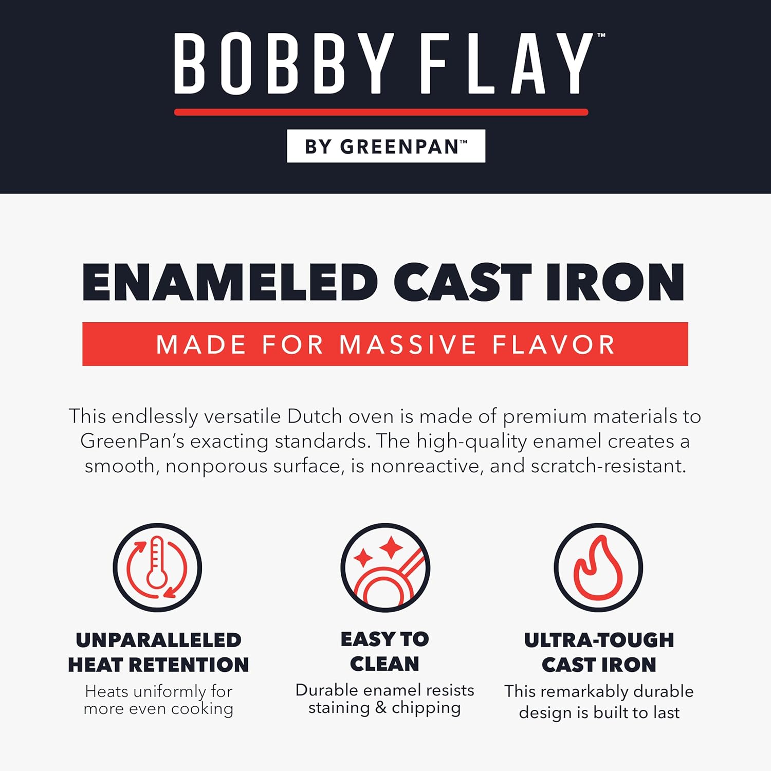 GreenPan x Bobby Flay 5.5QT Enameled Cast Iron Round Dutch Oven with Lid, Dual Handles, Oven Safe to 500F & Induction Suitable, Self Basting Lid, Ultra-Durable, Sear, Braising, Bread, Stews, Cobalt