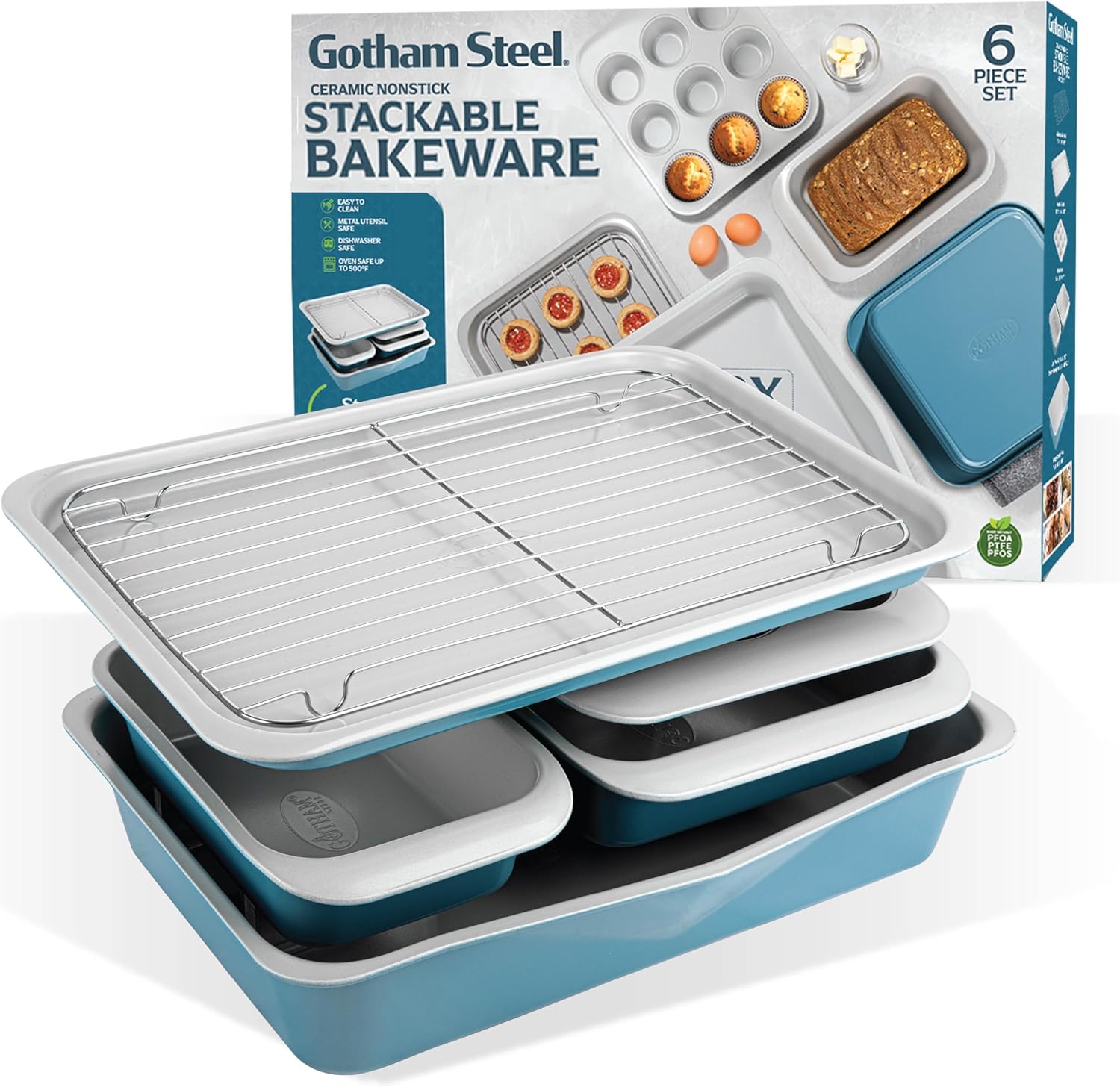 Gotham Steel 6 Pc Stackable Baking Pans Set, 70% Space Saving Design, Ceramic Bakeware Sets Non Toxic Made Without PFOA PFOS, with Baking Sheet Tray, Cake & Muffin Pans, Oven & Dishwasher Safe