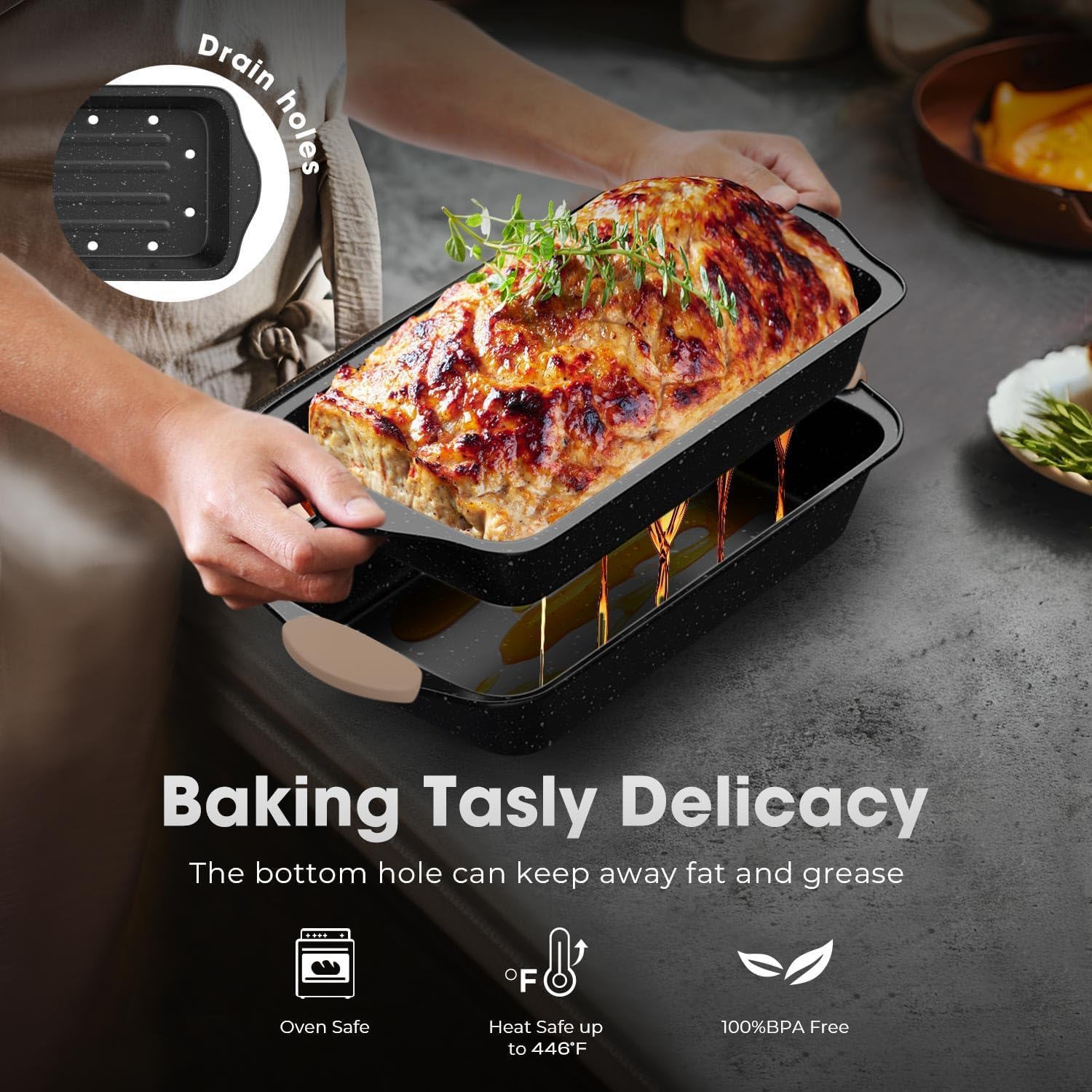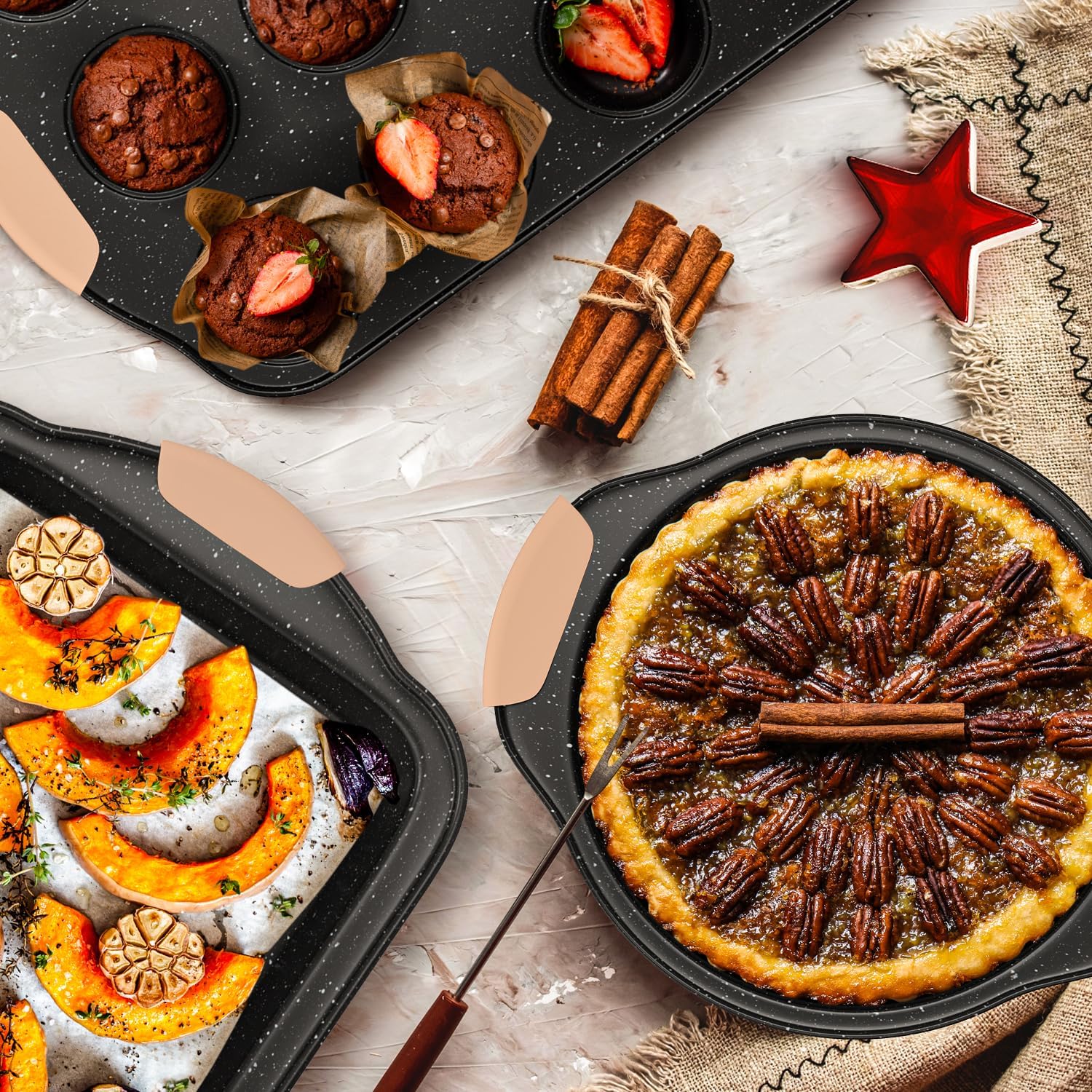 11-Piece Baking Pans Set, Nonstick Bakeware Sets, Oven Pans for Baking with Silicone Handles, Includes Cookie Sheet, Cake Pans, Loaf Pan, Pizza Pan, Muffin Pan, Khaki&Black