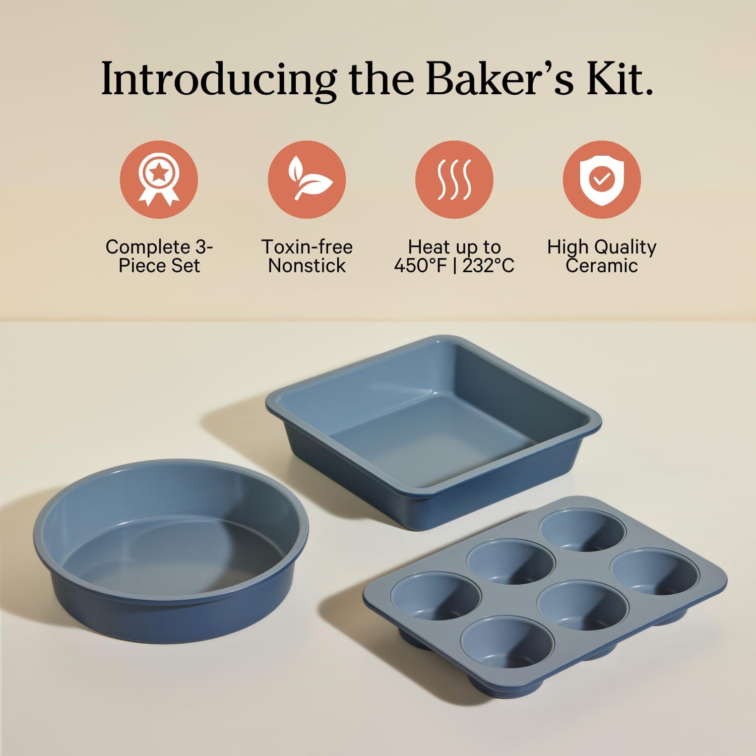 Our Place Wonder Oven Baker’s Kit – 3-Piece Toxin-Free Ceramic Nonstick Bakeware Set (8” Round, 8” Square, 6-Cup Muffin Pan) - Oven-Safe up to 450°F - Blue Salt