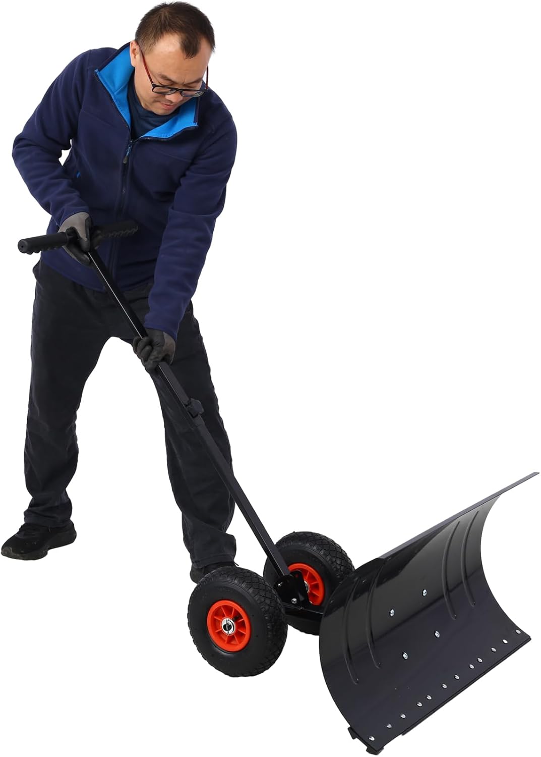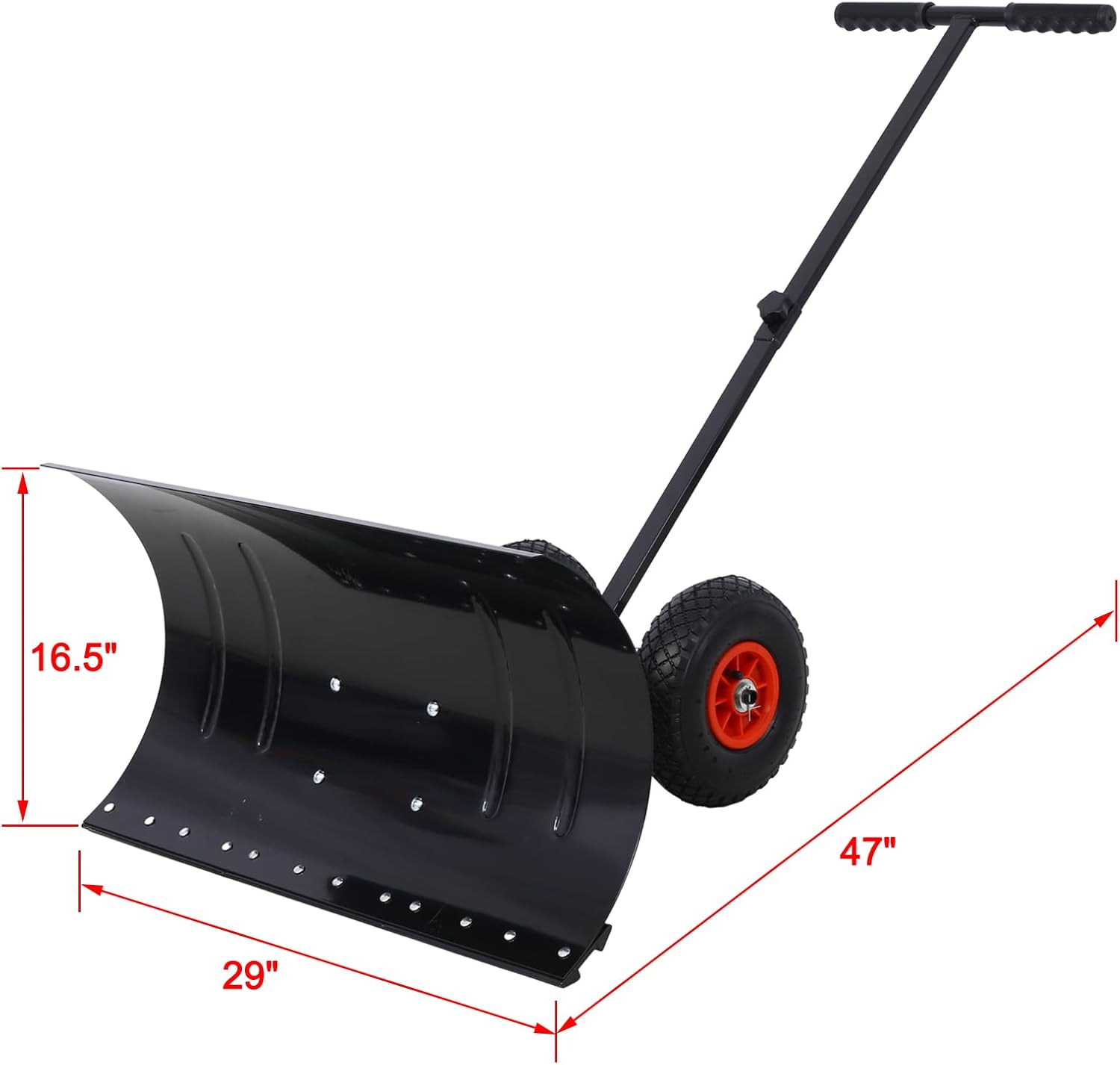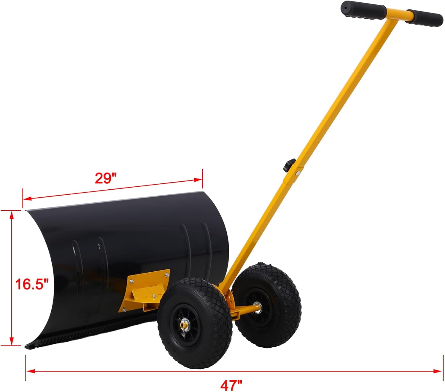 29" Heavy-Duty Snow Pusher Shovel with Wheels | 5-Angle Adjustable Cushioned Handle & 10" Anti-Skid Wheels | Ultimate Snow Removal Tool for Driveways (Snow Plow Shovel & Push Snow Shovel) (Yellow)