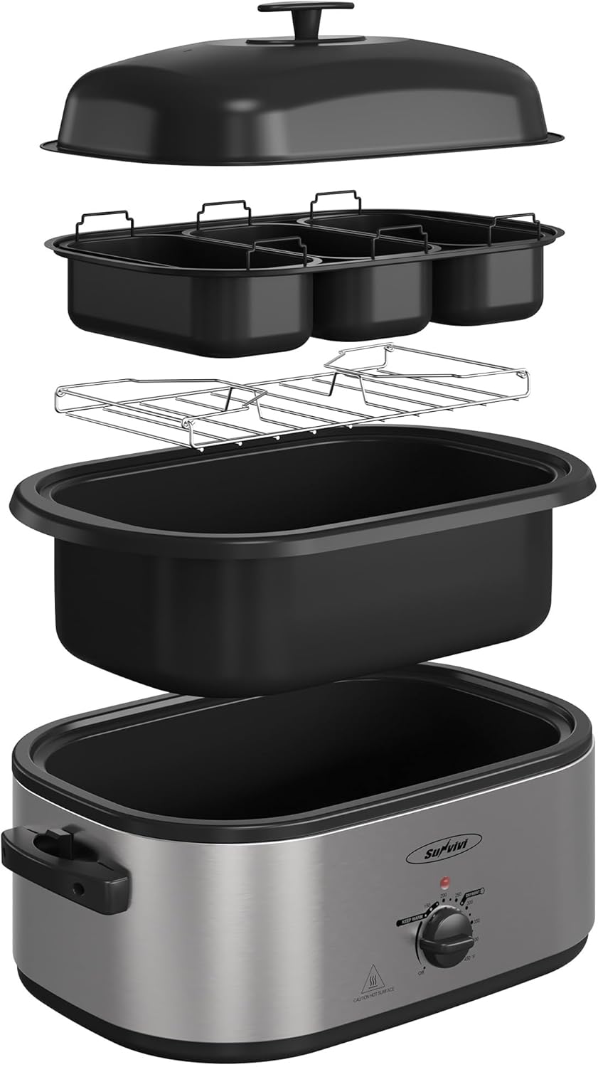 Sunvivi Electric Roaster Oven, 24 QT Turkey Roaster Oven with 3 Bin Buffet Server, 150-450F Full-Range Temperature Control, Removable Pan & Rack, Stainless Steel, Silver