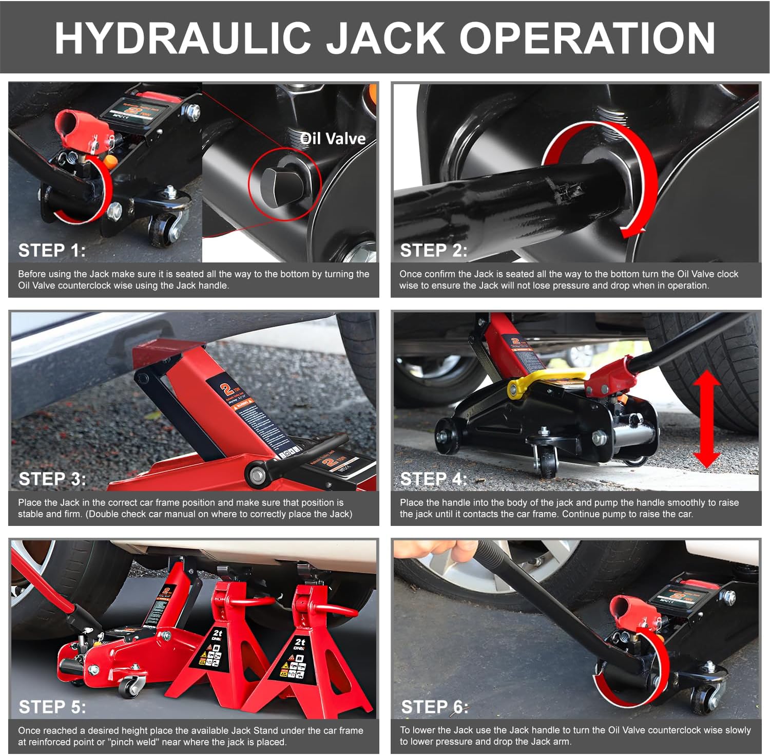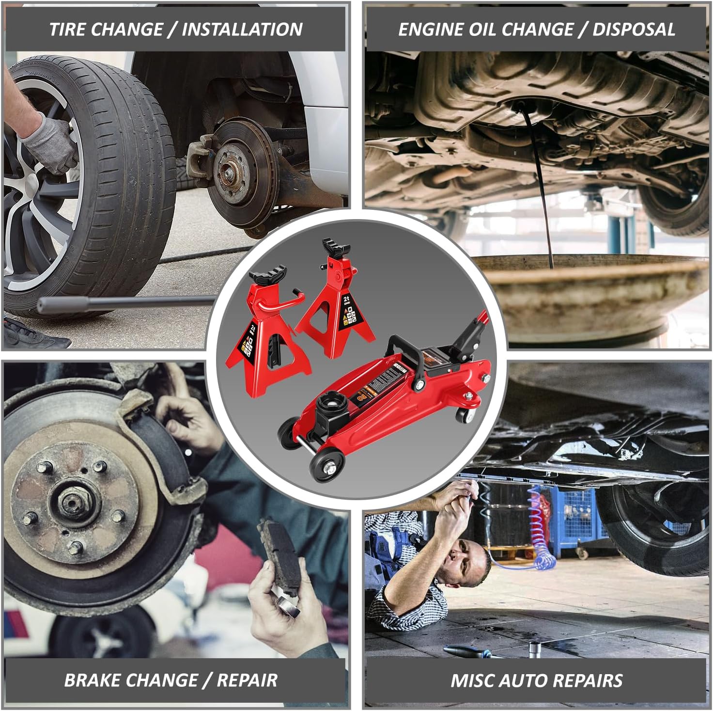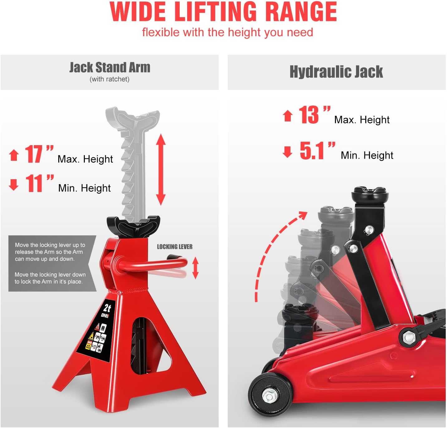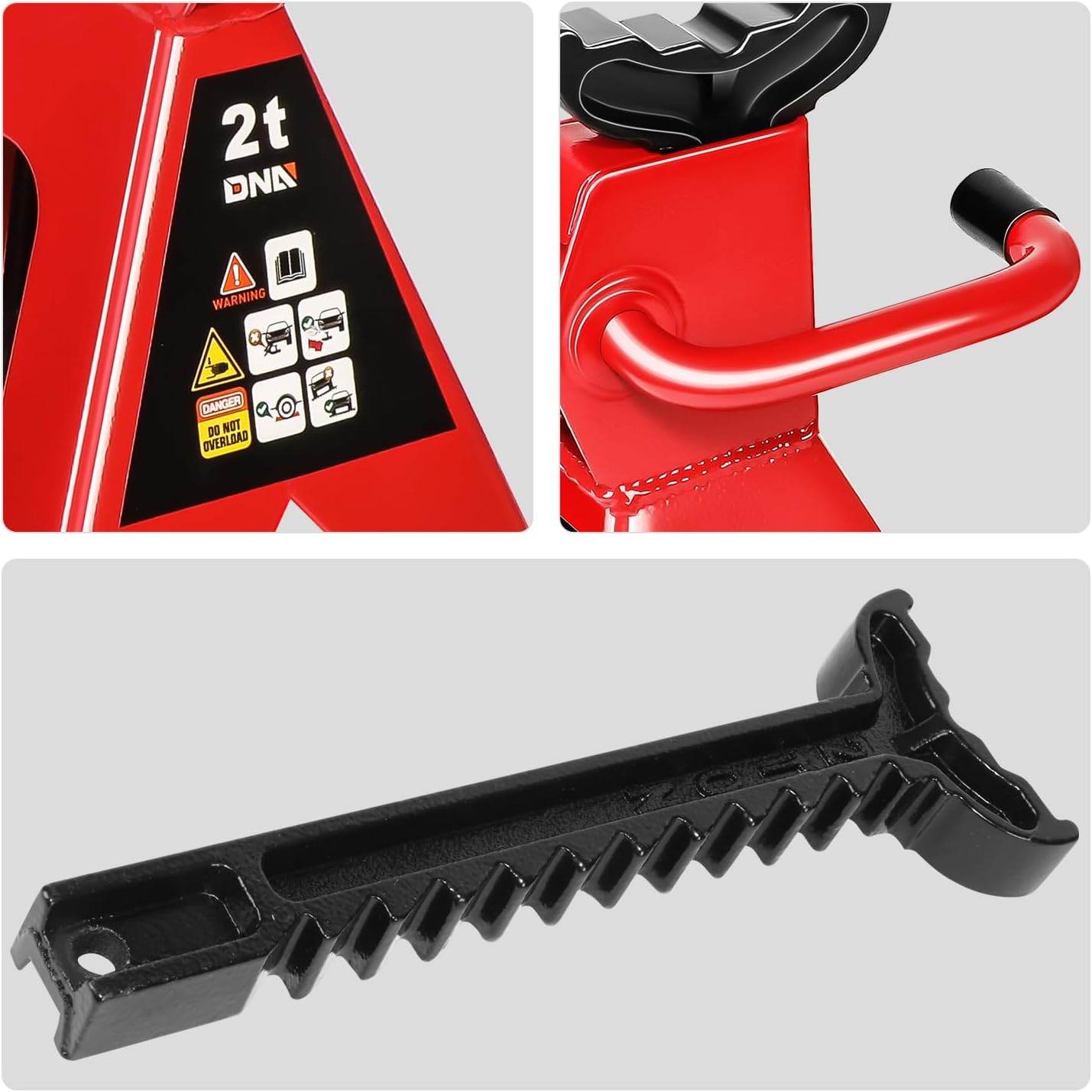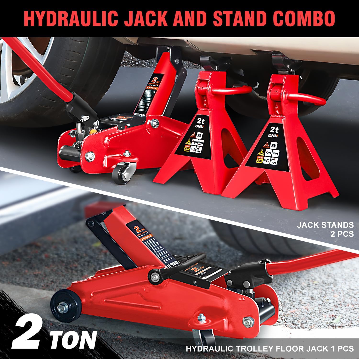 DNA MOTORING Low Profile Hydraulic Trolley Service/Floor Jack Combo with 2 Ratchet Jack Stands, 2 Ton (4000 lbs) Capacity, Red/Black, TOOLS-00280