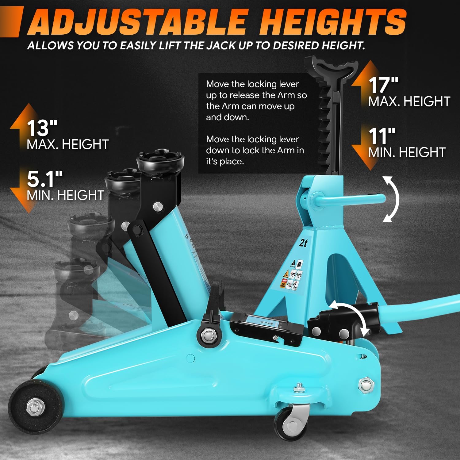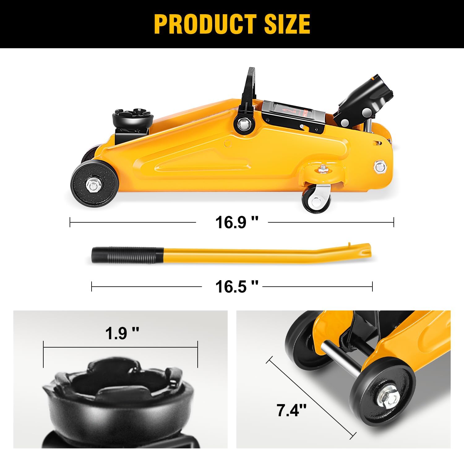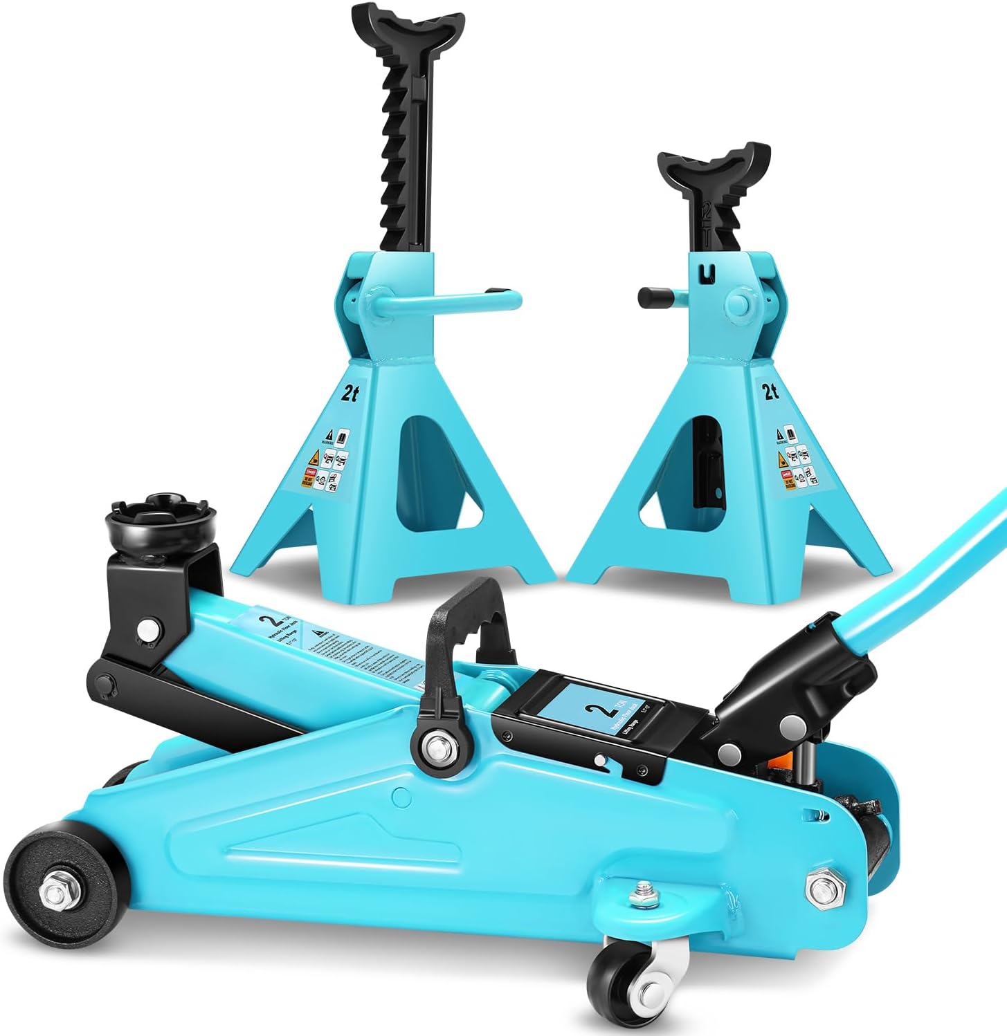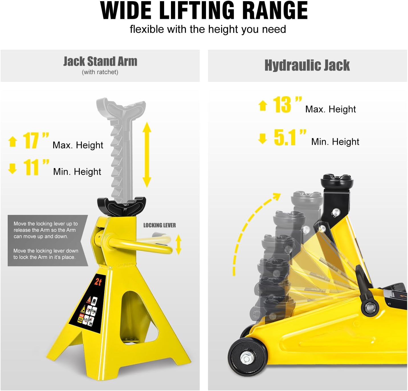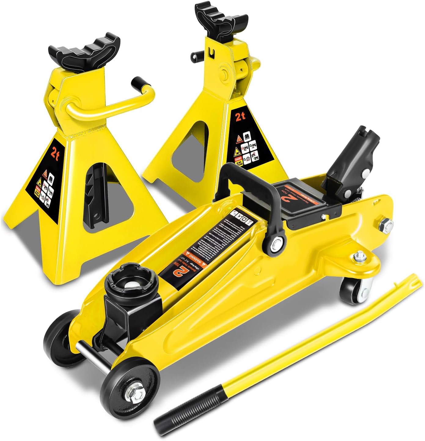 DNA MOTORING Low Profile Hydraulic Trolley Service/Floor Jack Combo with 2 Ratchet Jack Stands, 2 Ton (4000 lbs) Capacity, Red/Black, TOOLS-00280