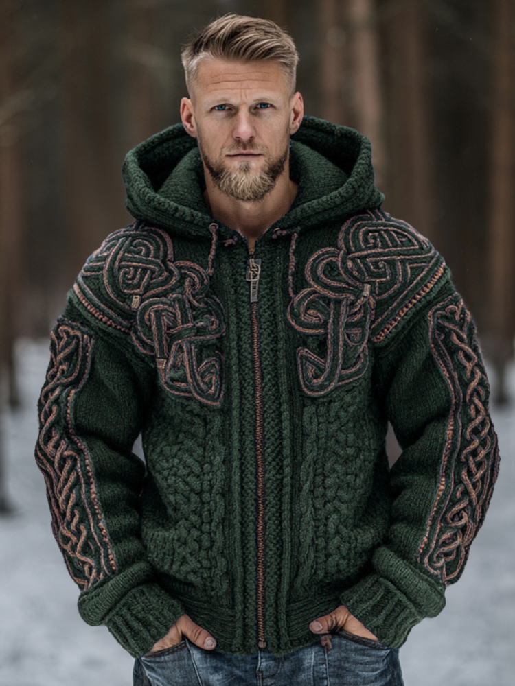 Men's Vintage Viking Celtic Knot Art Chunky Knit Hooded Zip-up Sweater